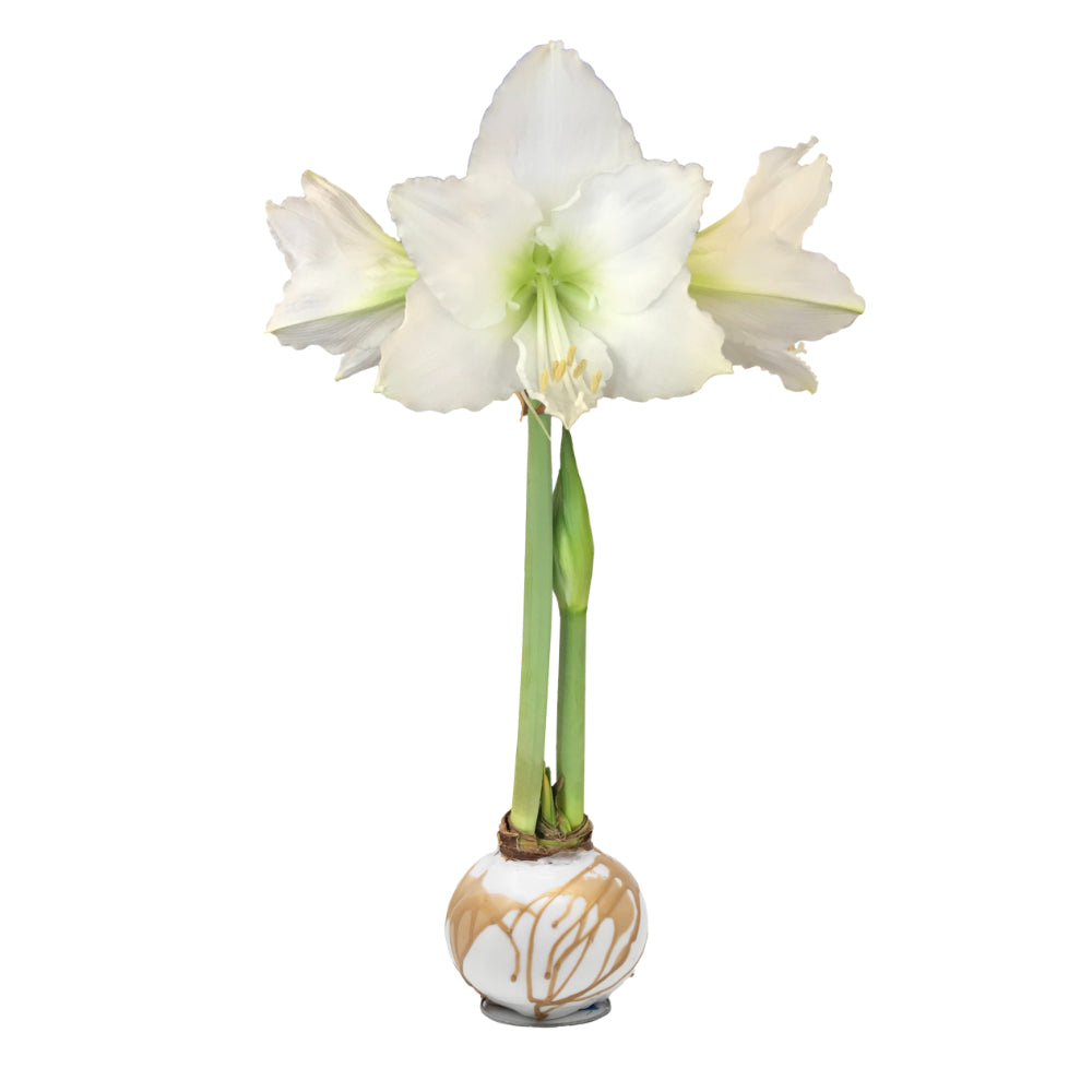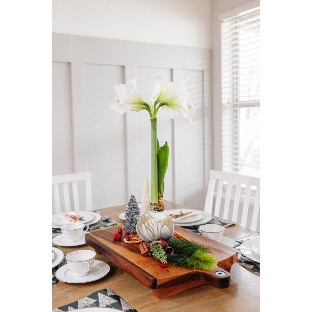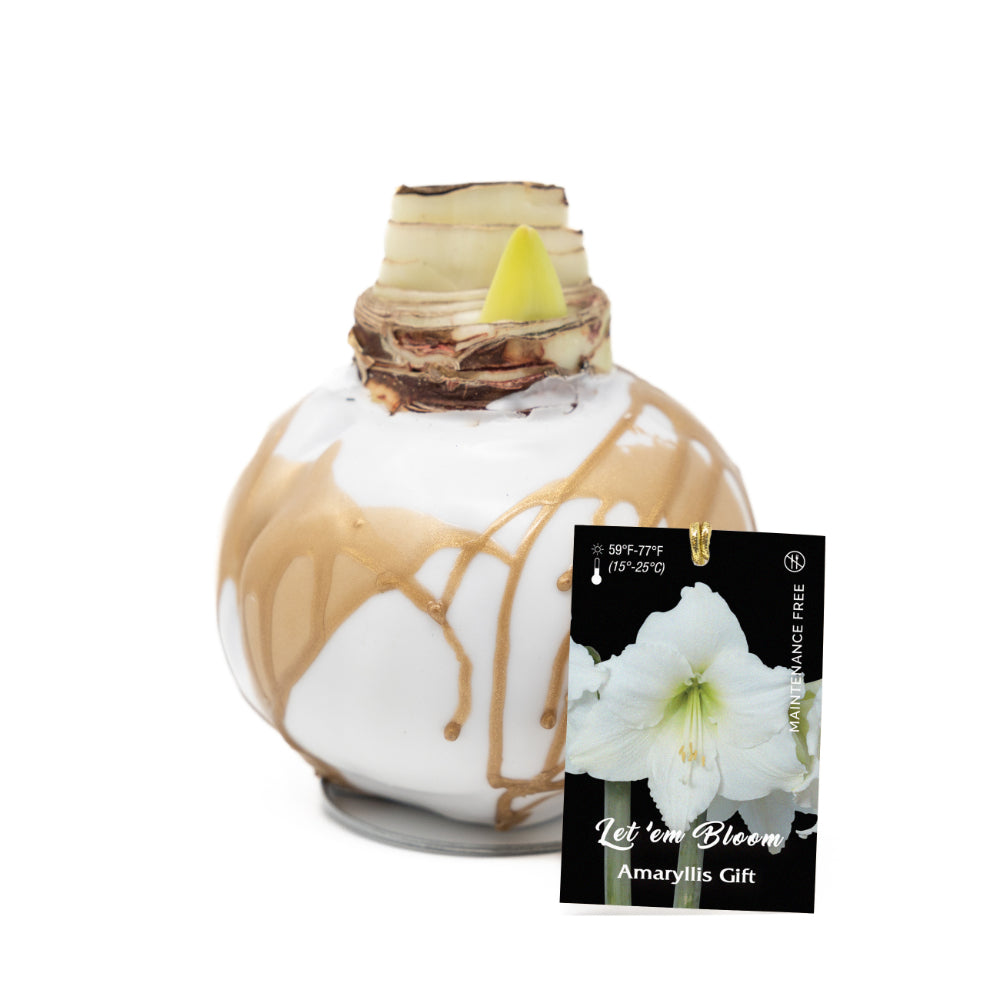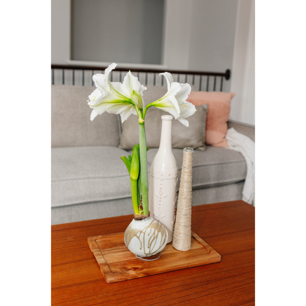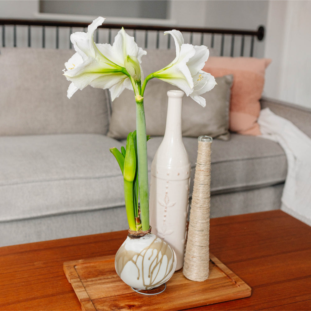 This amaryllis flower bulb is farmed in the coastal desert valleys of Peru, at the base of the Andes mountains, offering the ideal environment for growing the biggest and healthiest bulbs. This living bulb requires no watering or soil to experience its full blooming cycle—it’s activated by exposing it to temperatures maintained above 65° F. Simply arriving at a temperature-controlled home, office, or other space brings this bulb to life!