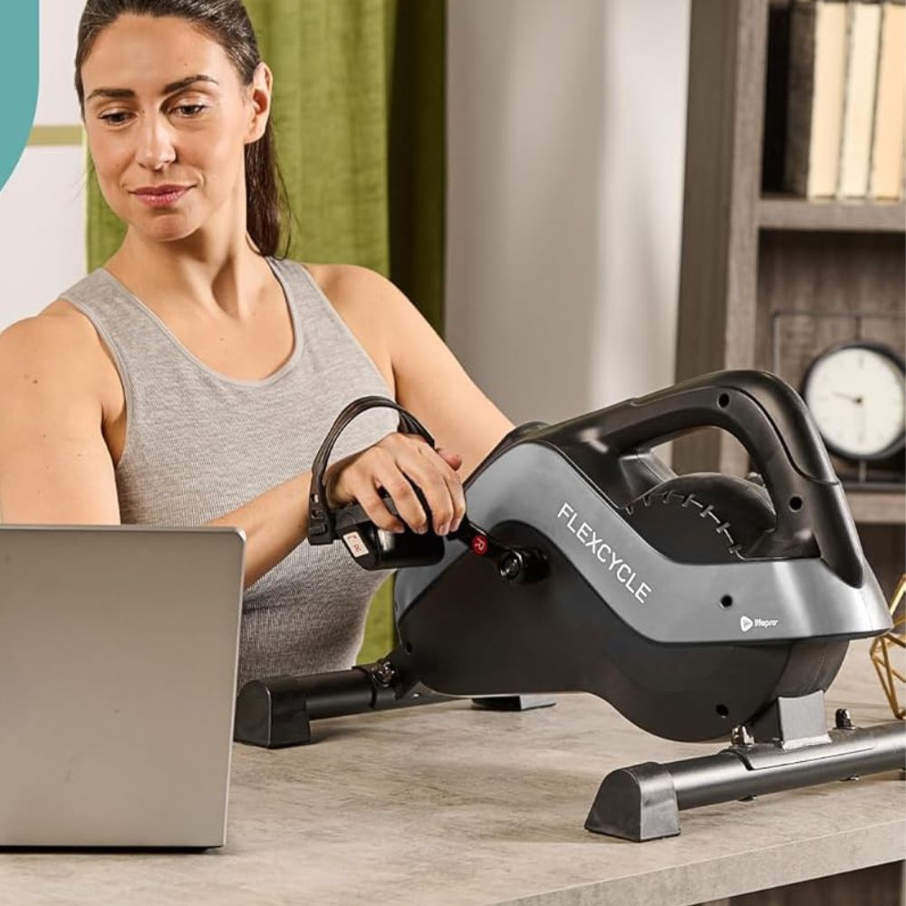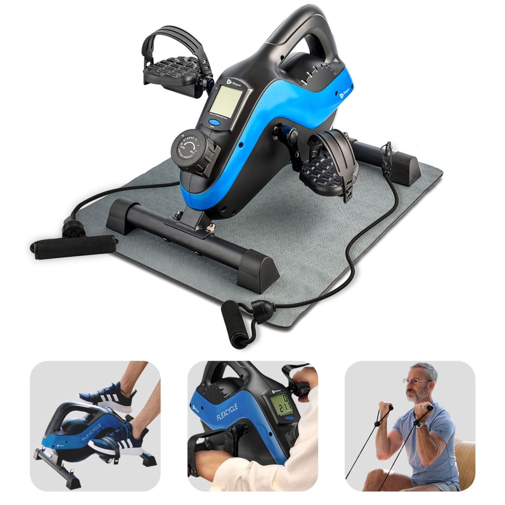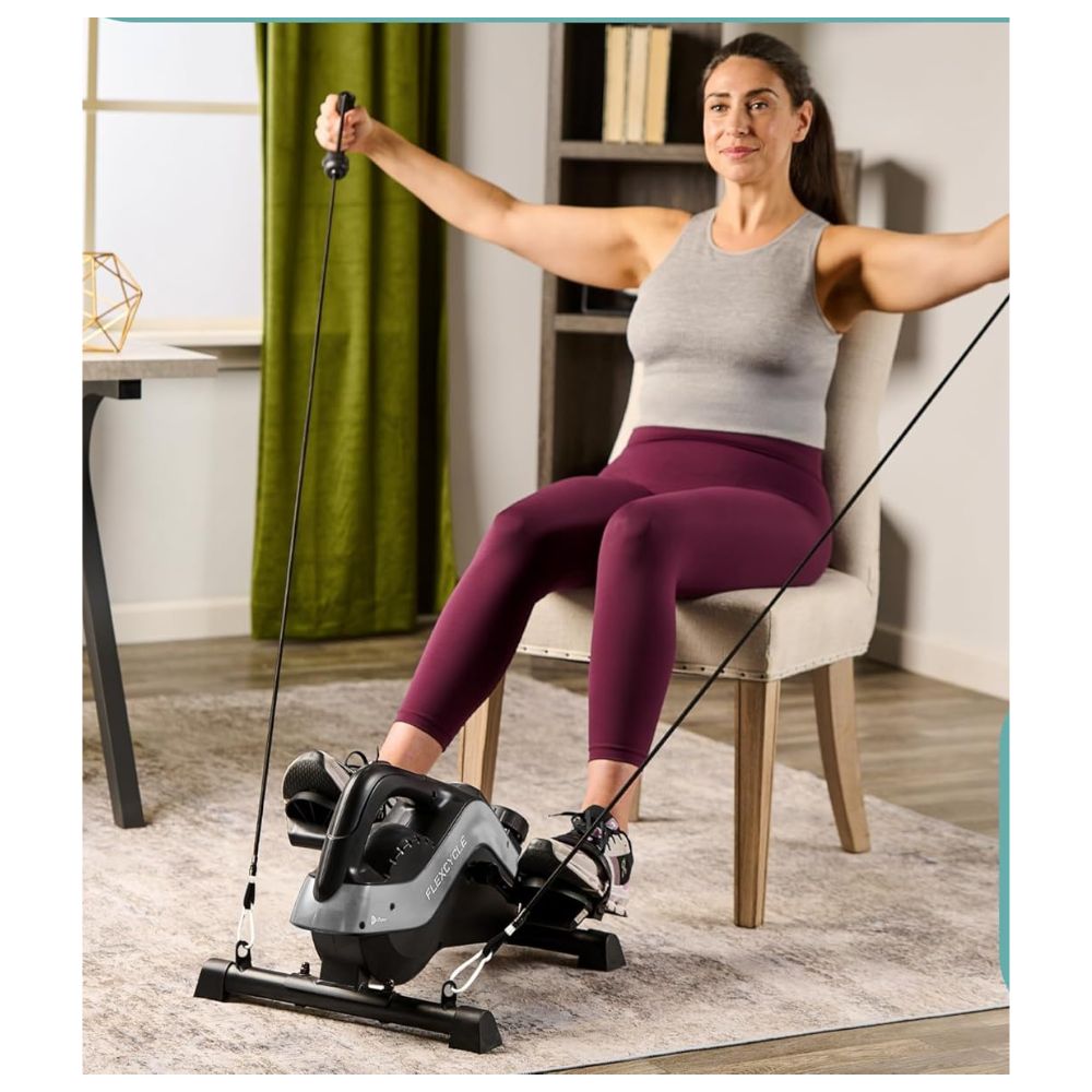 The FlexCycle Plus Exercise Bike features a precision flywheel for an ultra-smooth, whisper-quiet workout anytime—whether at your desk or watching TV. It also includes resistance bands and arm pedals for versatile upper body workouts. Ideal for all fitness levels, this desk cycle allows you to customize your resistance with eight adjustable levels and track your progress with the LCD monitor or free app.