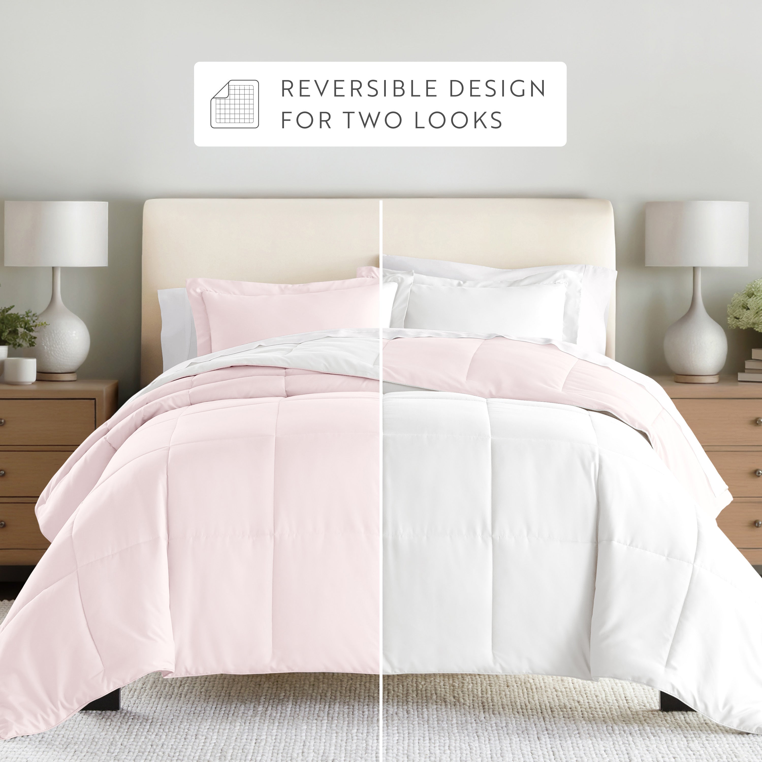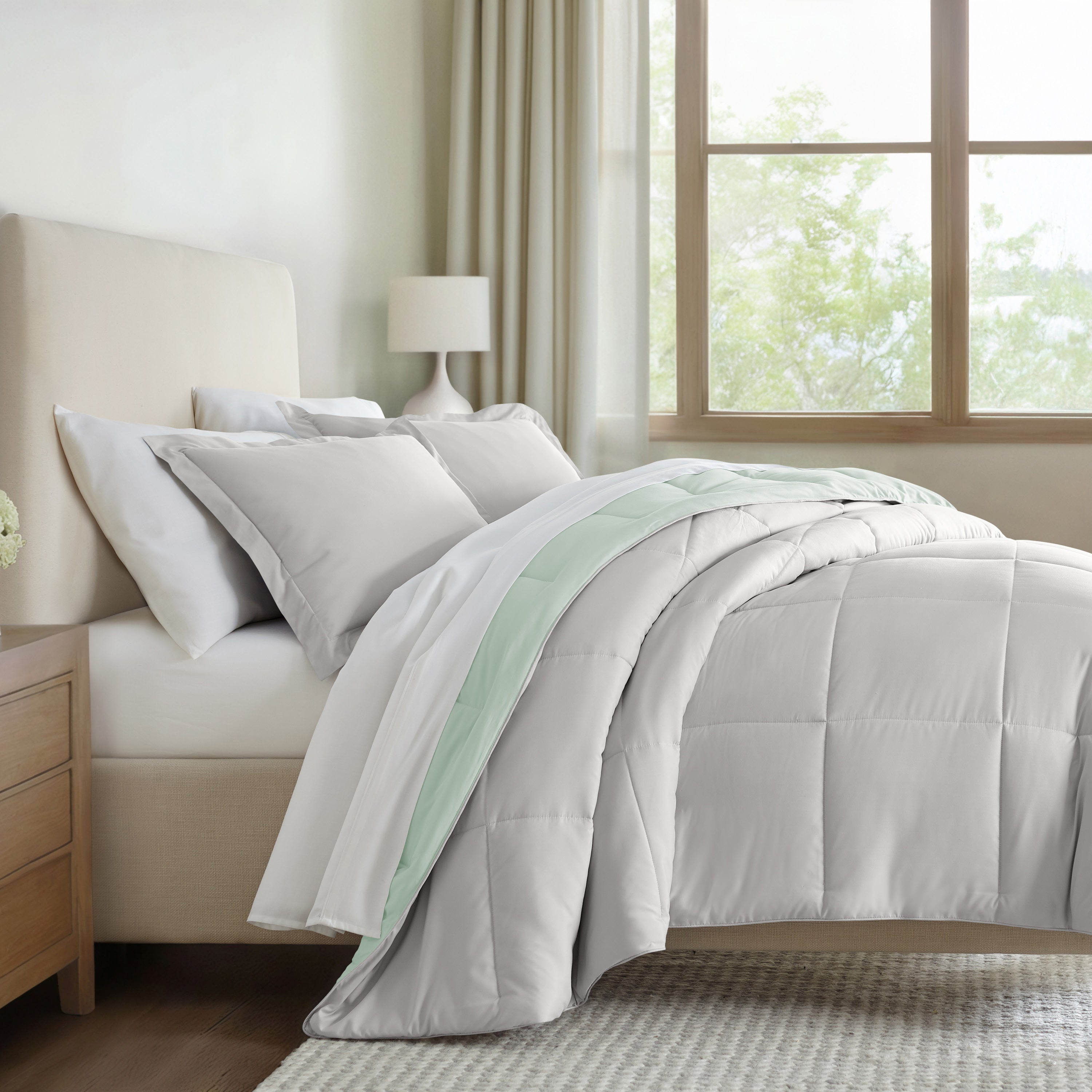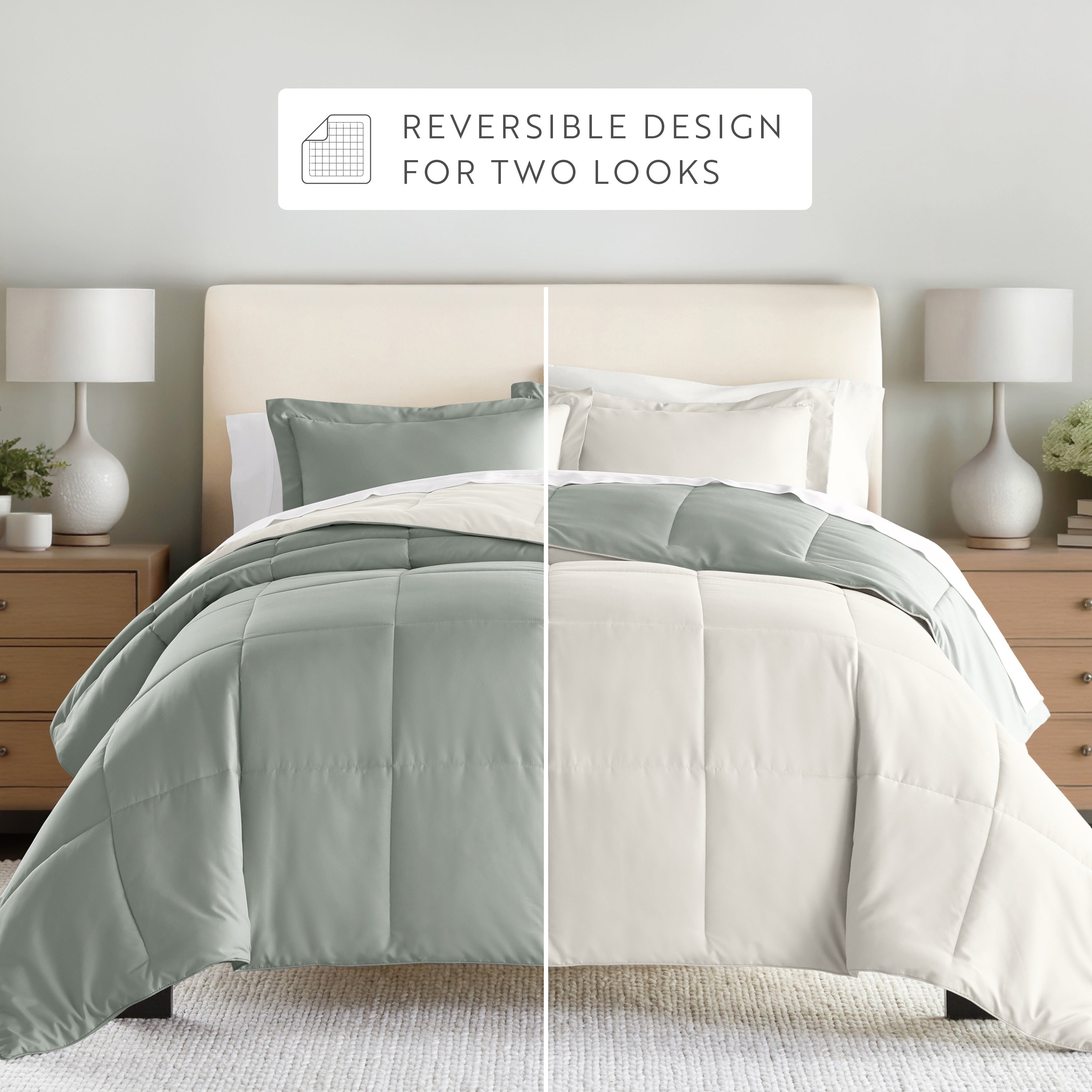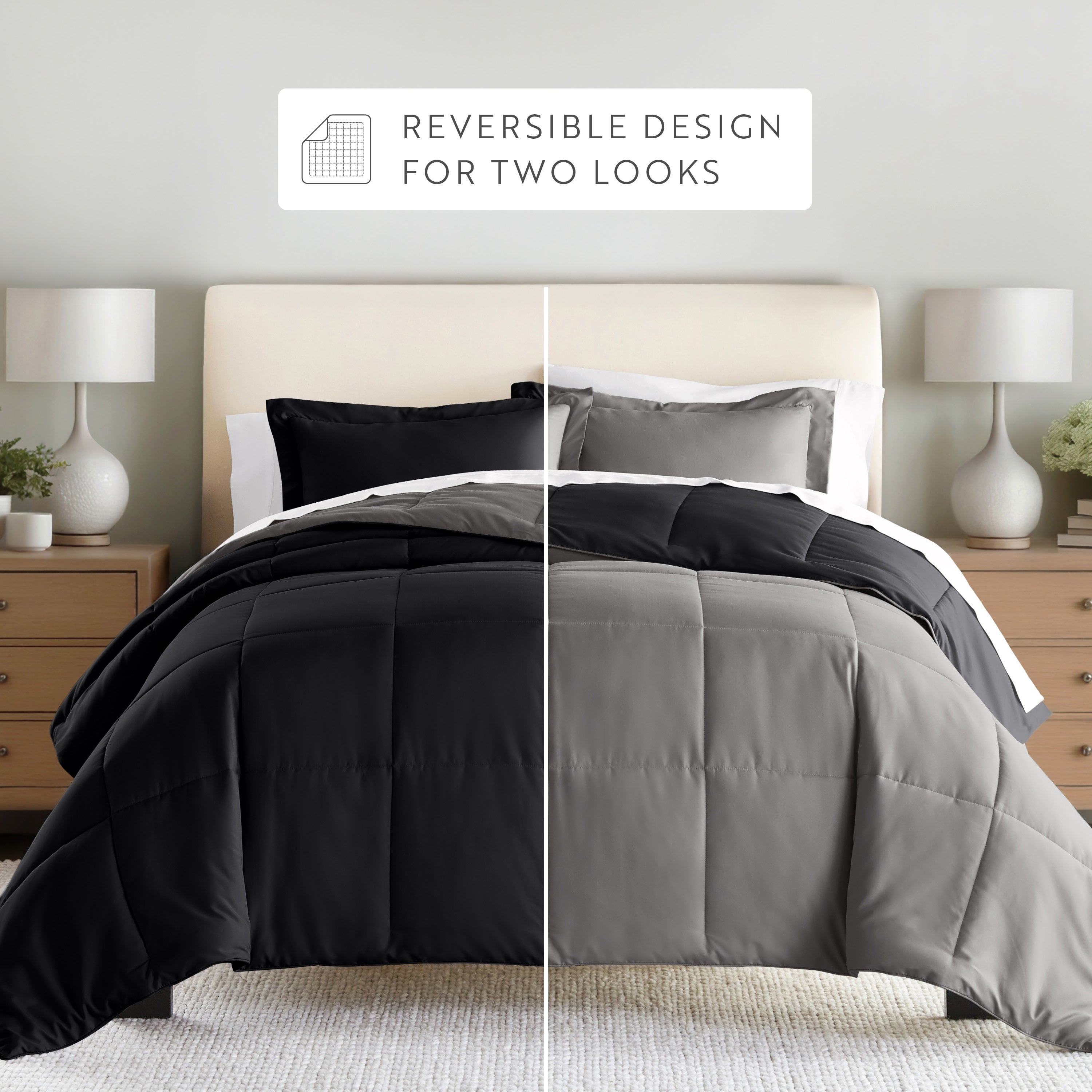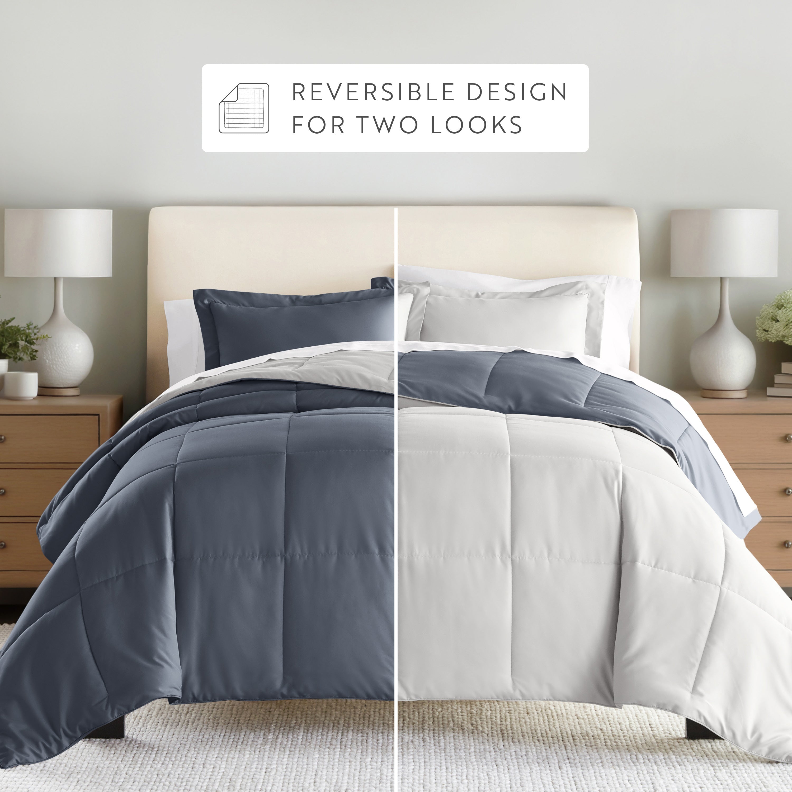 Give your bedding a brand new look and feel with this lightweight, all-season comforter set. Presenting a down-alternative quality, its incredible softness makes it the ideal comforter to keep you cozy all year round. Featuring a reversible design of aesthetically matched colors, this set is ideal for making quick style changes to your sleep space!