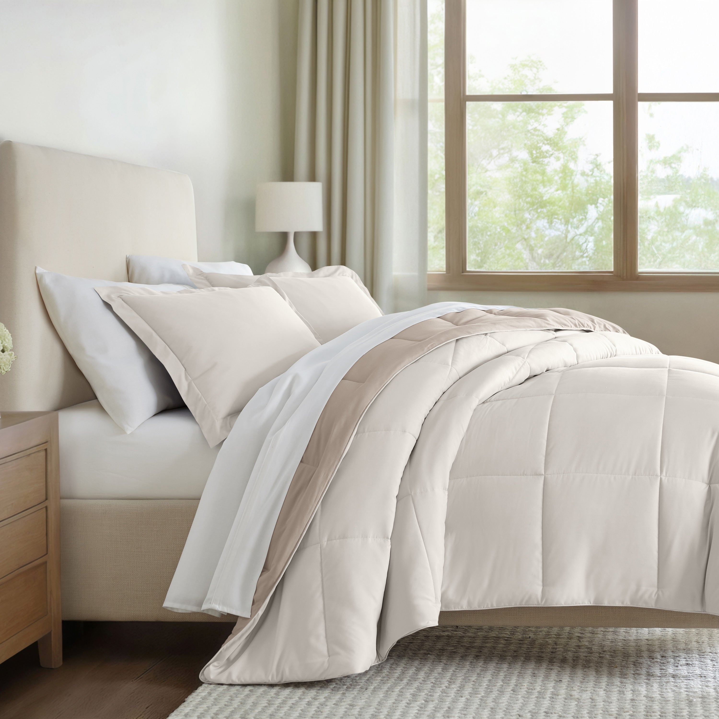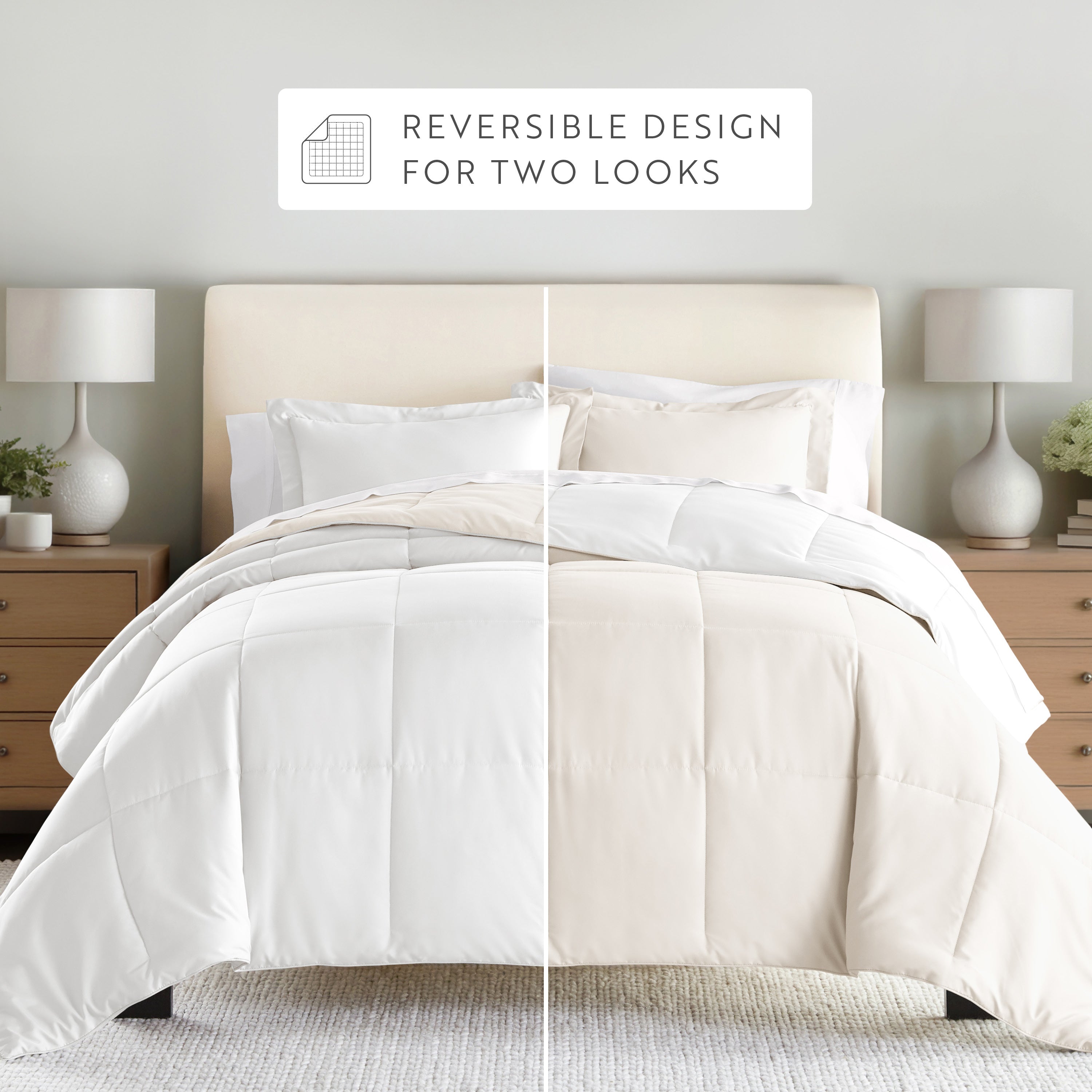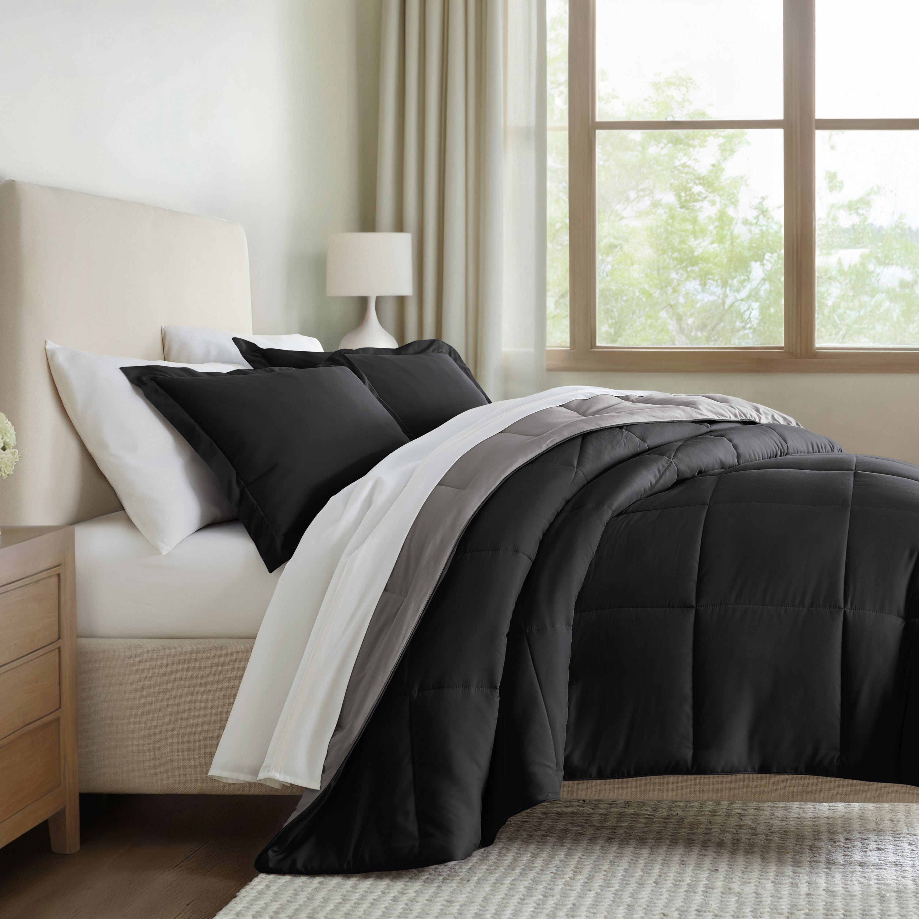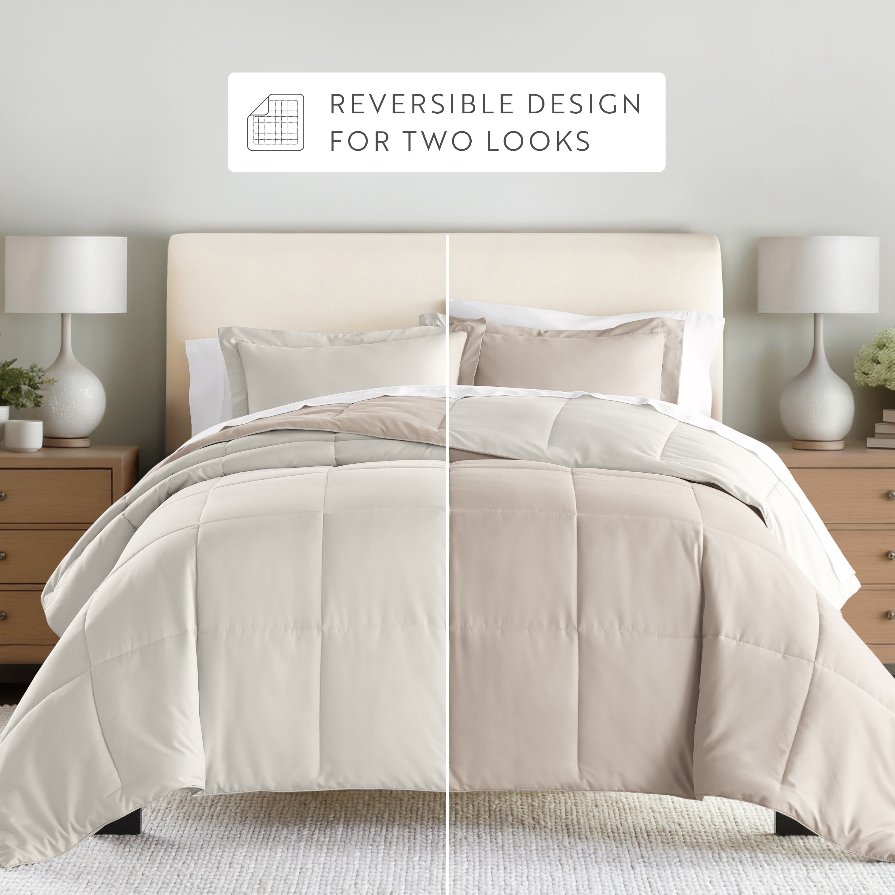 Give your bedding a brand new look and feel with this lightweight, all-season comforter set. Presenting a down-alternative quality, its incredible softness makes it the ideal comforter to keep you cozy all year round. Featuring a reversible design of aesthetically matched colors, this set is ideal for making quick style changes to your sleep space!