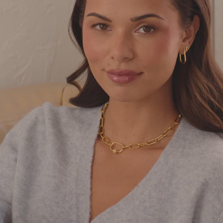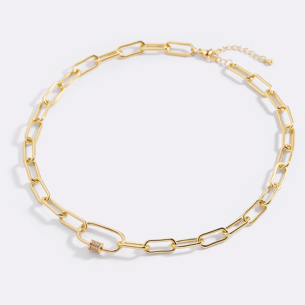 A stunning balance of edge and elegance. This carabiner necklace features a secure yet stylish clasp adorned with shimmering simulated diamonds. Paired with a bold gold link chain, it’s the ideal everyday luxury piece that catches the light—and attention.