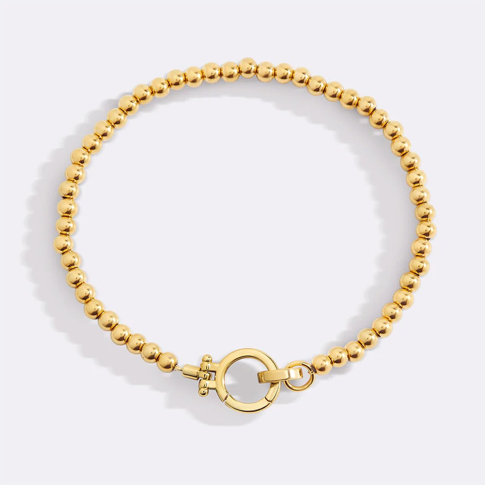 Delicate gold beads meet a mint charm clasp for a playful twist. Style it solo or personalize it with charms (sold separately). Effortless, versatile, and ideal for stacking—your bracelet, your way.