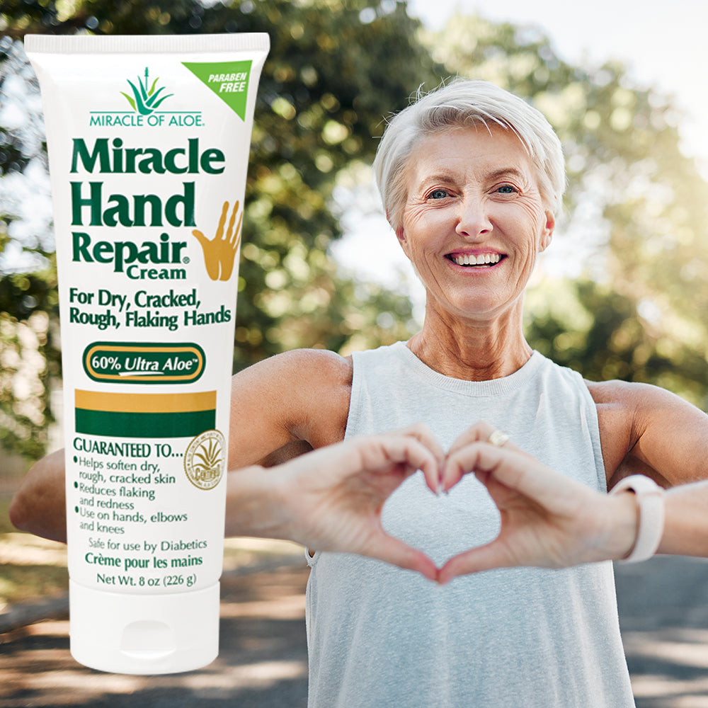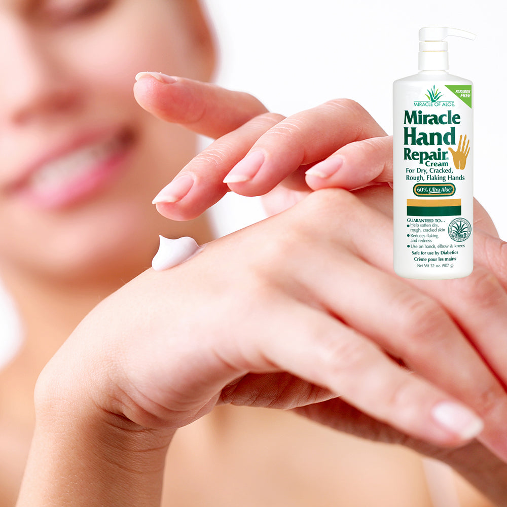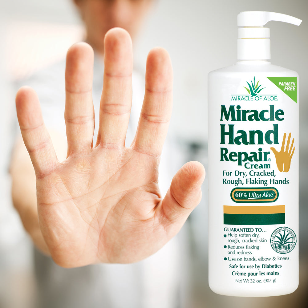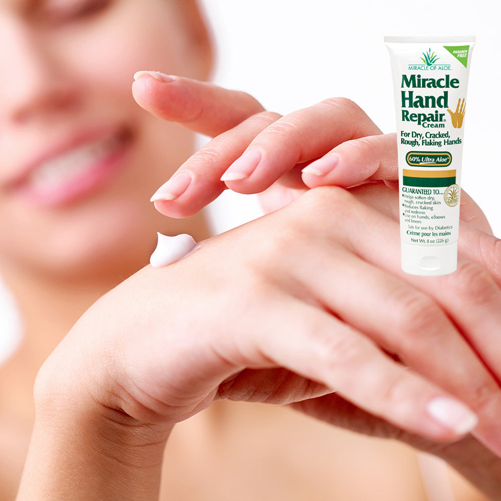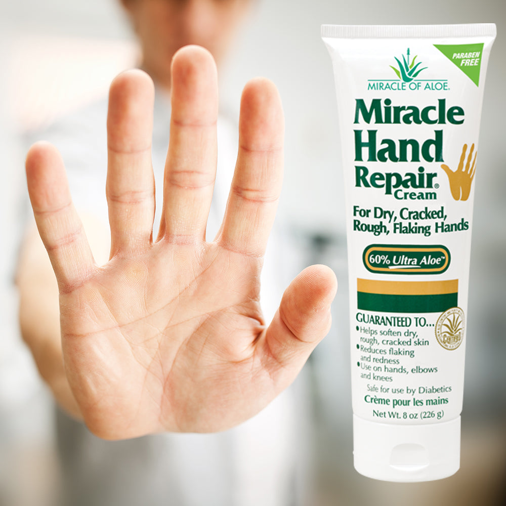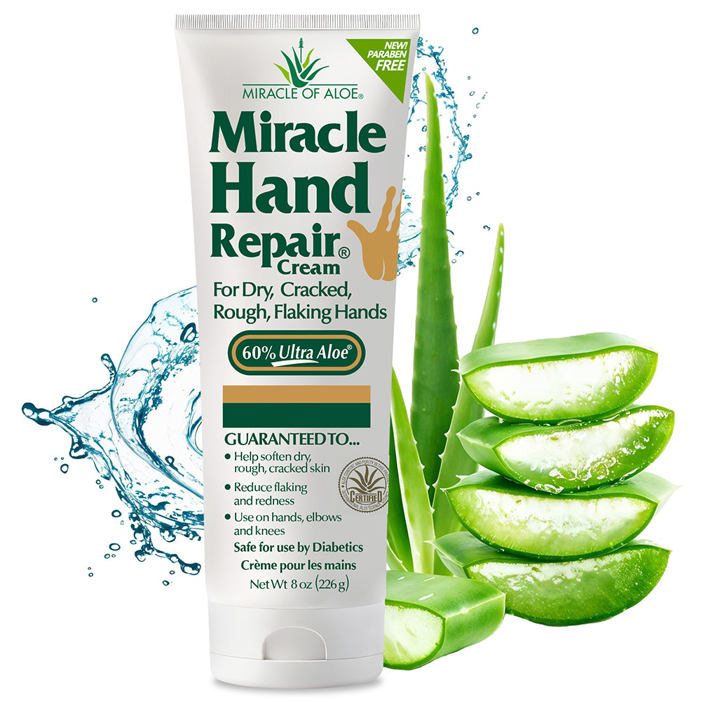 The Miracle Hand Repair Cream is formulated with 60% pure, super-moisturizing organic UltraAloe® Whole Leaf Aloe Vera Gel to restore dry, cracked, flaking, and irritated hands. This intensive formula delivers maximum hydration to soften, smooth, and rejuvenate severely stressed skin. Blended with complementary conditioning ingredients, the cream penetrates deeply through layers of rough, hardened skin to sooth tired hands.