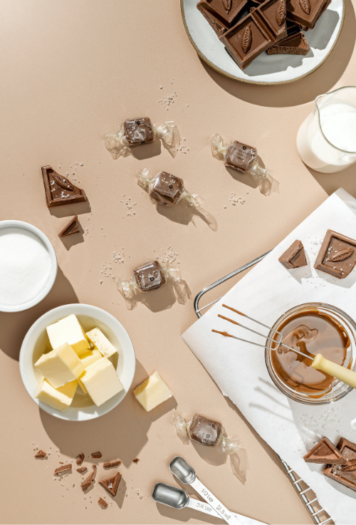 • Assorted: Corn Syrup (Corn Syrup, Salt, Vanilla), Heavy Cream (Cream, Milk, contains 0.5% or less of: Mono & Diglycerides, Polysorbate 80, Carrageenan), Sugar, Butter (Cream, Salt), Milk Chocolate (Cane Sugar, Full Cream Milk, Cocoa Butter, Cacao Beans, Sunflower Lecithin, Vanilla Bean), Dark Chocolate (Cacao Beans, Cane Sugar, Cocoa Butter, Sunflower Lecithin, Vanilla Beans), Sea Salt, Vanilla Extract