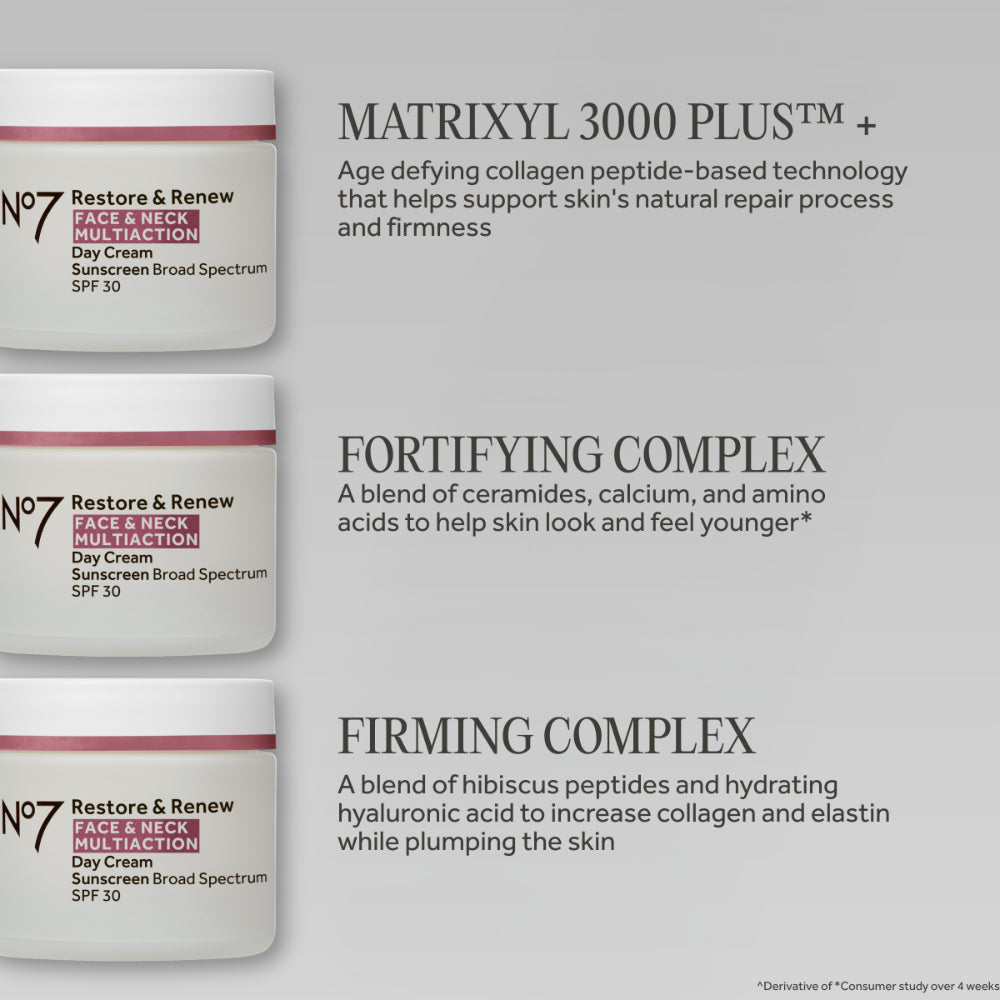 Restore & Renew Day Cream helps skin feel firmed. Formulated with a next-generation, age-defying collagen peptide-based technology, this face cream is designed to visibly reduce the appearance of wrinkles. Its firming complex contains a hydrating blend of hibiscus peptides and hyaluronic acid, while broad-spectrum SPF 30 helps defend and protect skin from harmful UV rays.