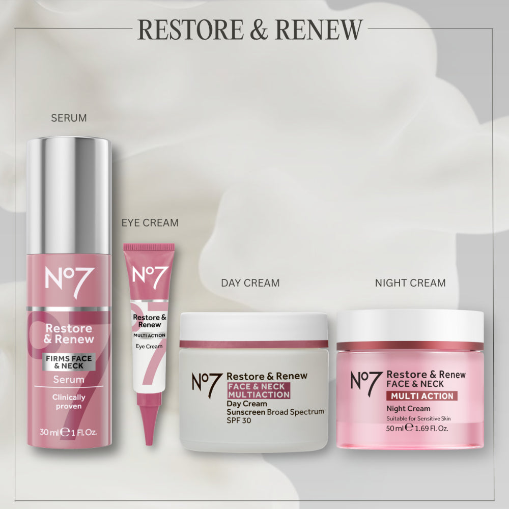 • For best results, apply after using the Restore & Renew Multi Action Face & Neck Serum (sold separately)