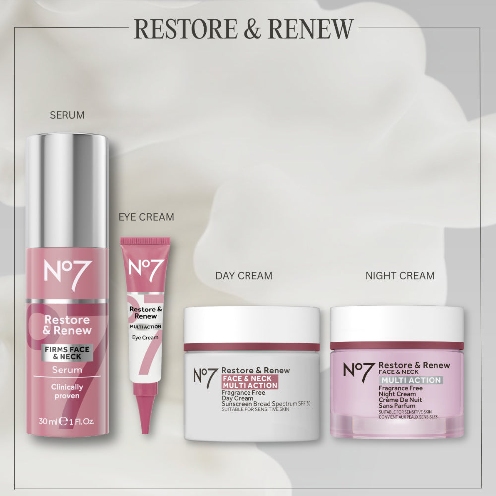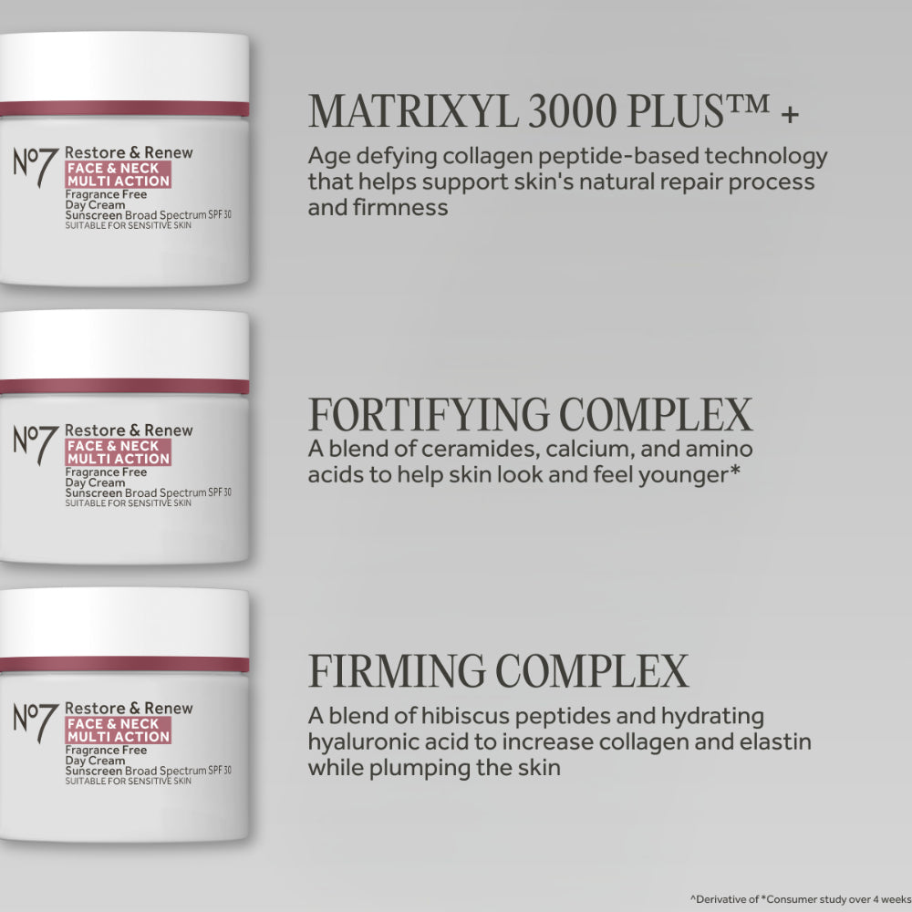 Restore & Renew Day Cream helps skin feel firmed. Formulated with a next-generation, age-defying collagen peptide-based technology, this face cream is designed to visibly reduce the appearance of wrinkles. Its firming complex contains a hydrating blend of hibiscus peptides and hyaluronic acid, while broad-spectrum SPF 30 helps defend and protect skin from harmful UV rays.