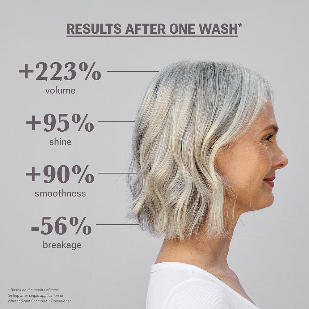 *Based on independent tress tests conducted after a single application of Vibrant Scalp Shampoo + Conditioner