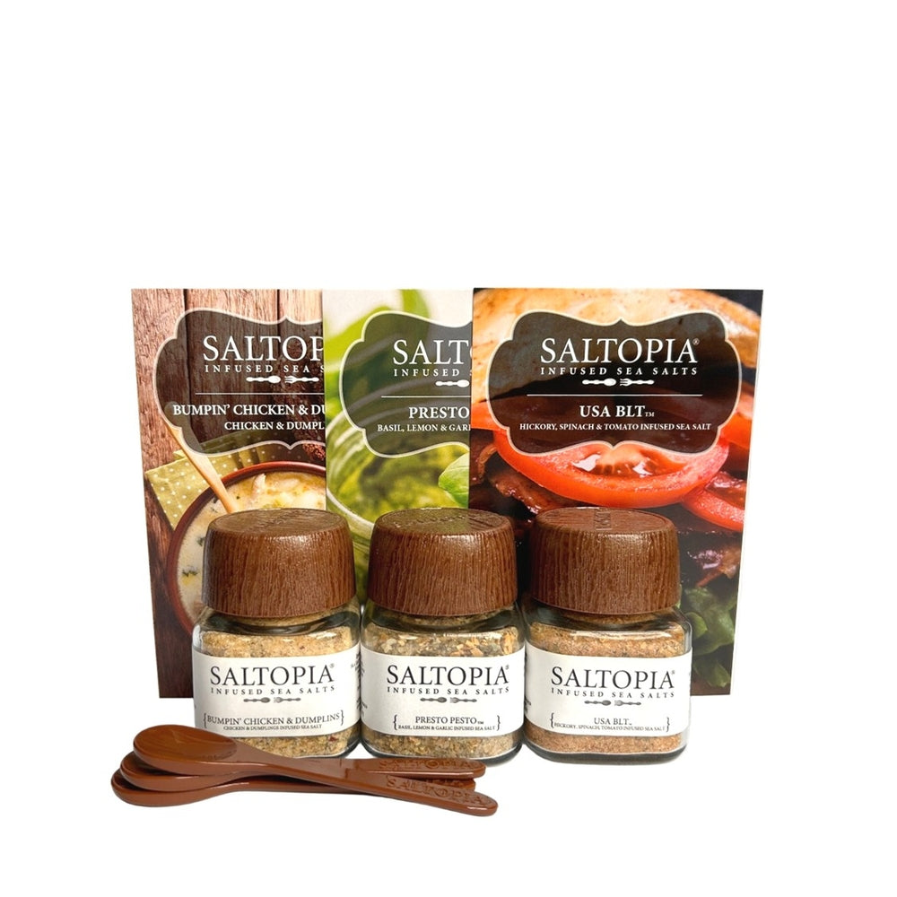 Home cooking encourages creativity in the kitchen by experimenting with recipes and flavors while creating a connection with loved ones. Not only are home-cooked meals rewarding, they also offer a feeling of familiar comfort at the table. This three-flavor set includes classic favorites such as chicken and herbs, creamy pesto packed with basil, and BLT. Each glass jar is beautifully packaged with its own recipe card and signature spoon for sprinkling. Either present the complete trio as a gift, or surprise three different recipients!