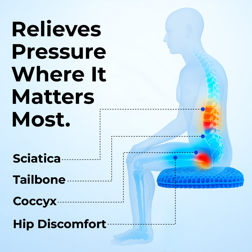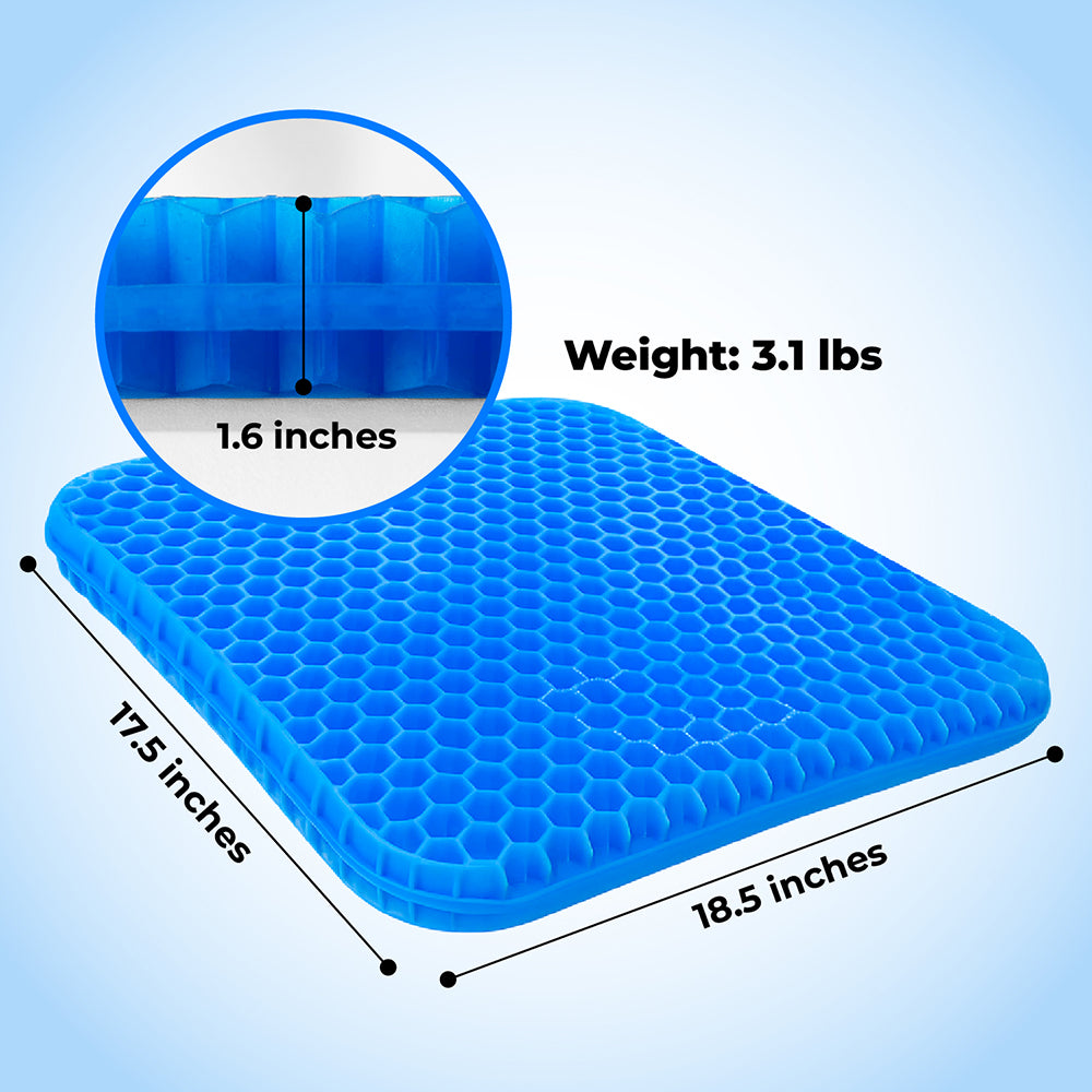 Designed for users seeking a wider seating surface, this large gel seat cushion provides enhanced coverage and cooling airflow for prolonged sitting at work, in the car, or at home. Engineered to enhance comfort during extended periods of sitting, this gel seat cushion relieves pressure on key areas such as the back, coccyx, and hips while providing breathable support.