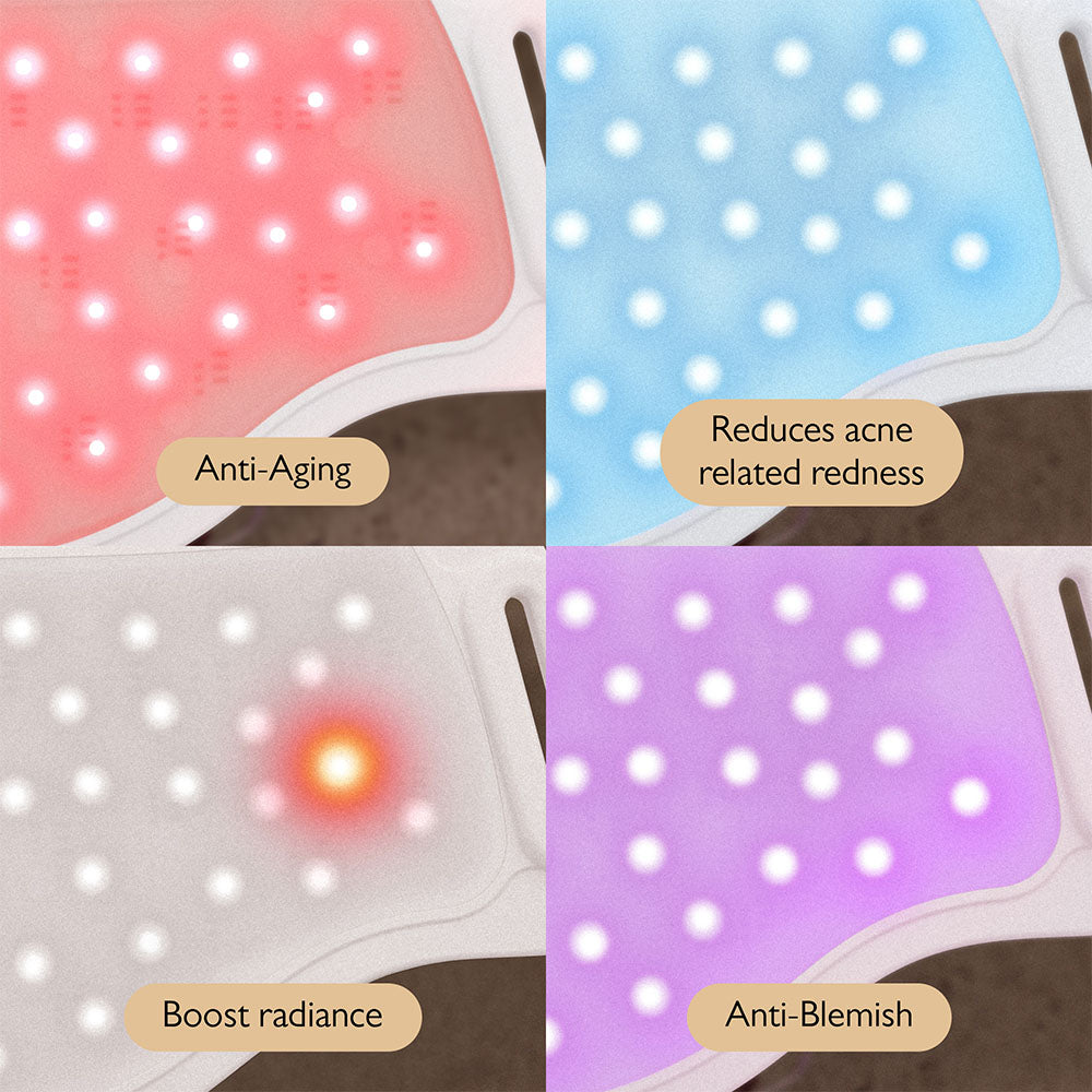 • Blue Light (463 nm): Reduces acne-related redness and imperfections for clearer skin; works to reduce oil secretion