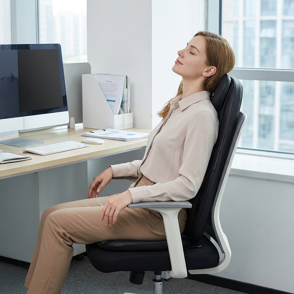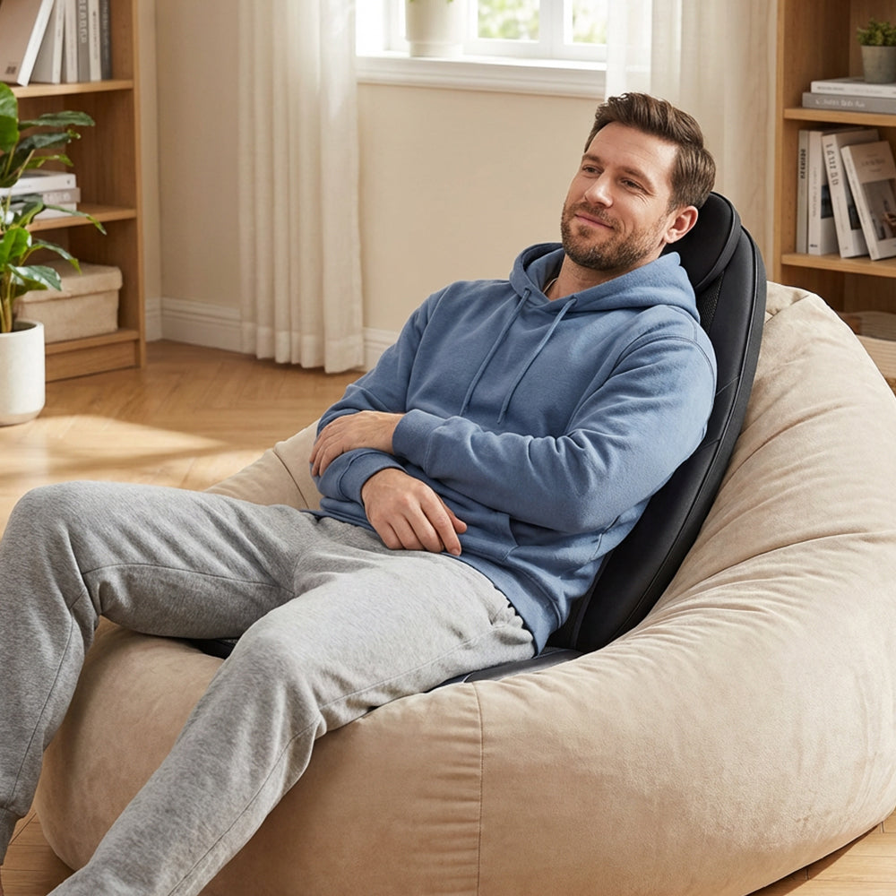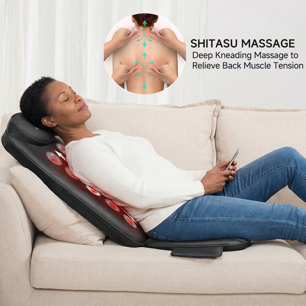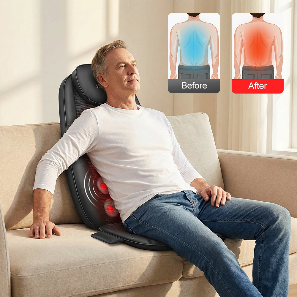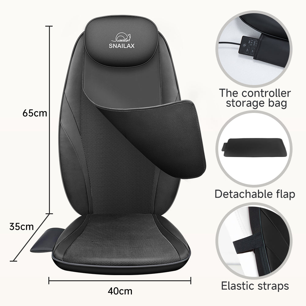 This back massager chair pad combines deep kneading, soothing heat, and adjustable vibration to help relieve muscle tension and promote relaxation. Its versatile design fits most chairs, making it ideal for home or office use.