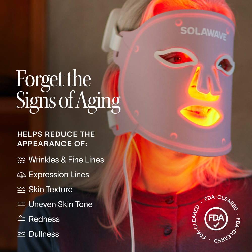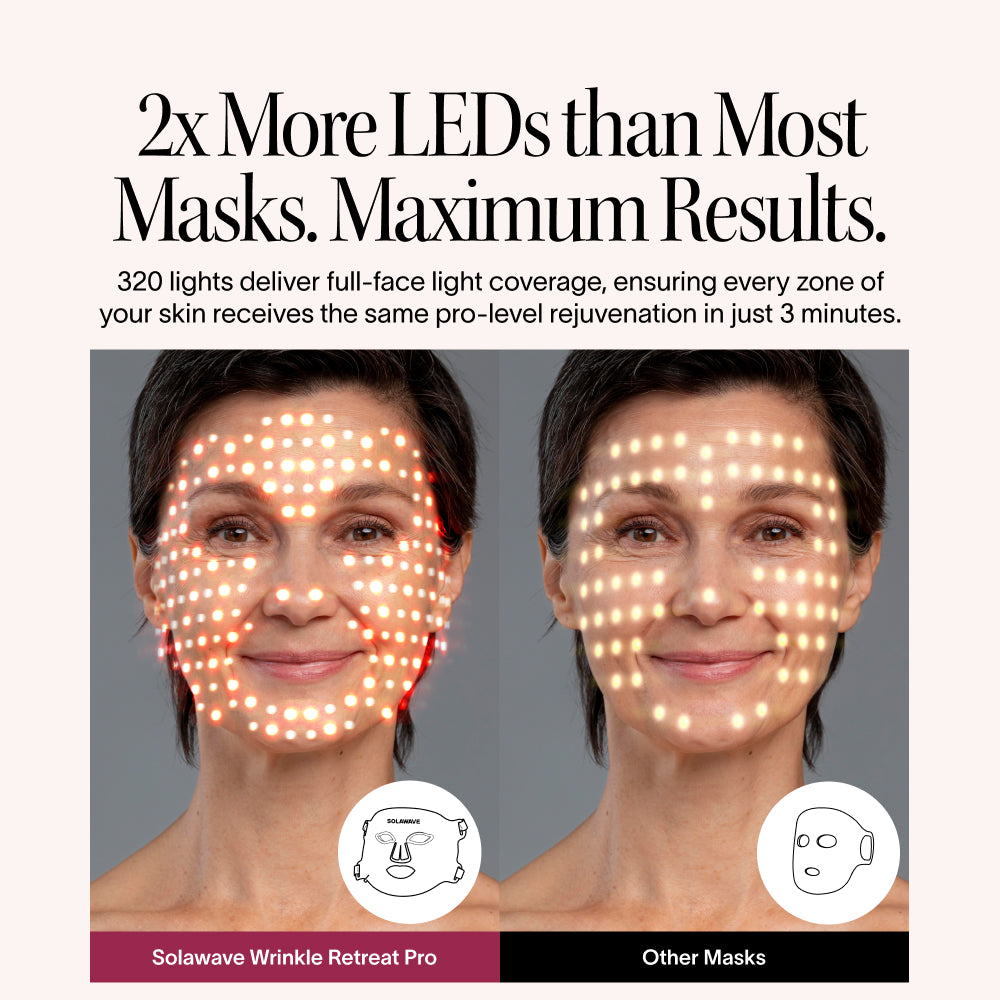 FDA Cleared for visible wrinkle reduction. Engineered for full-face anti-aging and visible wrinkle reduction, the Wrinkle Retreat Face Mask Pro features 320 LEDs, double the industry standard, delivering professional results in just 3 minutes per day. Solawave designs, develops, and manufactures FDA Cleared, dermatologist-recommended light therapy products. Professional-grade skin results from the comfort of home.