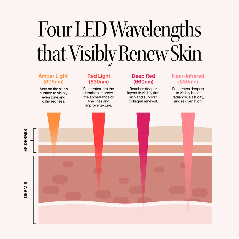 Power in numbers. WrinkleBoost Tech simultaneously floods the skin with 4 high-power wavelengths to reach multiple layers of skin: