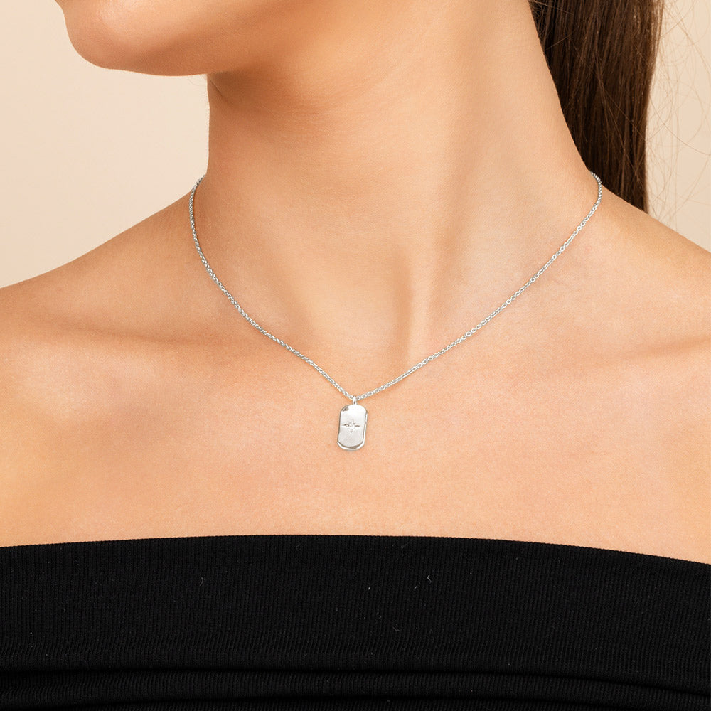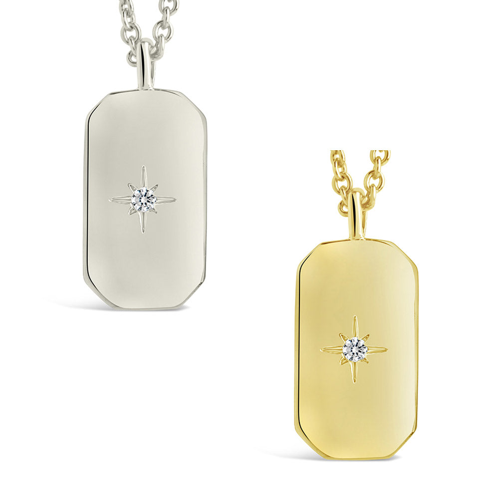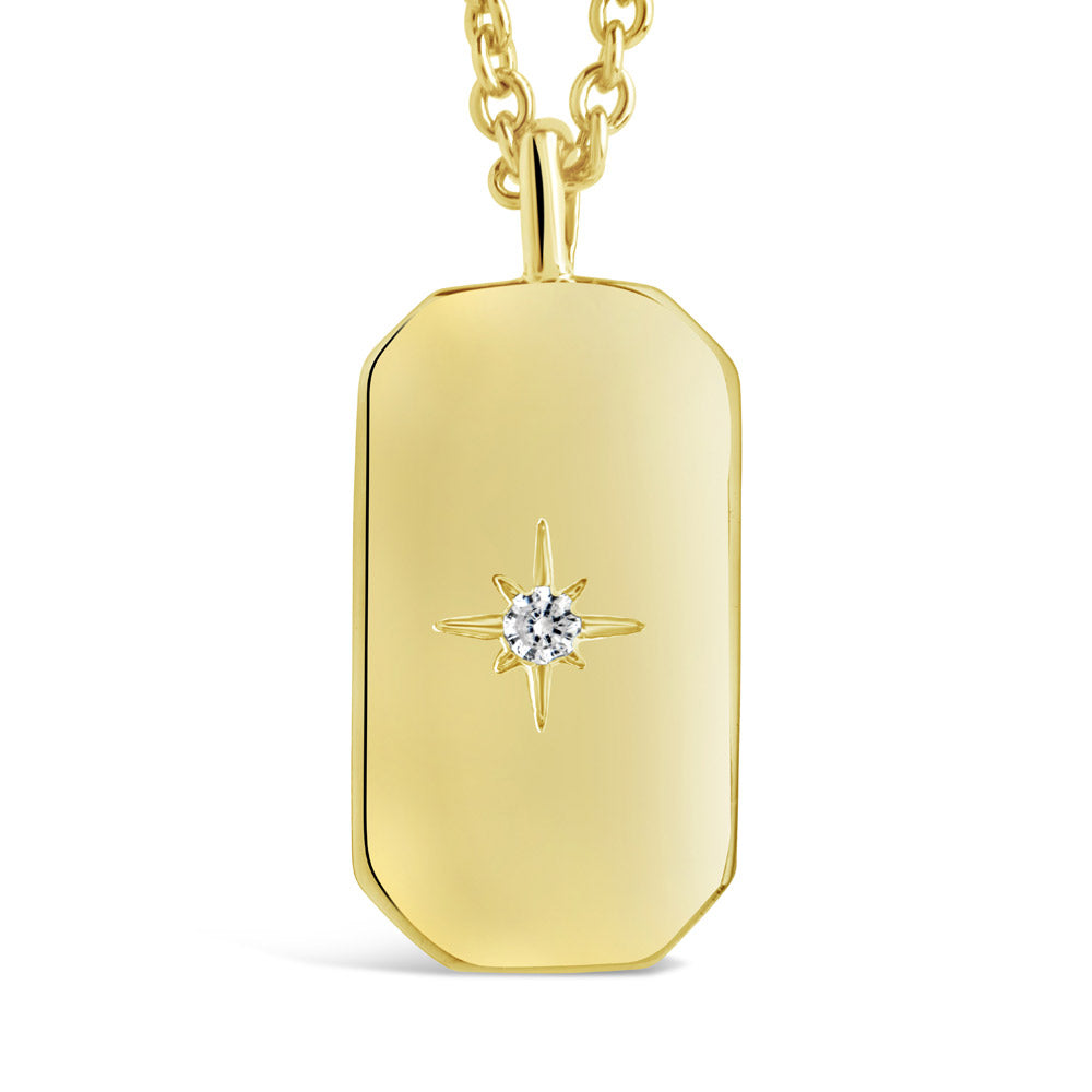 This sleek tag pendant brings a polished edge to your stack with a celestial twist. A single radiant CZ sparkles from a sunburst engraving—minimal, but far from basic. Style it with your favorite chains or wear it solo for a signature shine.