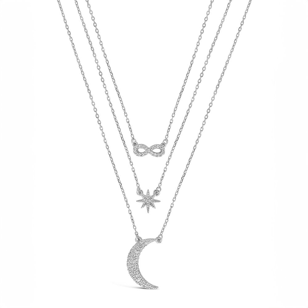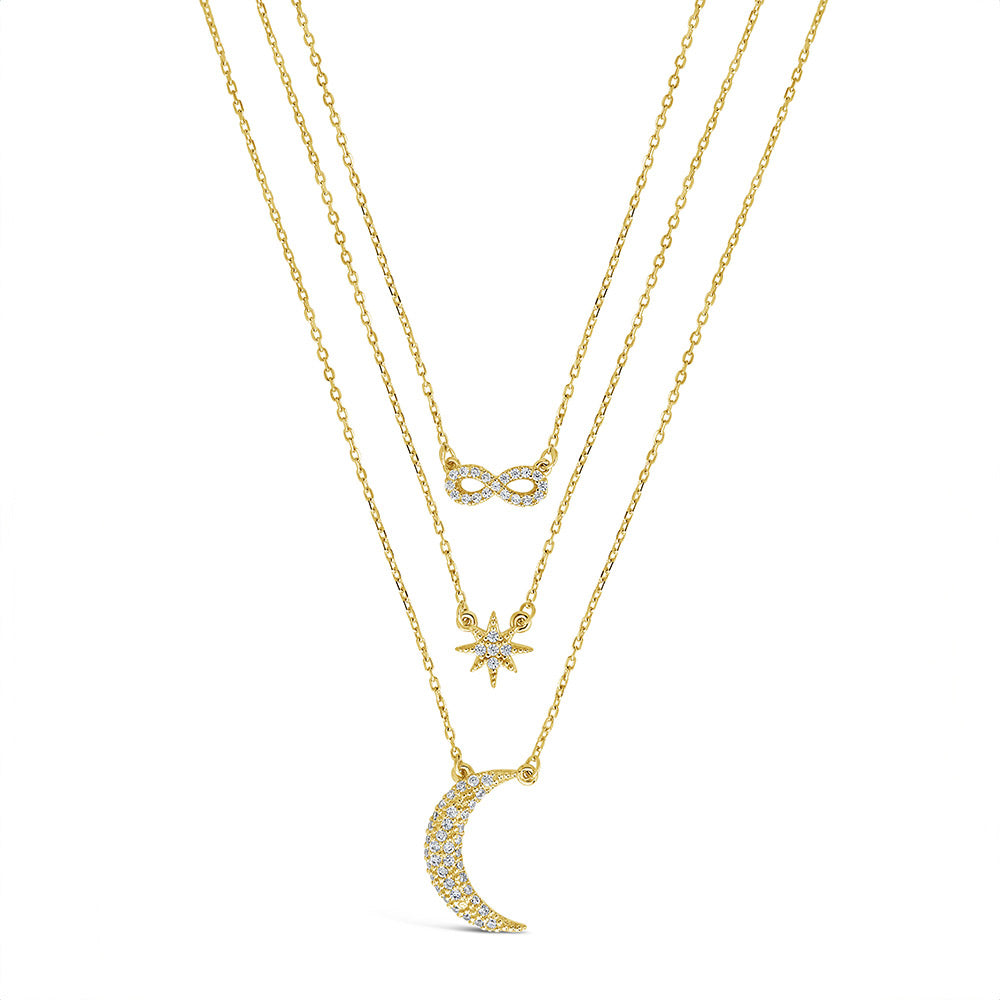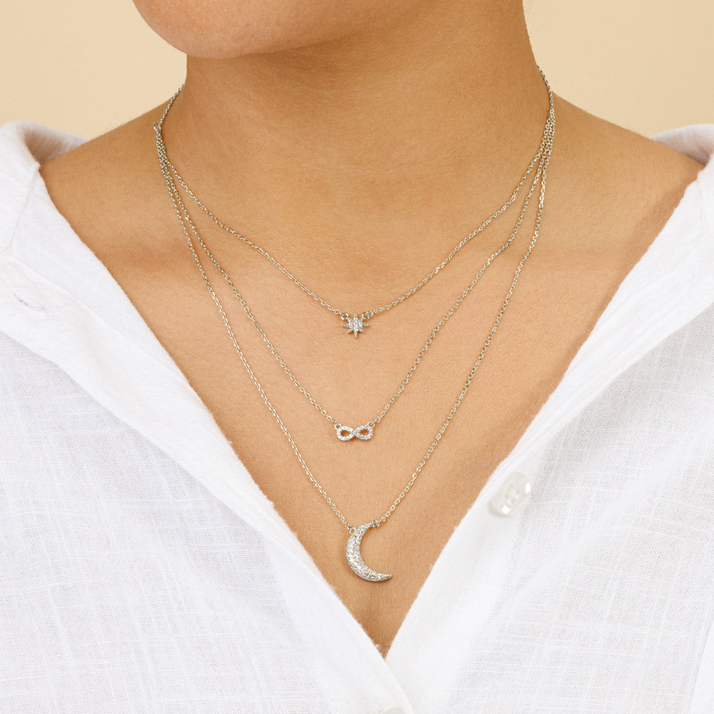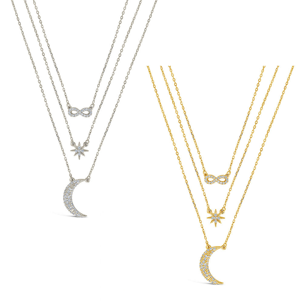 If you're looking for a necklace you’re sure to love forever, this CZ Celestial Infinity Necklace is for you! Delicate and detailed, each of the charms (infinity symbol, starburst, and moon) are adorned with CZ stones.
