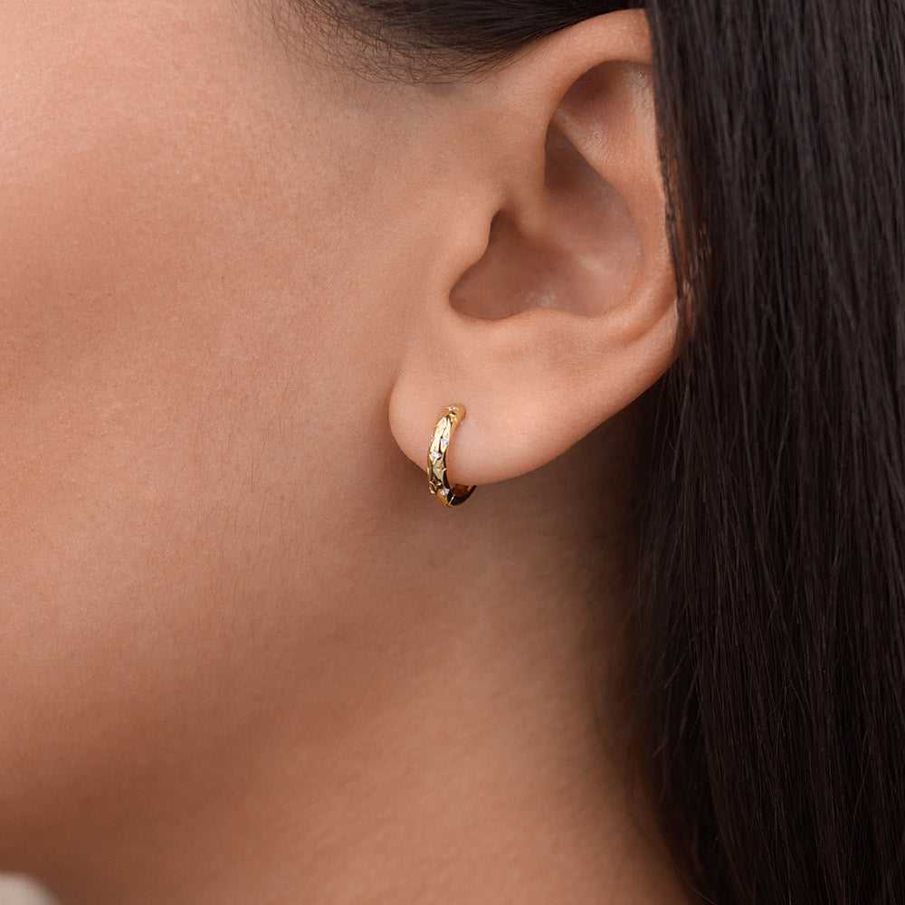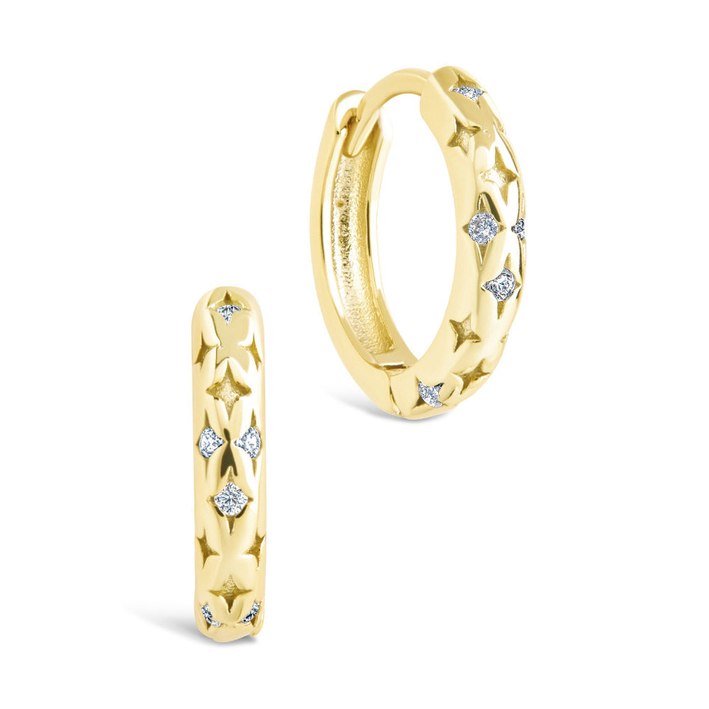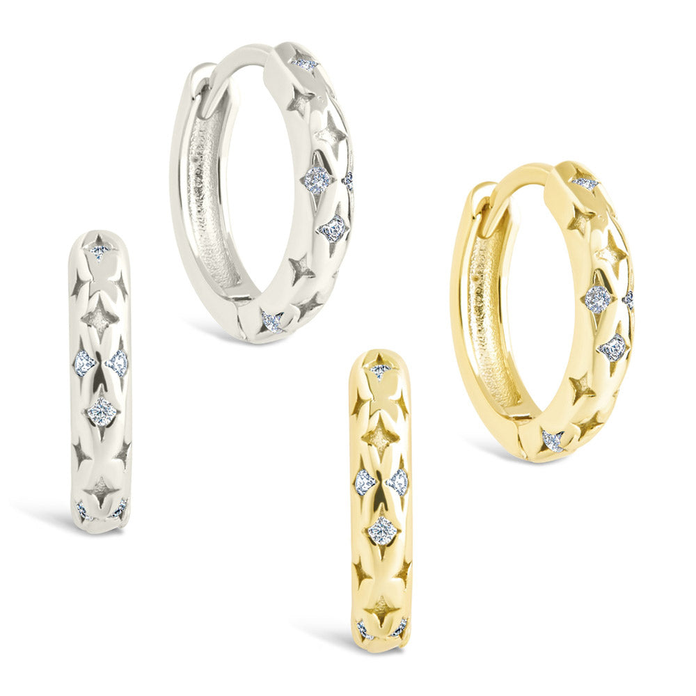 Star-studded and unapologetic. These celestial-inspired micro hoops feature diamond-cut CZs set in etched starbursts—made to shine solo or layered with your everyday stack.