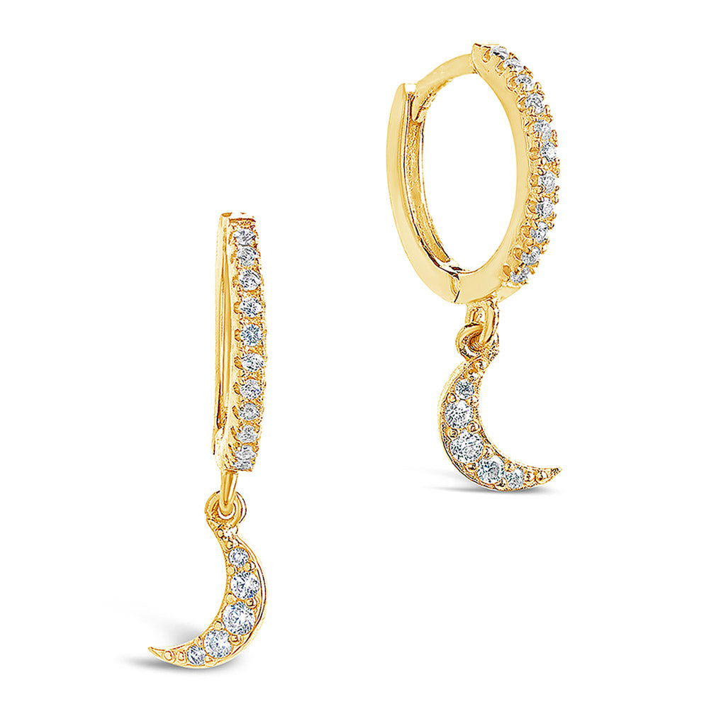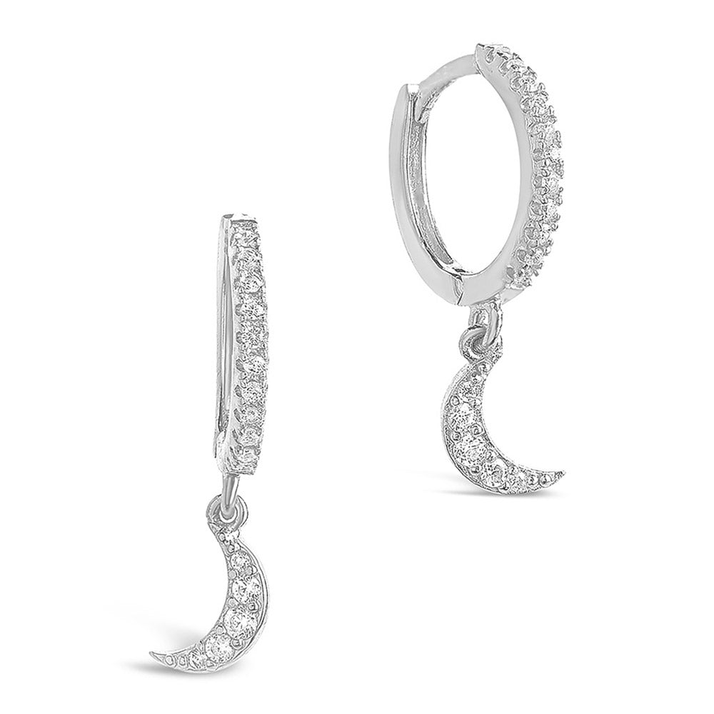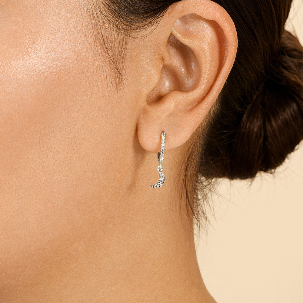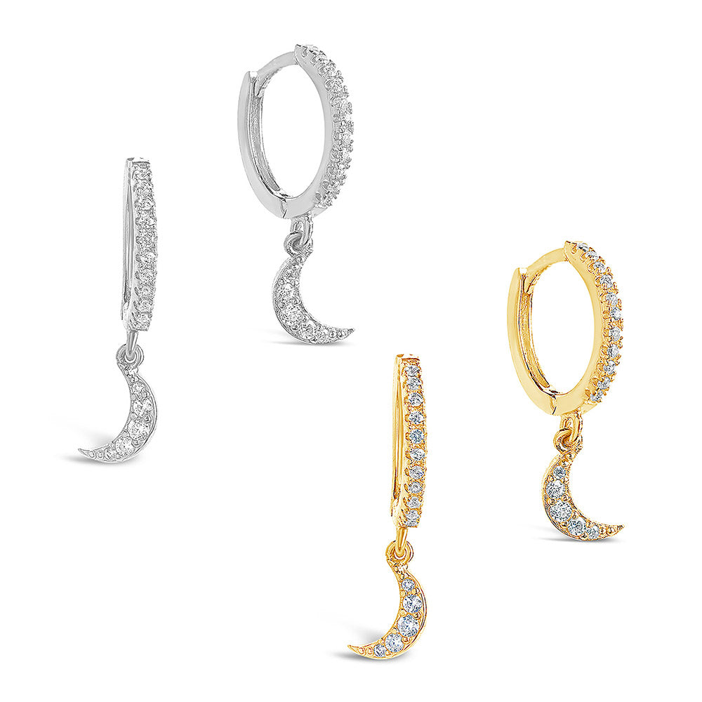 Who says a delicate accessory can't add a serious sparkle to your look? Try on these CZ Crescent Micro Hoops, which feature small hoop shapes, dainty dangling crescent moon charms, and plenty of CZ stones.
