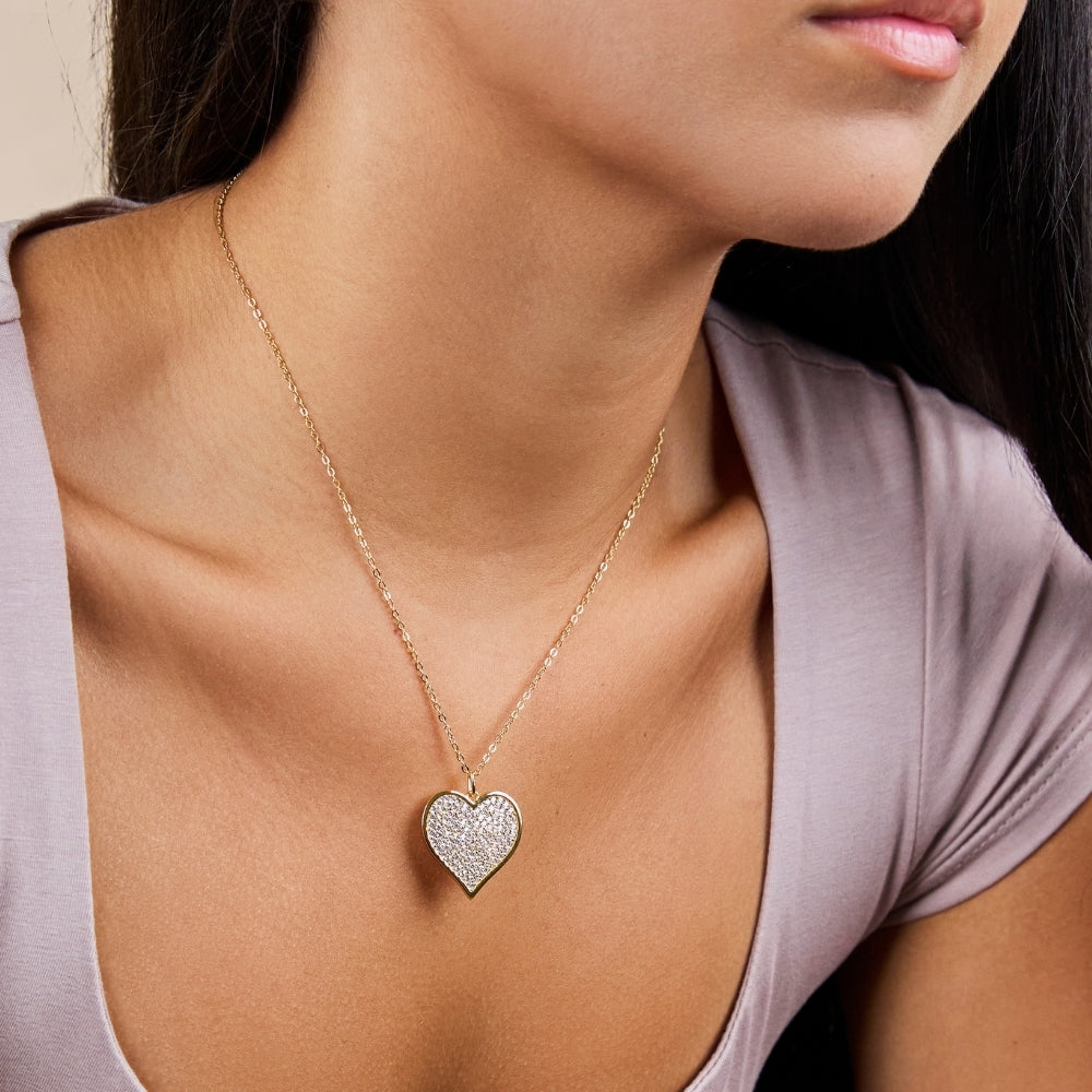 The Sterling Silver Large Heart Pendant Statement Necklace is all charm, no effort. Covered in tiny pavé CZ stones and finished with a sleek bezel edge, it’s playful, a little bold, and ready to be your everyday favorite.