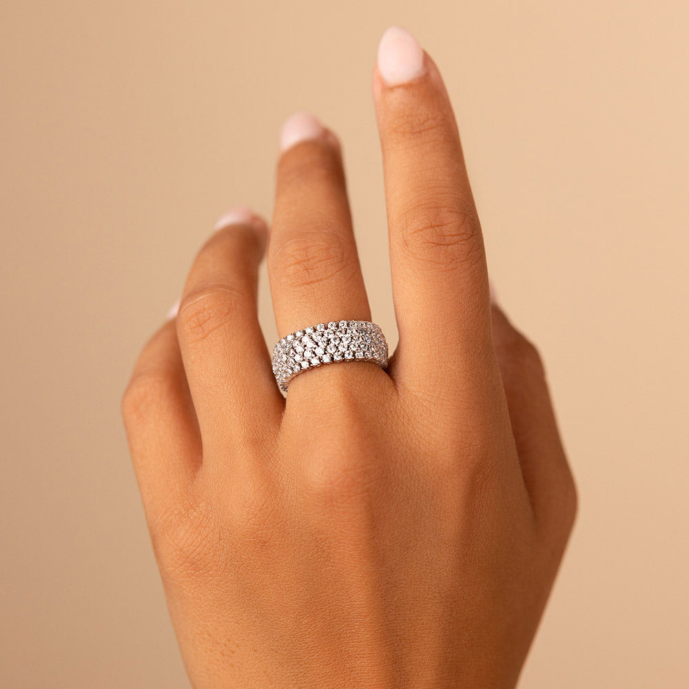 Indulge in elegance with the Sterling Silver Yvonne CZ Stacking Ring. This ring features rows of sparkling CZ stones, evoking the beauty of an eternity band ring. Elevate your style and add a touch of sophistication to any outfit with this ring.