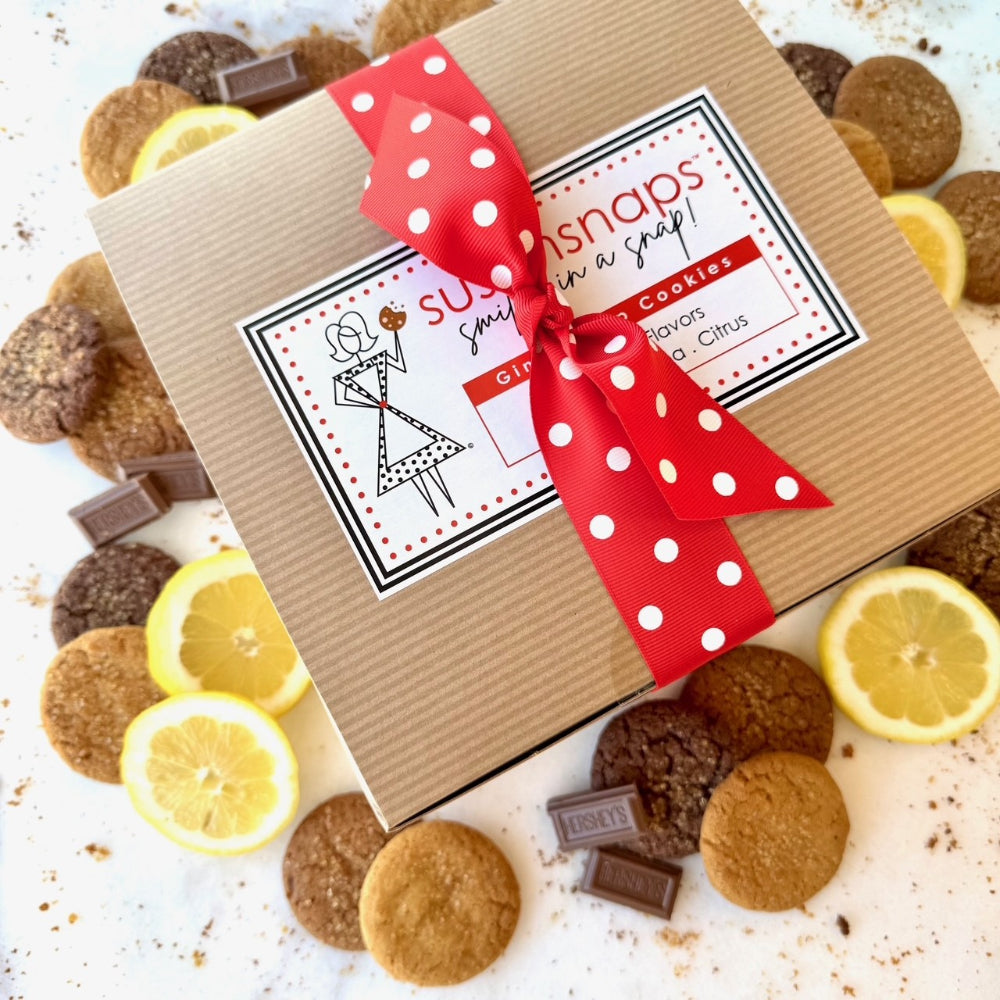 This irresistible assortment features three delicious flavors: classic Original gingersnaps, zesty Citrussnaps with a lemony tang, and decadent Cocoasnaps infused with real cocoa and pure vanilla. Whether as a personal treat or thoughtful gift, this variety box is the ultimate way to experience the bold, gourmet flavor of handcrafted gingersnap cookies.