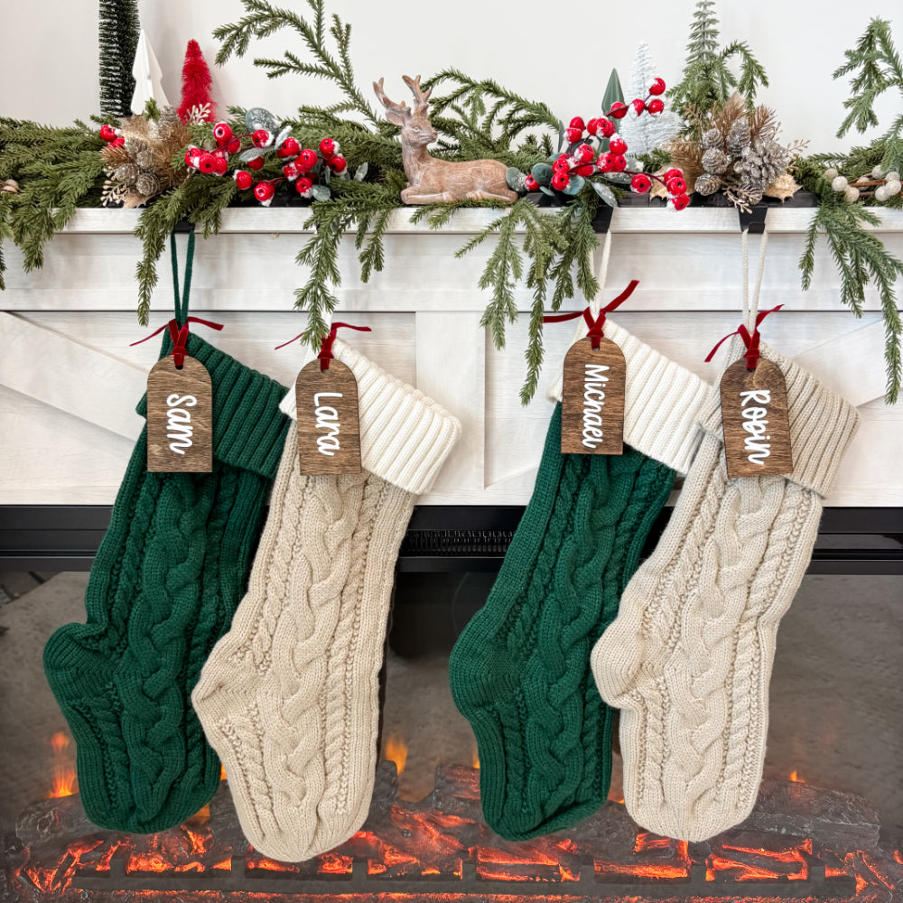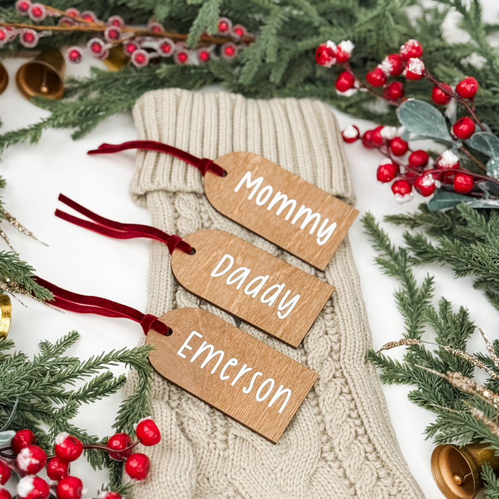 Bring a charming, rustic touch to your holiday décor with this personalized wooden stocking tag. It’s custom-printed with a name, ideal for labeling stockings or adding a personal accent to gifts.
