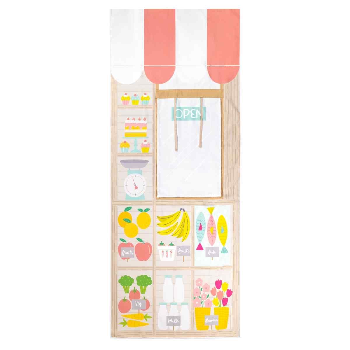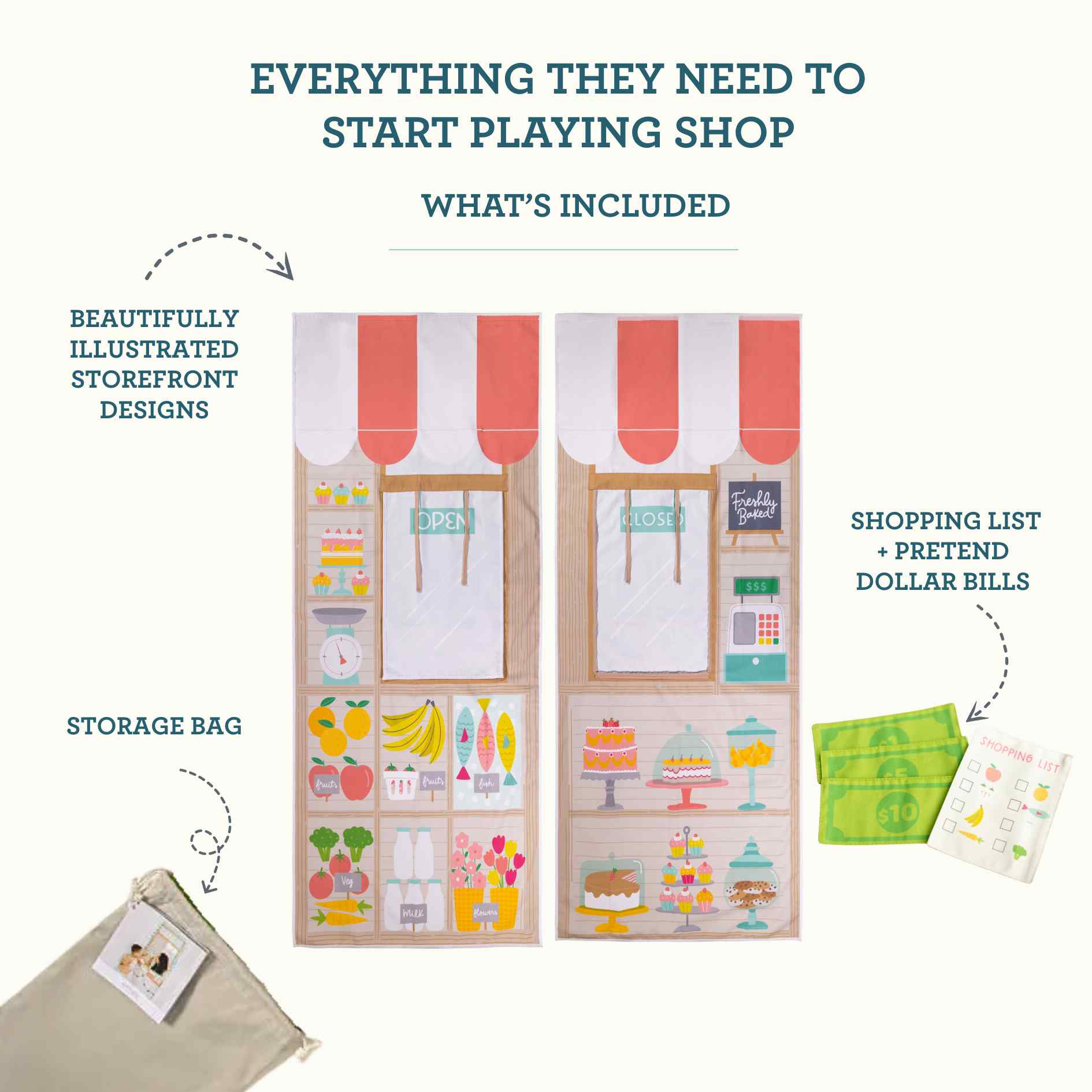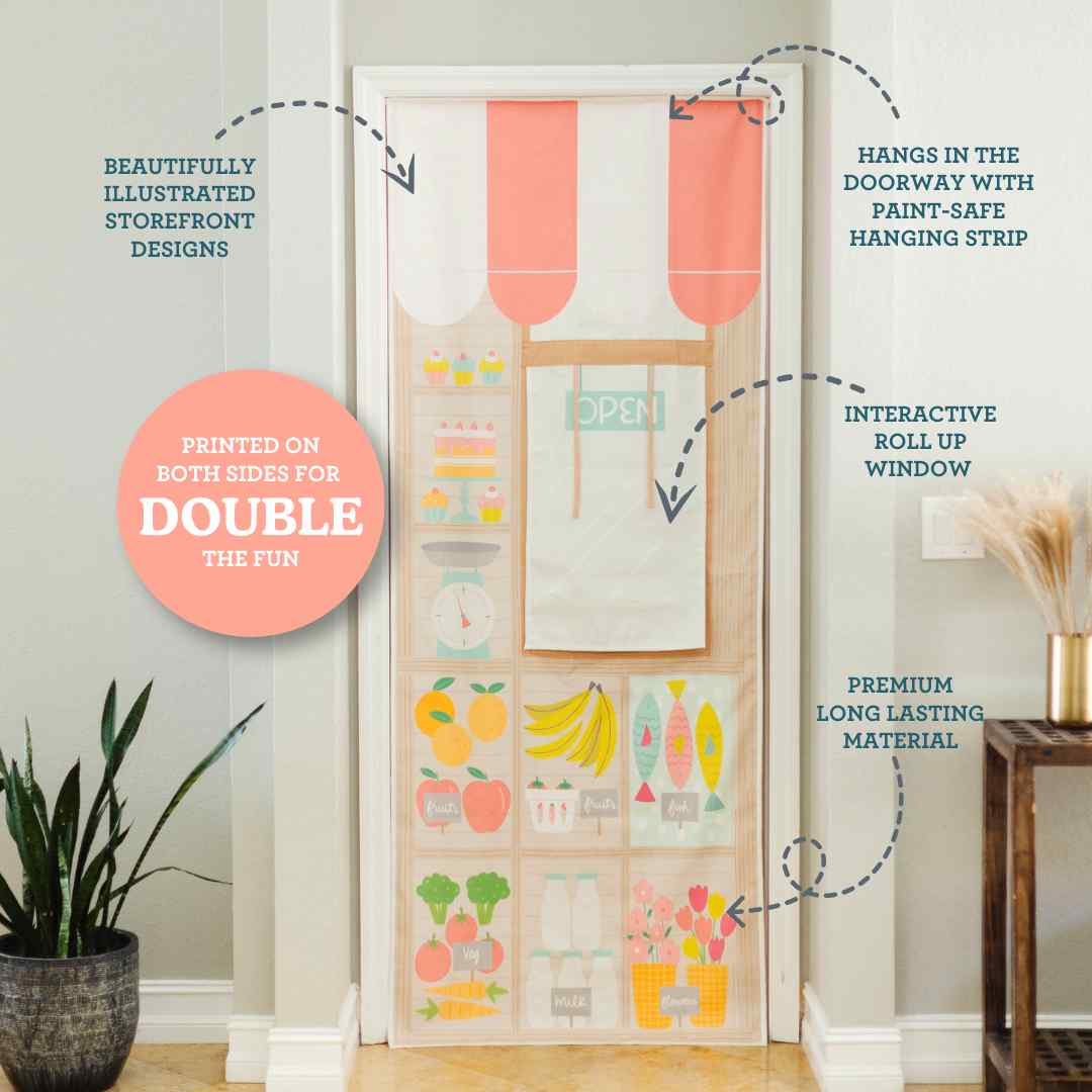 Step into a bustling world of small shops and big imaginations. This double-sided play shop transforms any doorway into a charming storefront—ideal for little shopkeepers ready to “open for business.”