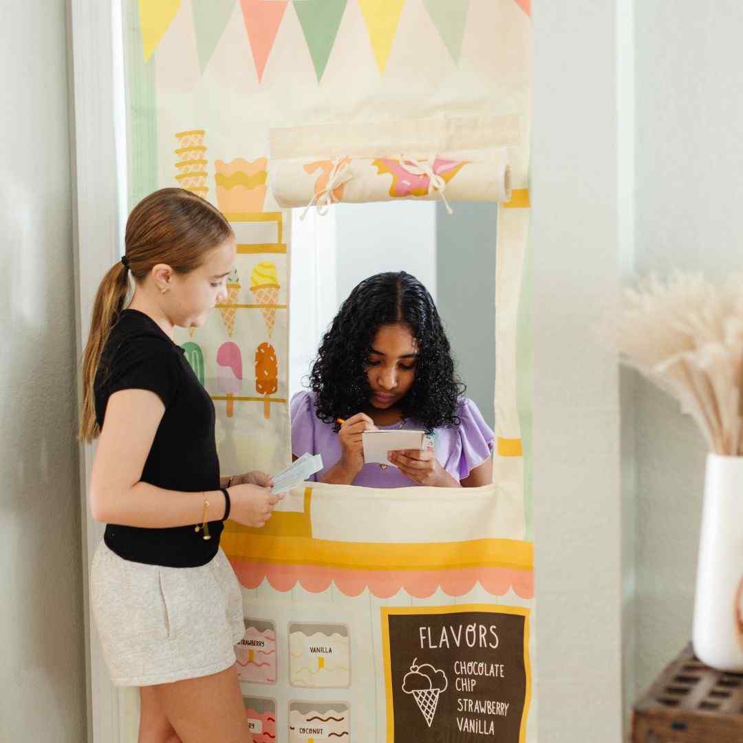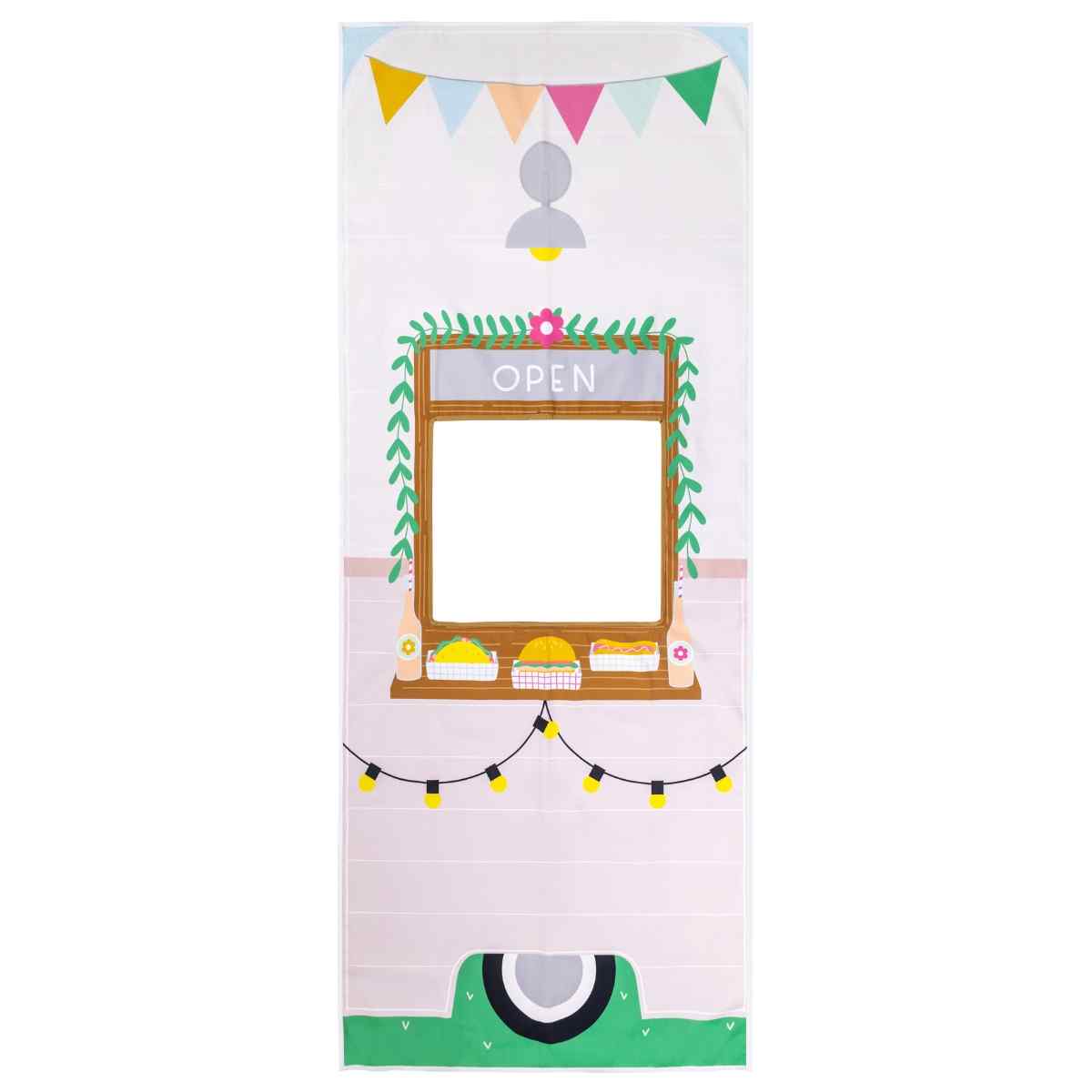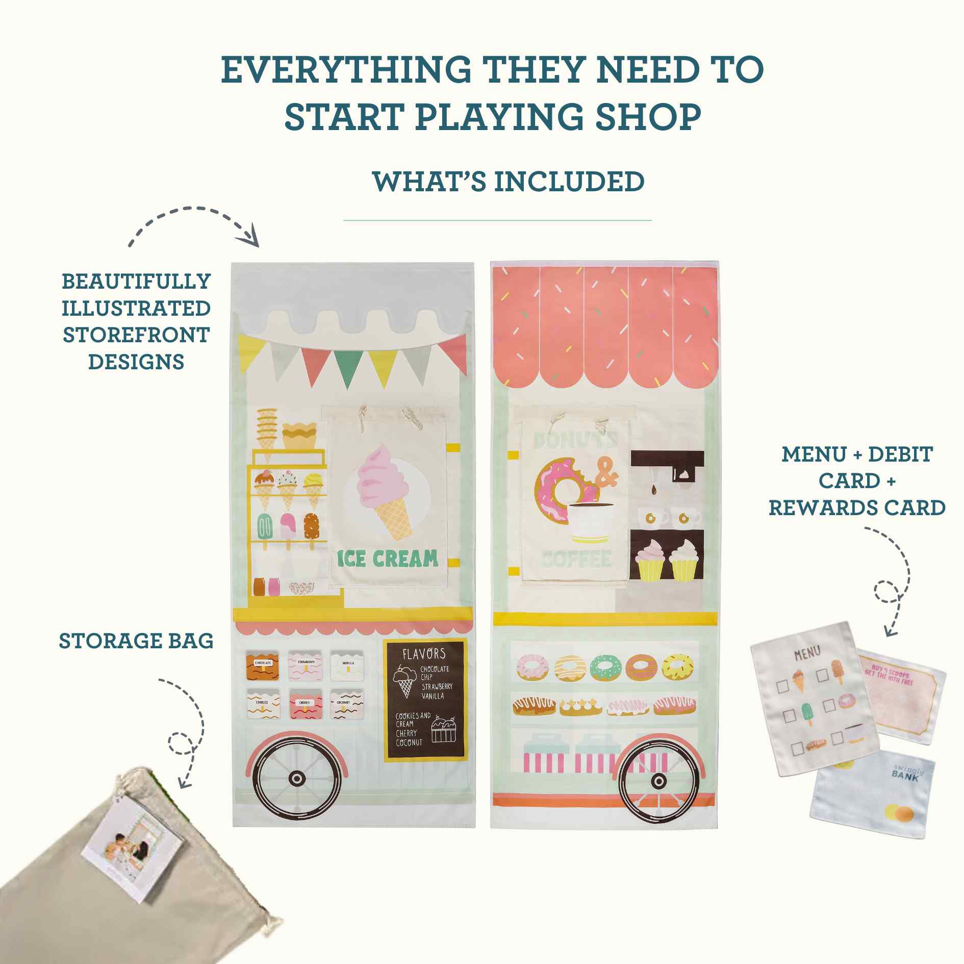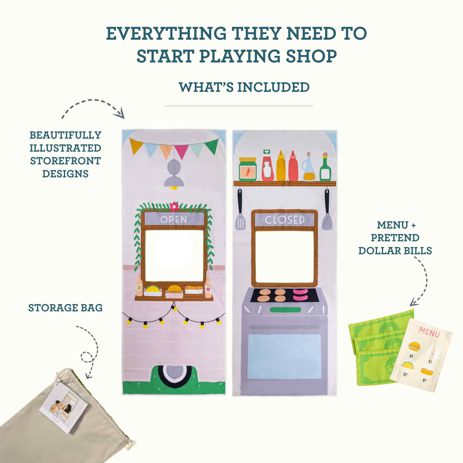 Step into a bustling world of small shops and big imaginations. This double-sided play shop transforms any doorway into a charming storefront—ideal for little shopkeepers ready to “open for business.”