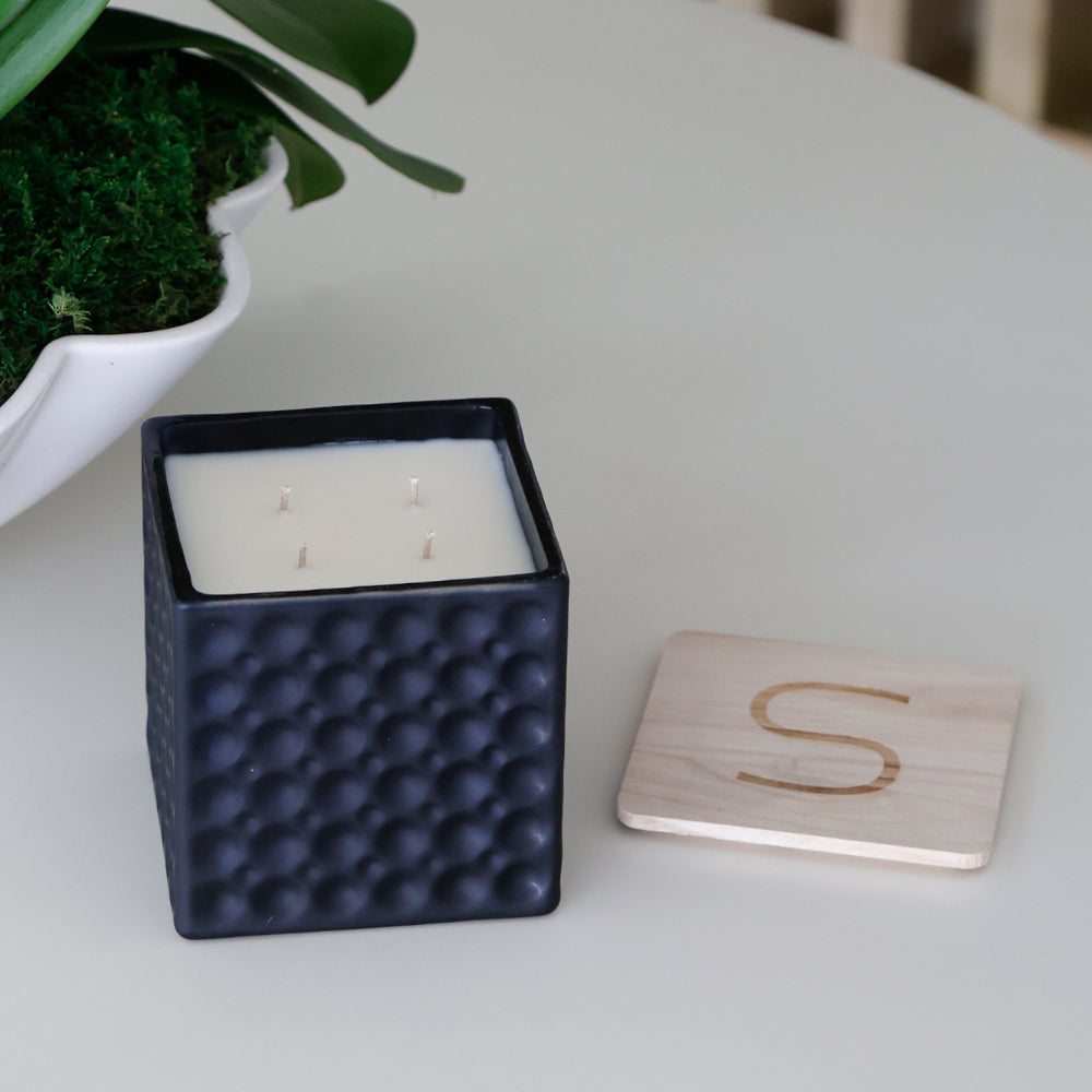 This elegant candle comes in a textured glass jar and includes a single monogram engraved on the wooden lid. The monogram is centered for a clean, timeless look, making this piece uniquely yours.
