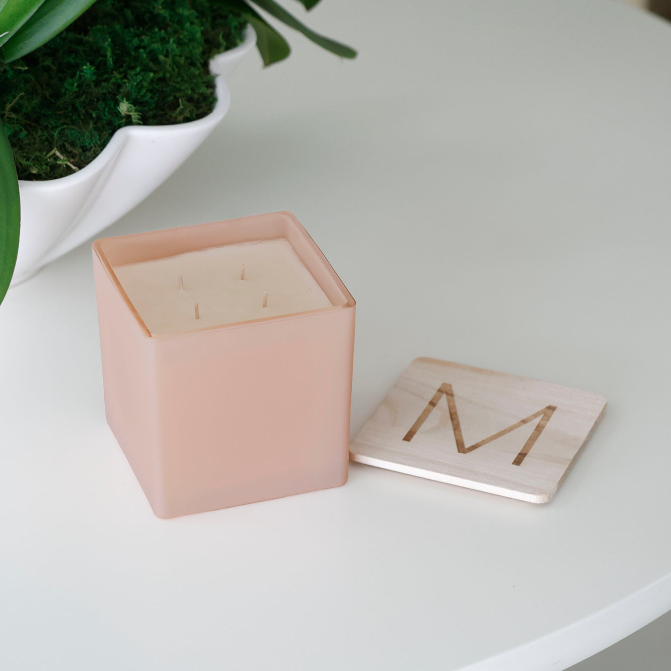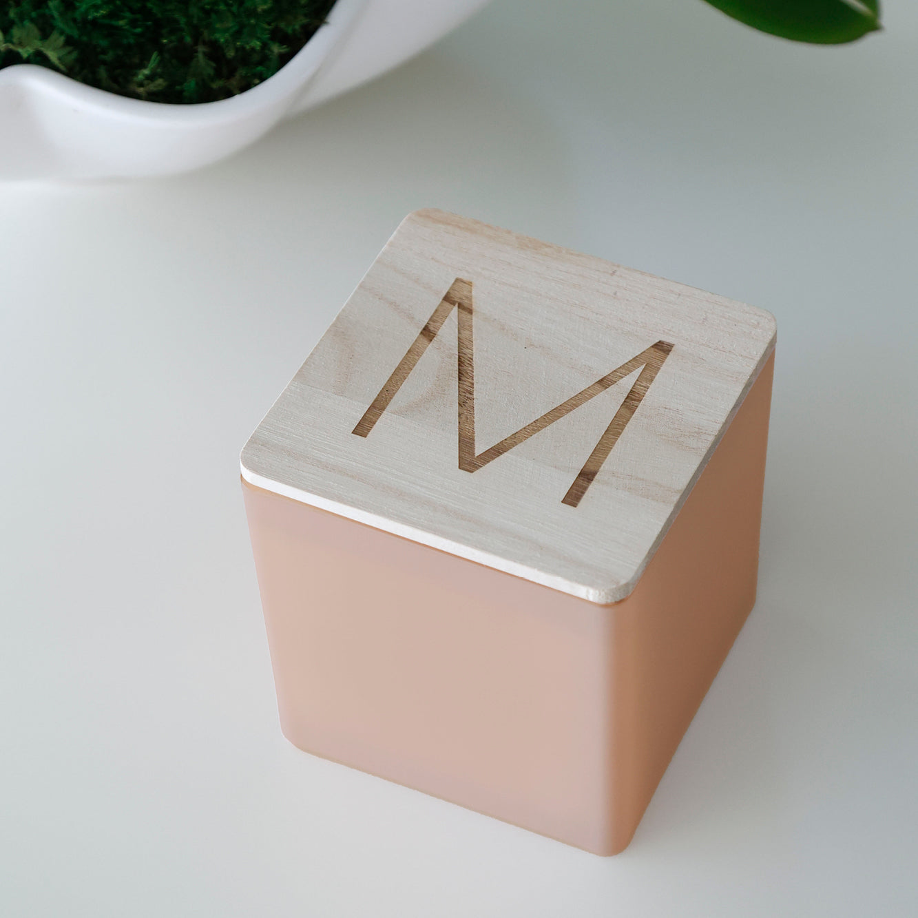 • Soft, blush-toned glass jar with a single monogram engraved on the outside of the wooden lid