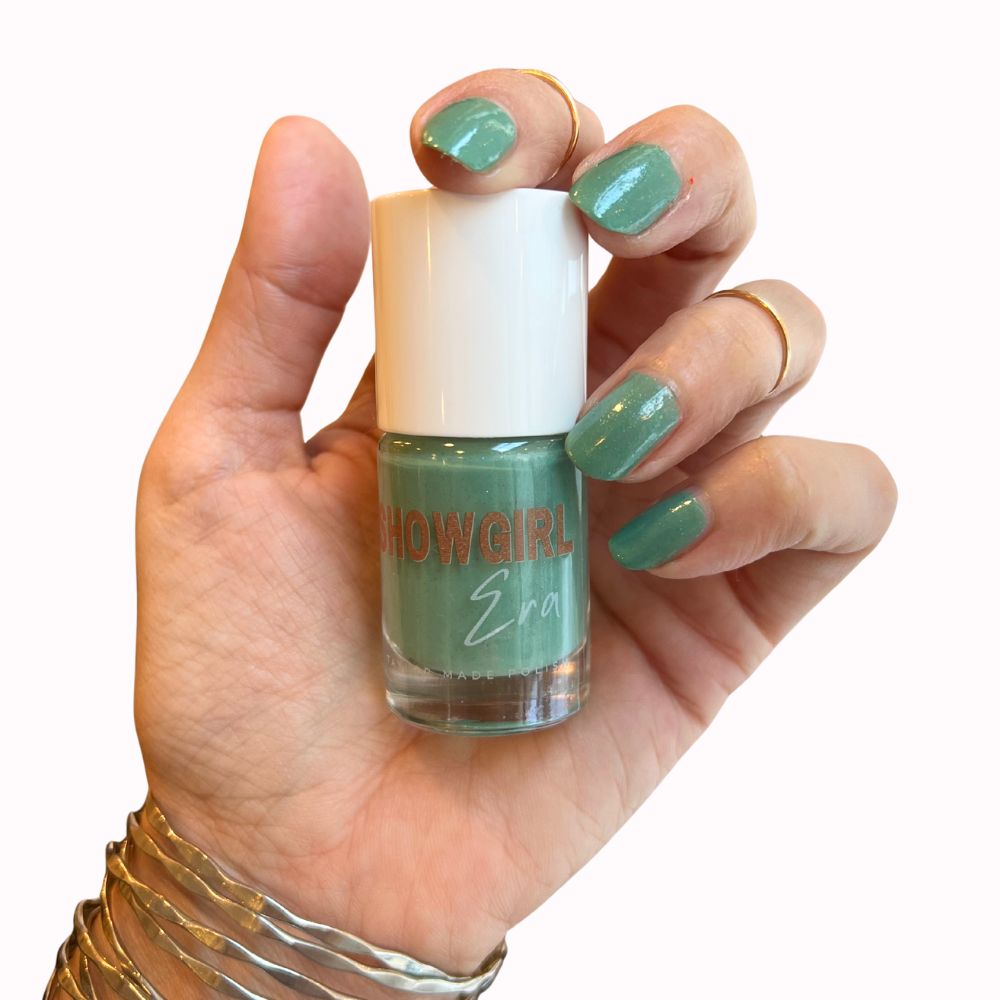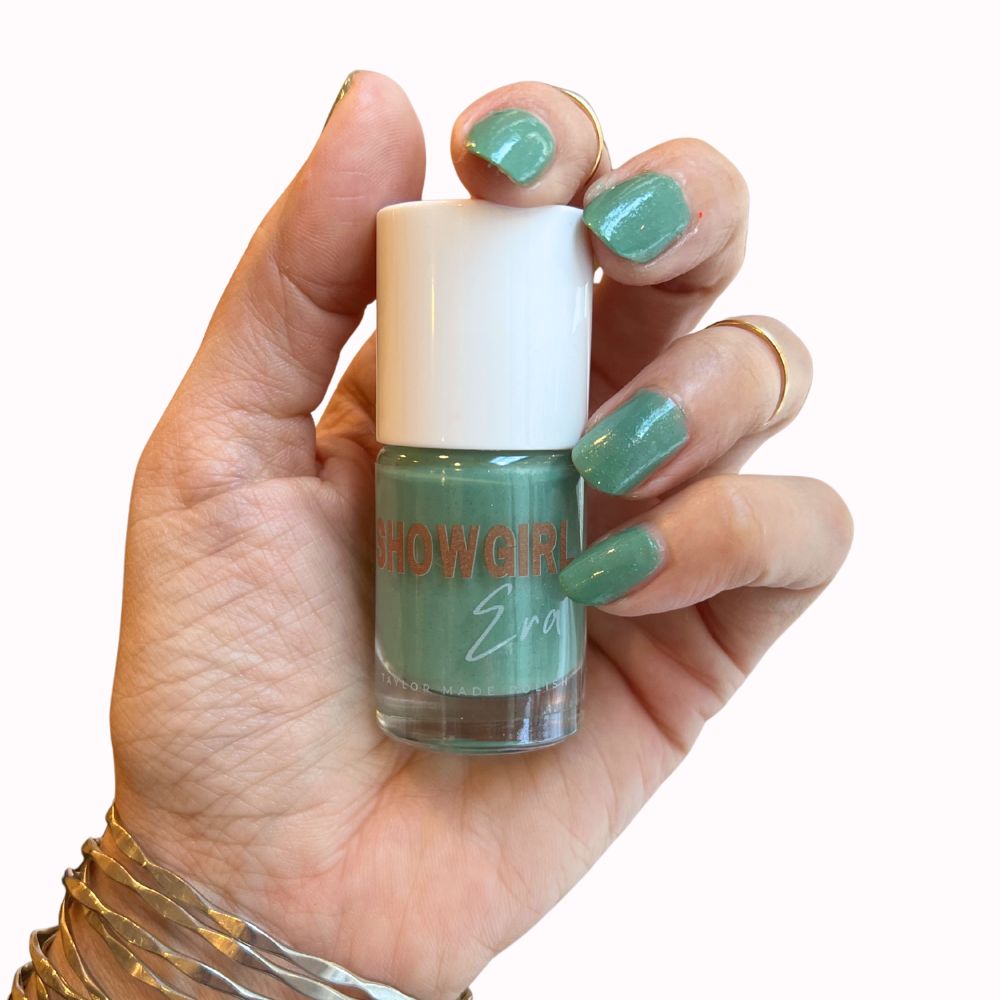 Green Glitter: Light green with glitter flakes, reminiscent of magical stage effects and the quiet anticipation before the spotlight hits. A long-wearing formula that wears best with a thick, one-coat application or two thin coats, depending on your style