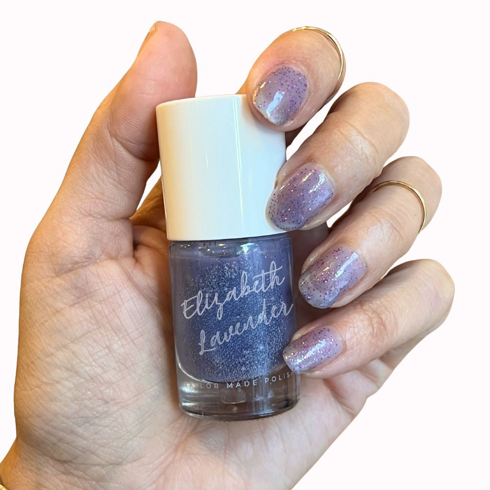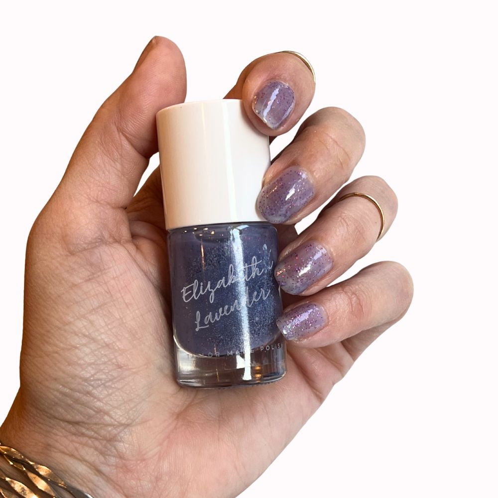 Lavender Sparkle: Lavender purple sprinkled with bold, dark fuchsia glitter. This formula performs beautifully as a glitter topcoat or on its own as a light purple, semi-sheer shade with glistening glitter