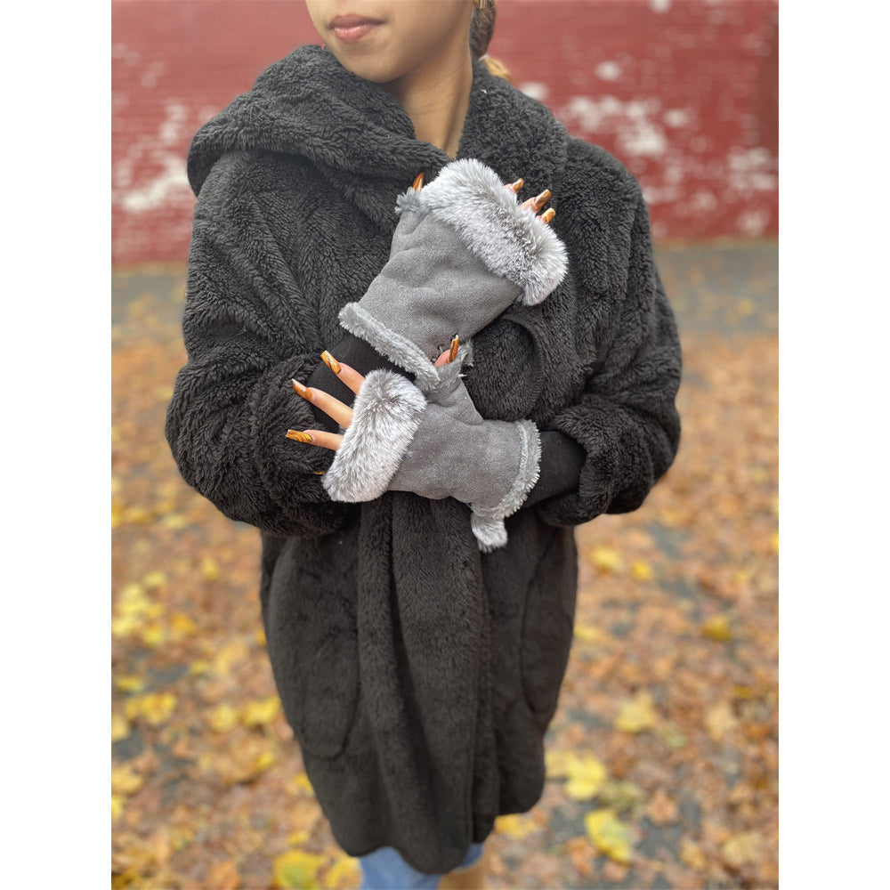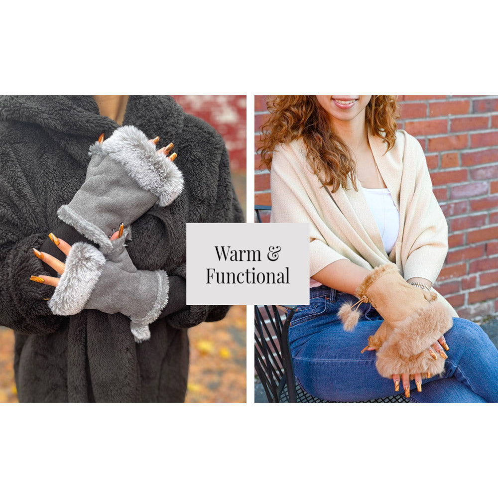 Stay stylish and warm all season long with these luxe faux suede fingerless gloves, trimmed in ultra-soft faux fur. Designed for cozy comfort and practical style, these gloves let your fingers stay free—ideal for texting, typing, or on-the-go errands. Featuring adjustable side laces for a custom fit and finished with playful faux fur pom-poms, these gloves add a charming touch to any cold-weather outfit.