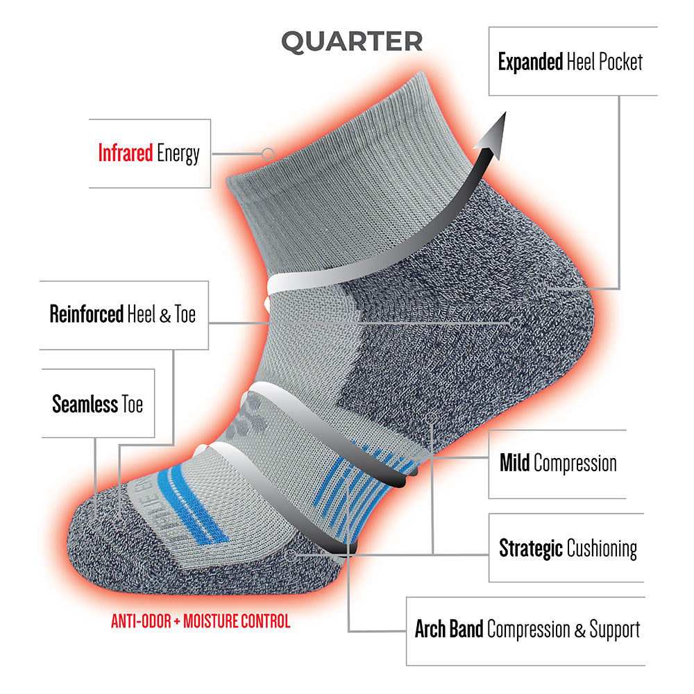 Experience the ideal balance of coverage and performance. These Athletic Quarter Socks sit just above the ankle bone to provide added protection and comfort. They harness the power of proprietary technology that combines the circulation and support benefits of targeted compression with the recovery power of infrared energy to help promote active recovery, improve performance, and increase energy levels.