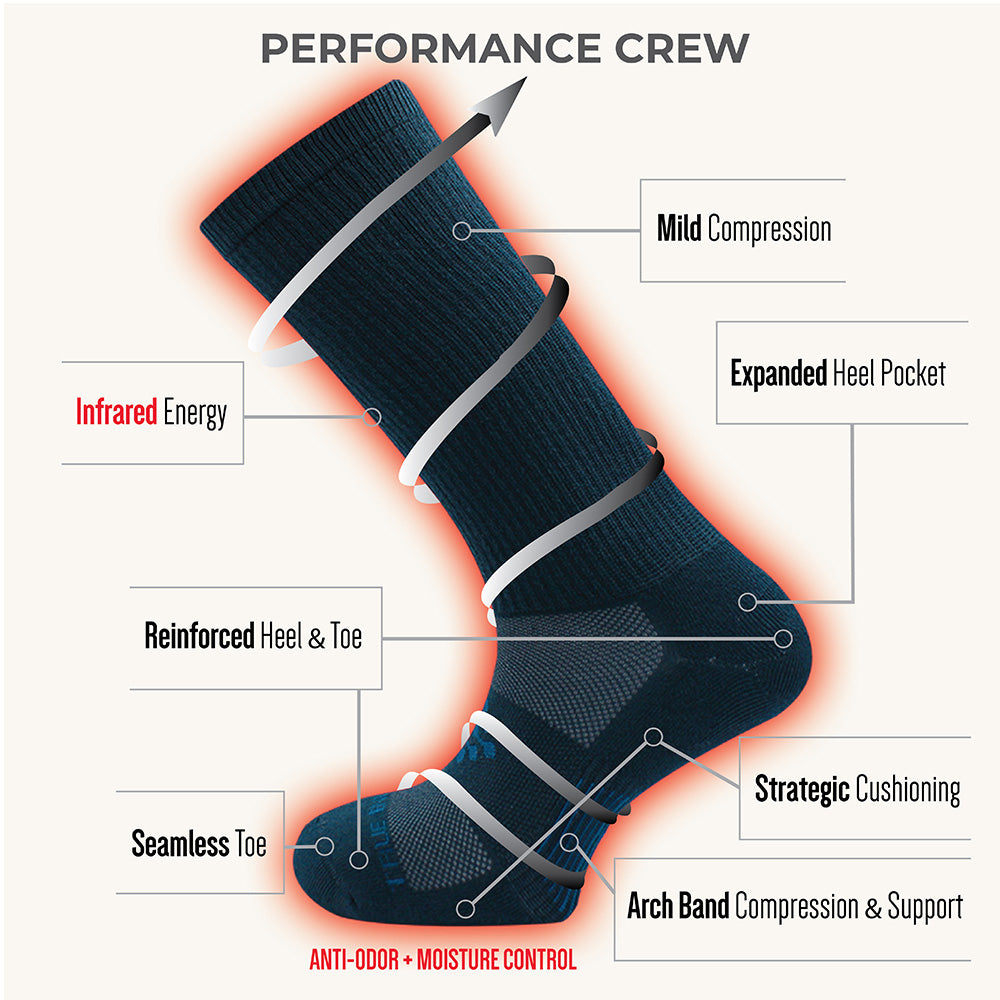 Bringing you the ideal combination of comfort and durability, these crew socks harness the power of proprietary technology that combines the circulation and support benefits of compression with the recovery power of infrared energy to help promote active recovery, improve performance, and increase energy levels.