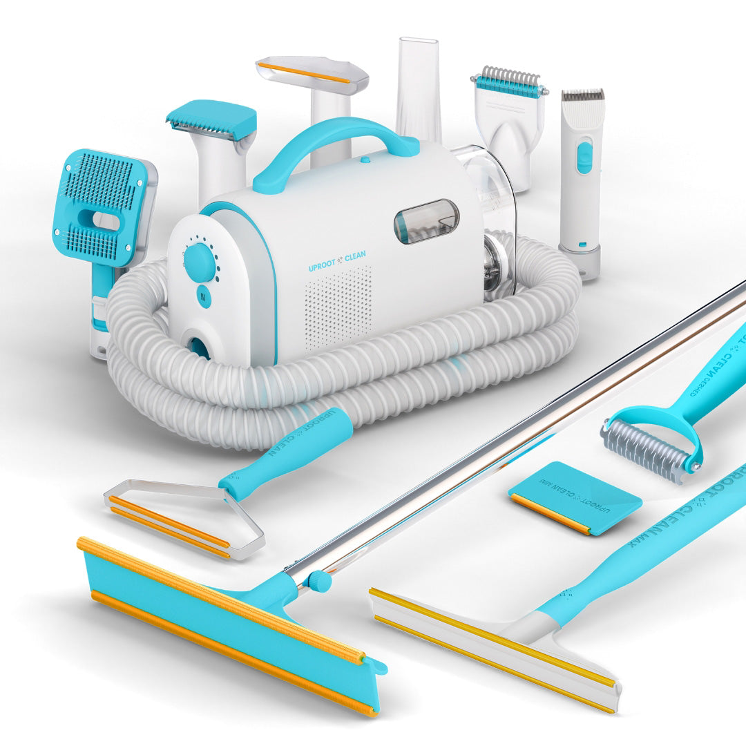 The Vacuum Powered Grooming Kit & Fur-pocalypse Bundle features a compact tool for hard-to-reach spots, an everyday tool for stubborn fur, a double-width handheld cleaner for larger areas, a double-width floor model cleaner for larger areas, a gentle yet effective deshedding rake for getting pet hair at the source, and a 7-in-1 Vacuum Powered Grooming Kit to give your pet a complete groom at home.