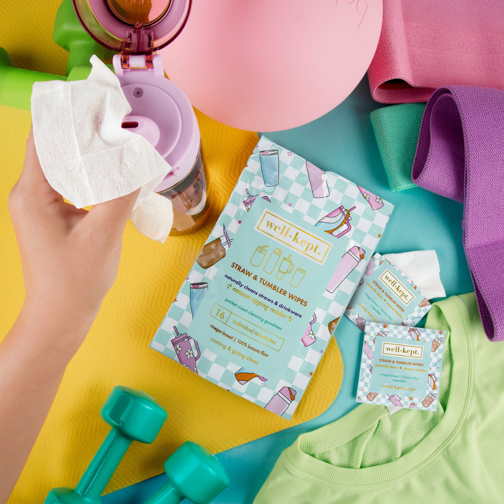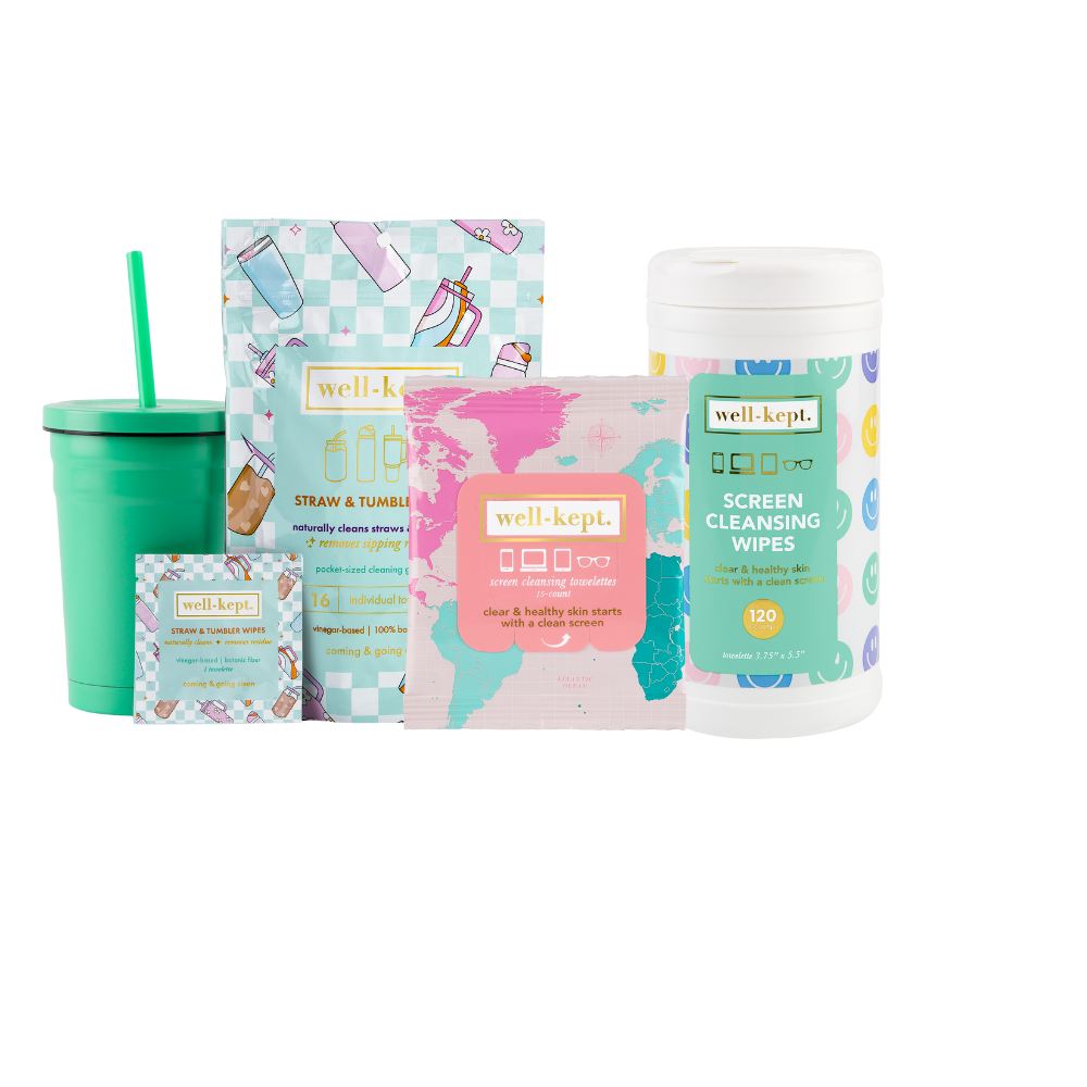 Sip clean, stay fresh. The Straw & Tumbler Wipes are made to keep your drinkware as fresh as your favorite sip—no sticky straws, no lingering lip gloss, no toddler germs. This bundle also includes screen and lens cleansing wipes, so you can clean your tech and glasses in style. Always have a quick clean on hand with a large canister of wipes, as well as individual packs.