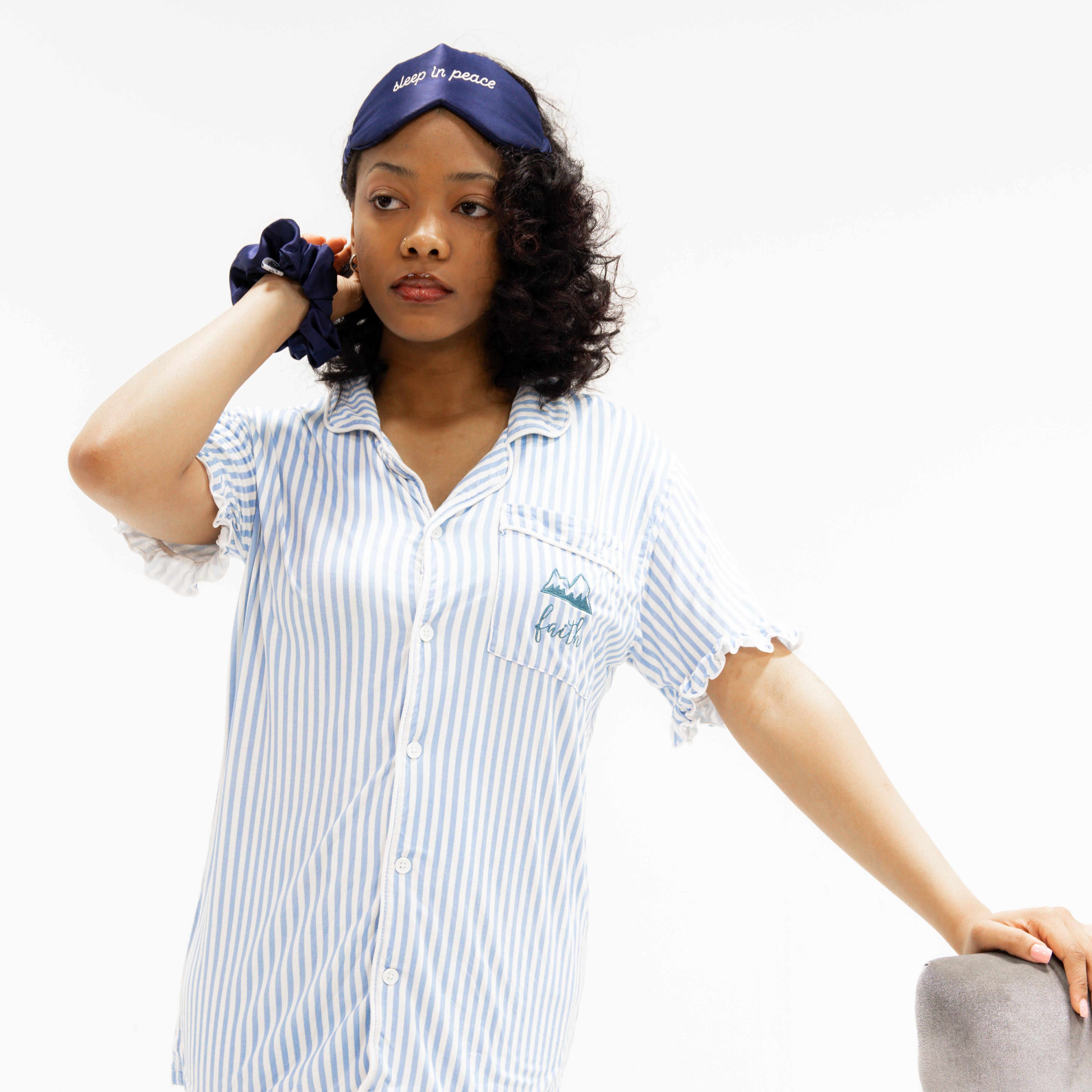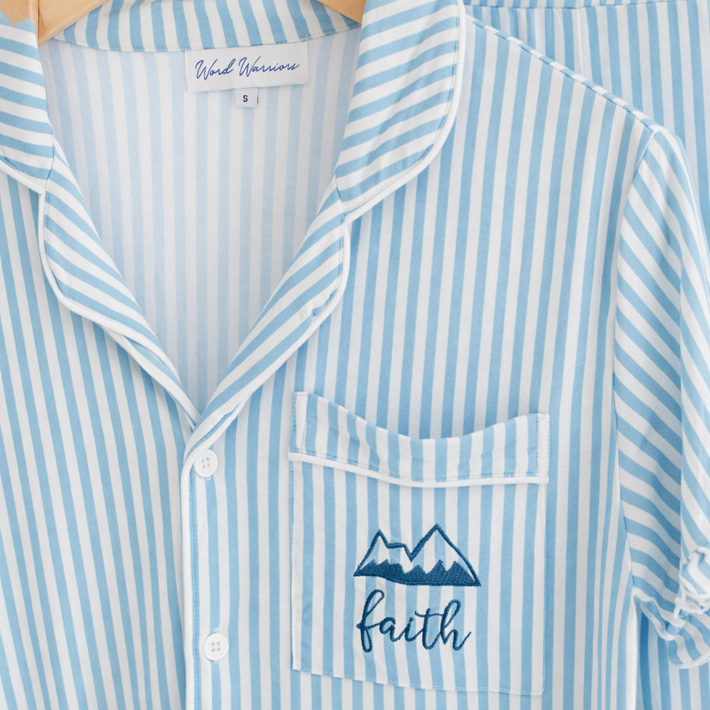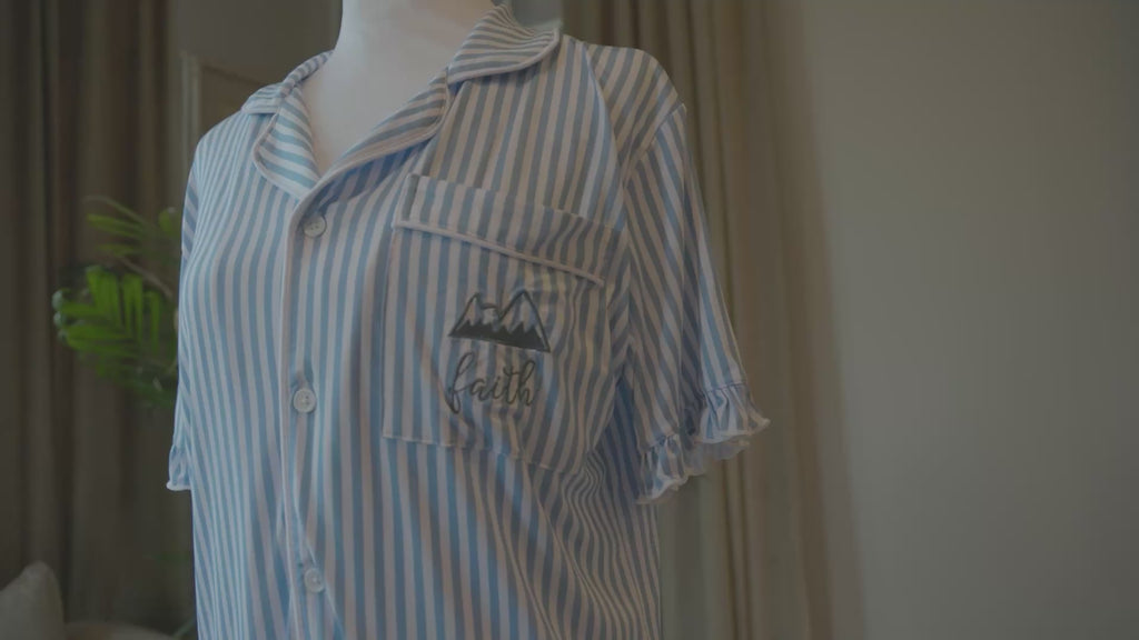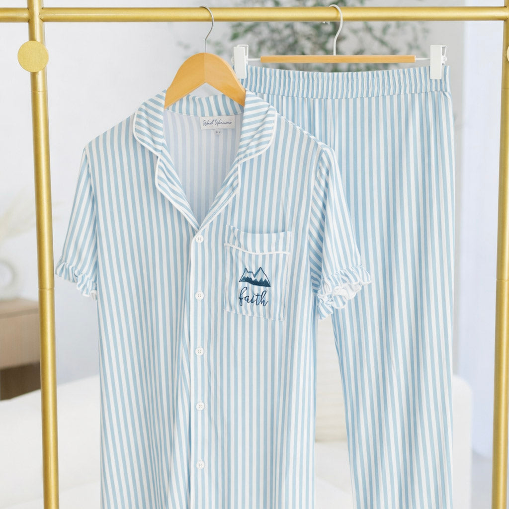 Wrap yourself in comfort and faith with the “Faith to Move Mountains” Blue Stripe Pajama Pants Set, crafted from luxuriously soft bamboo fabric. Designed for women who value cozy elegance and meaningful spiritual reminders, this set offers timeless style for restful nights and peaceful mornings. Delicate “faith” embroidery with a mountain detail serves as a gentle reminder that even the smallest faith can move mountains.