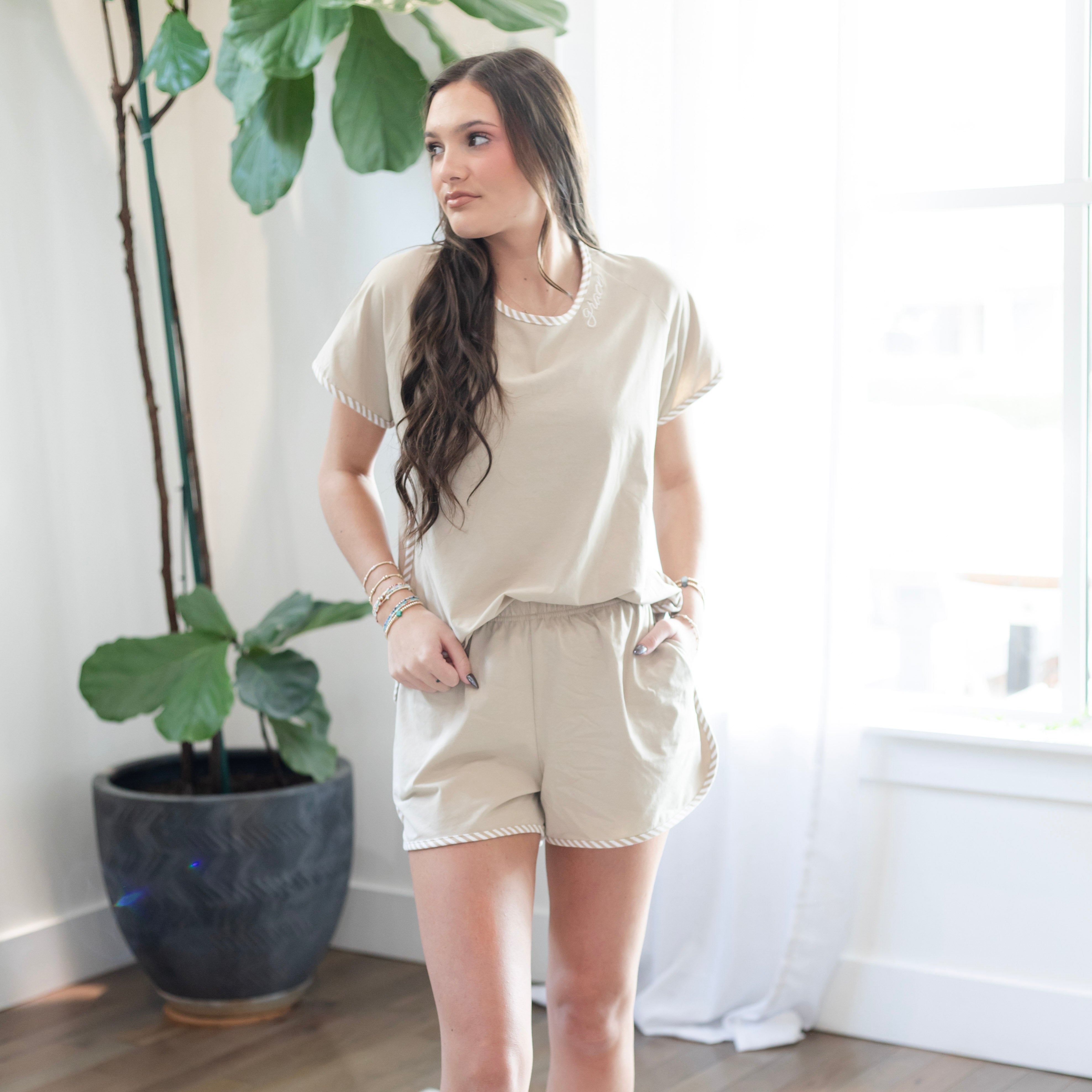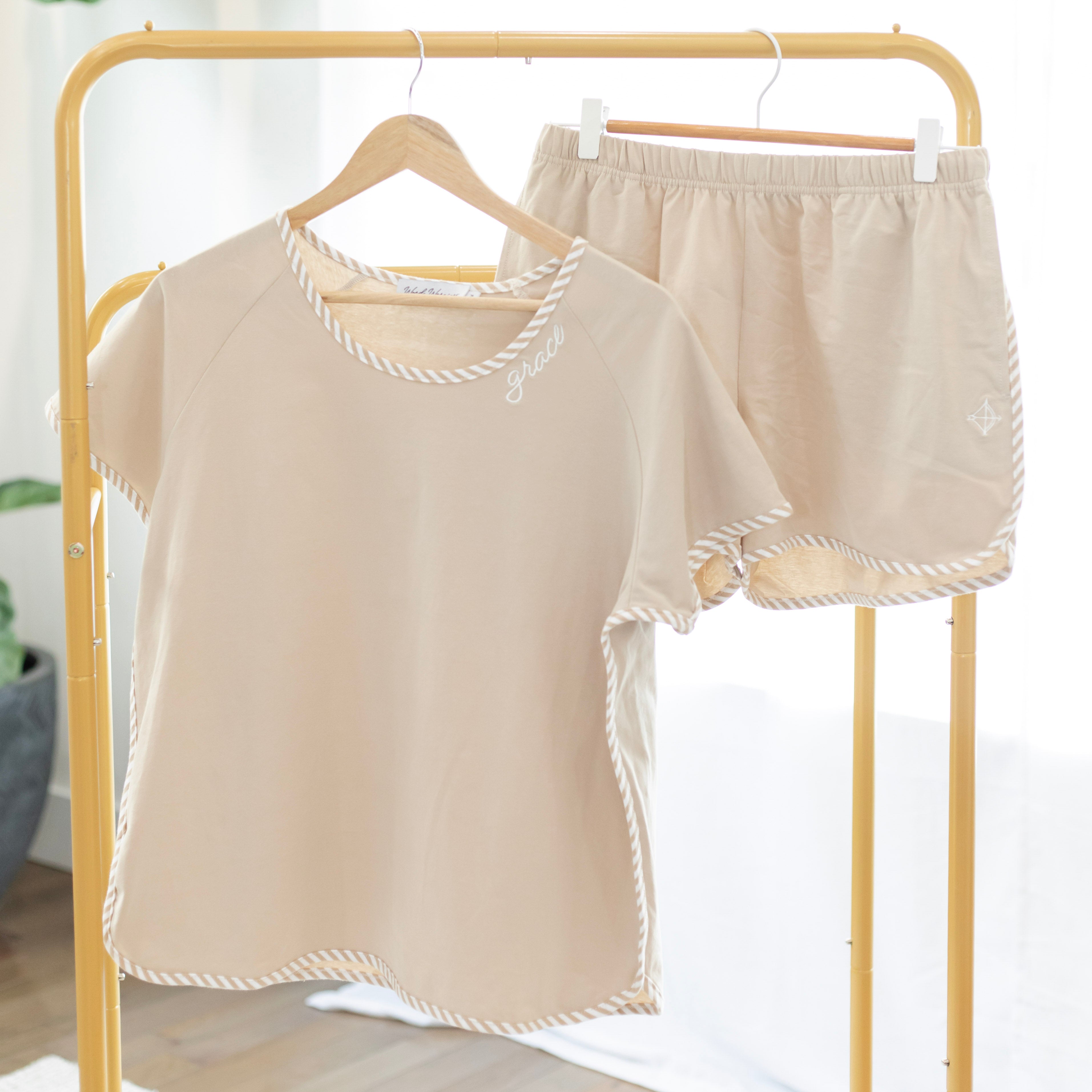 Rest in simplicity and comfort with the Women’s Tan Pajama Shorts Set, thoughtfully designed with classic striped piping and delicate “Grace” embroidery. Crafted from soft, breathable cotton, this set offers a blend of comfort and timeless style for evenings at home and slow mornings. The embroidered word “Grace” serves as a gentle reminder of God’s unmerited favor and abiding peace.