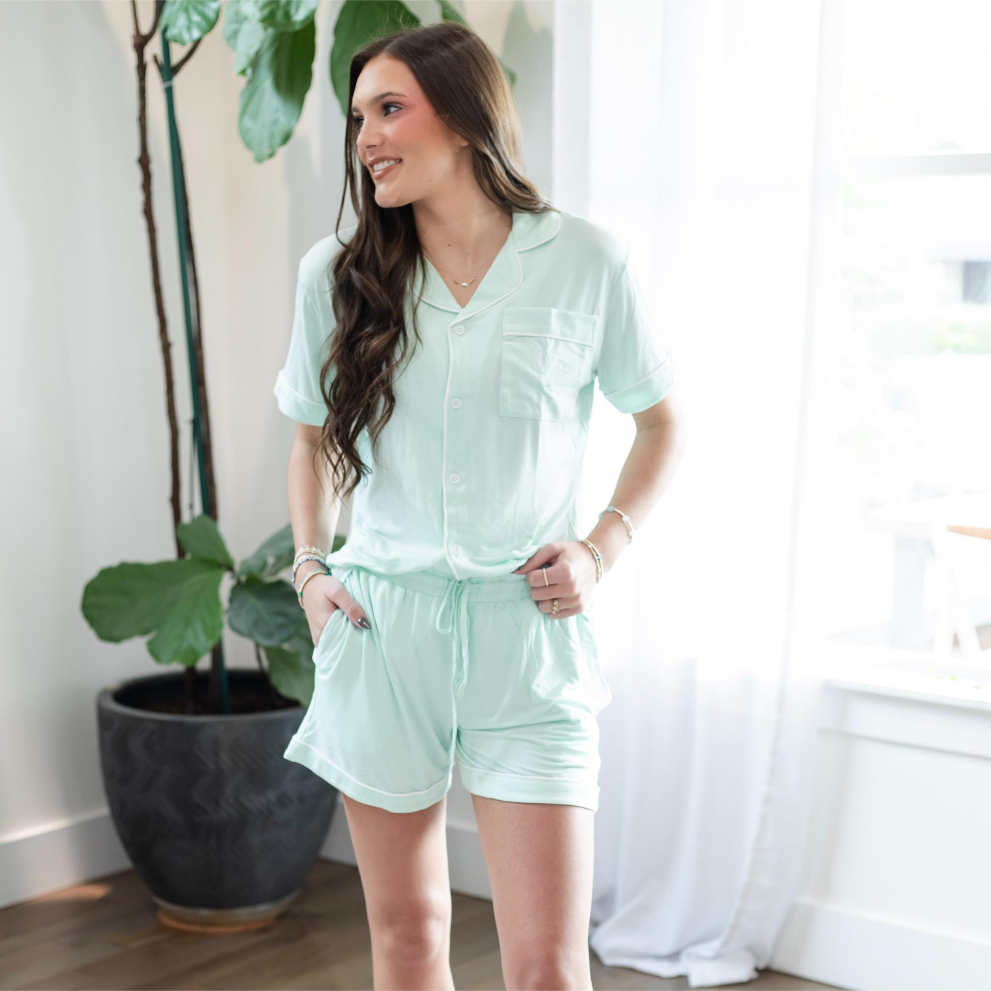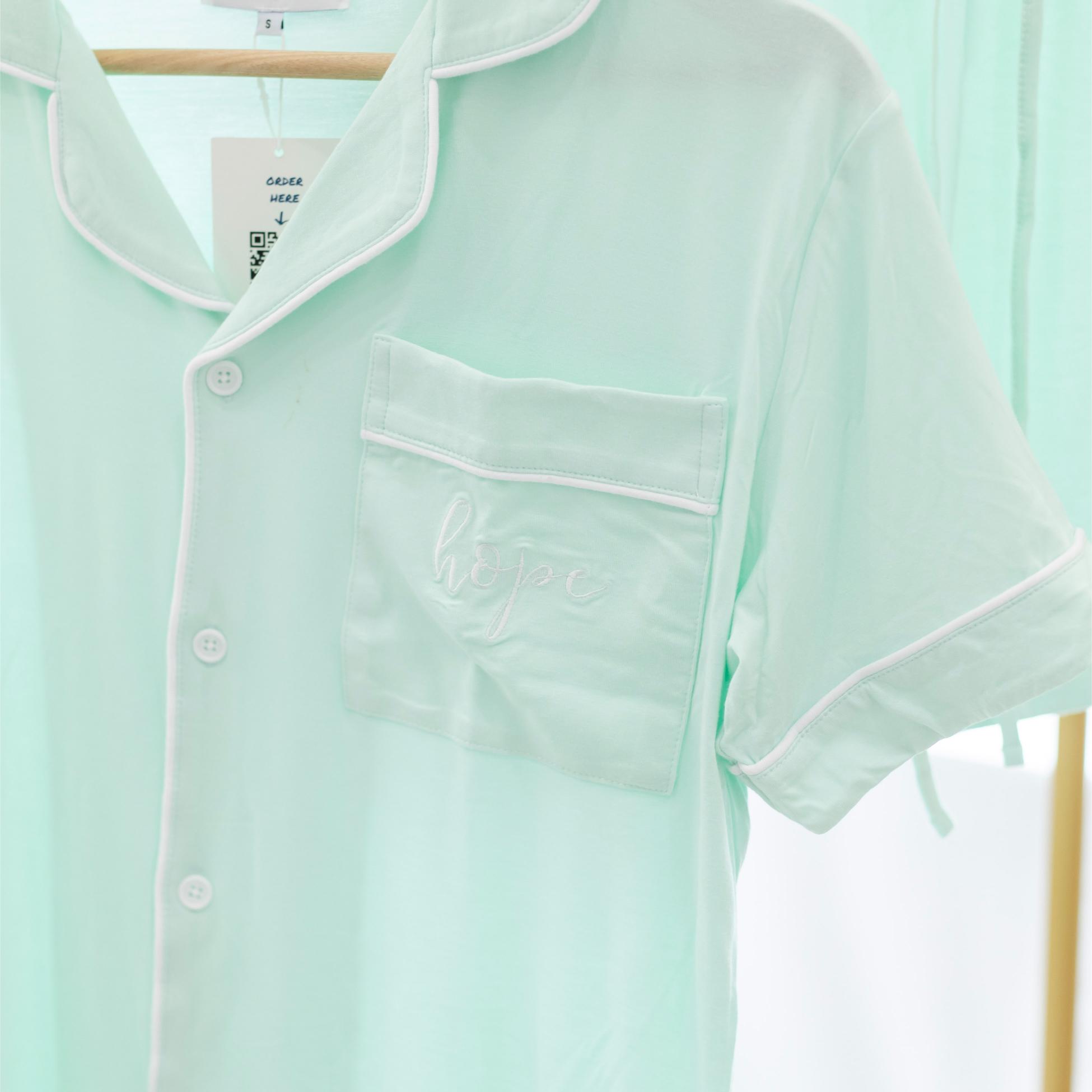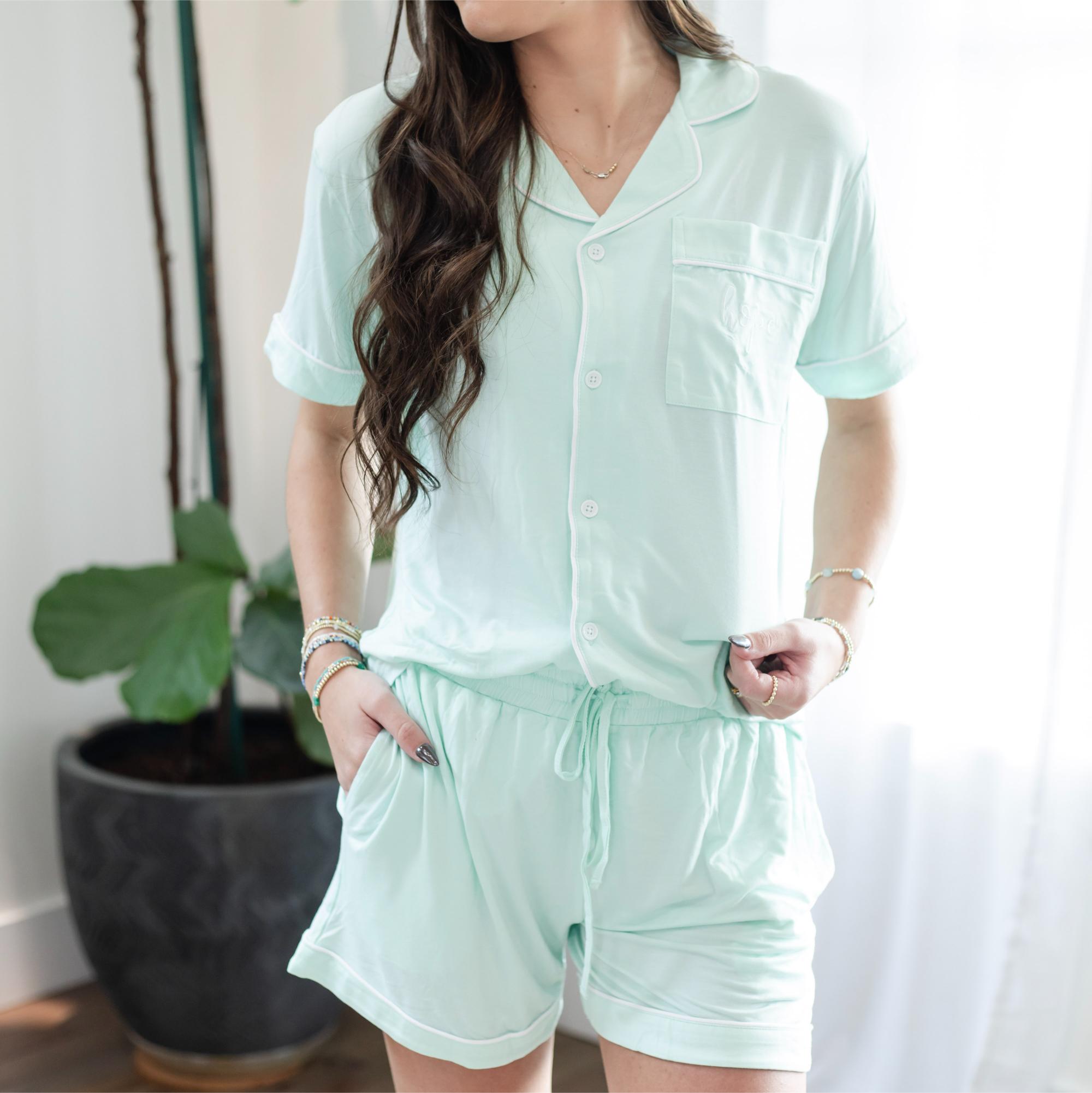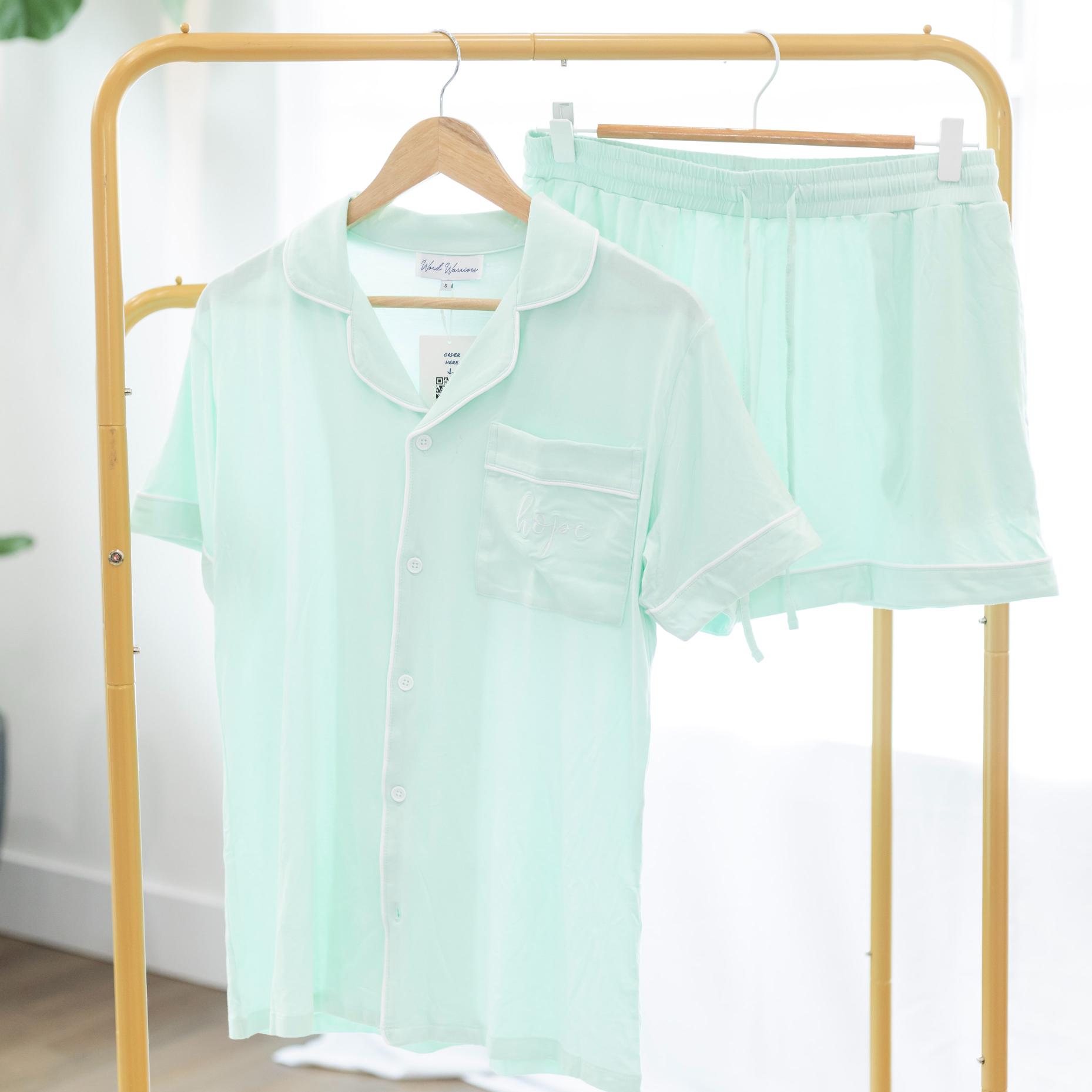 Unwind in comfort and encouragement with the “Hope” Embroidered Pajama Shorts Set in refreshing mint green. Designed for women who value cozy style and faith-filled details, this set blends breathable bamboo fabric with uplifting “Hope” embroidery. Ideal for restful nights and peaceful mornings.