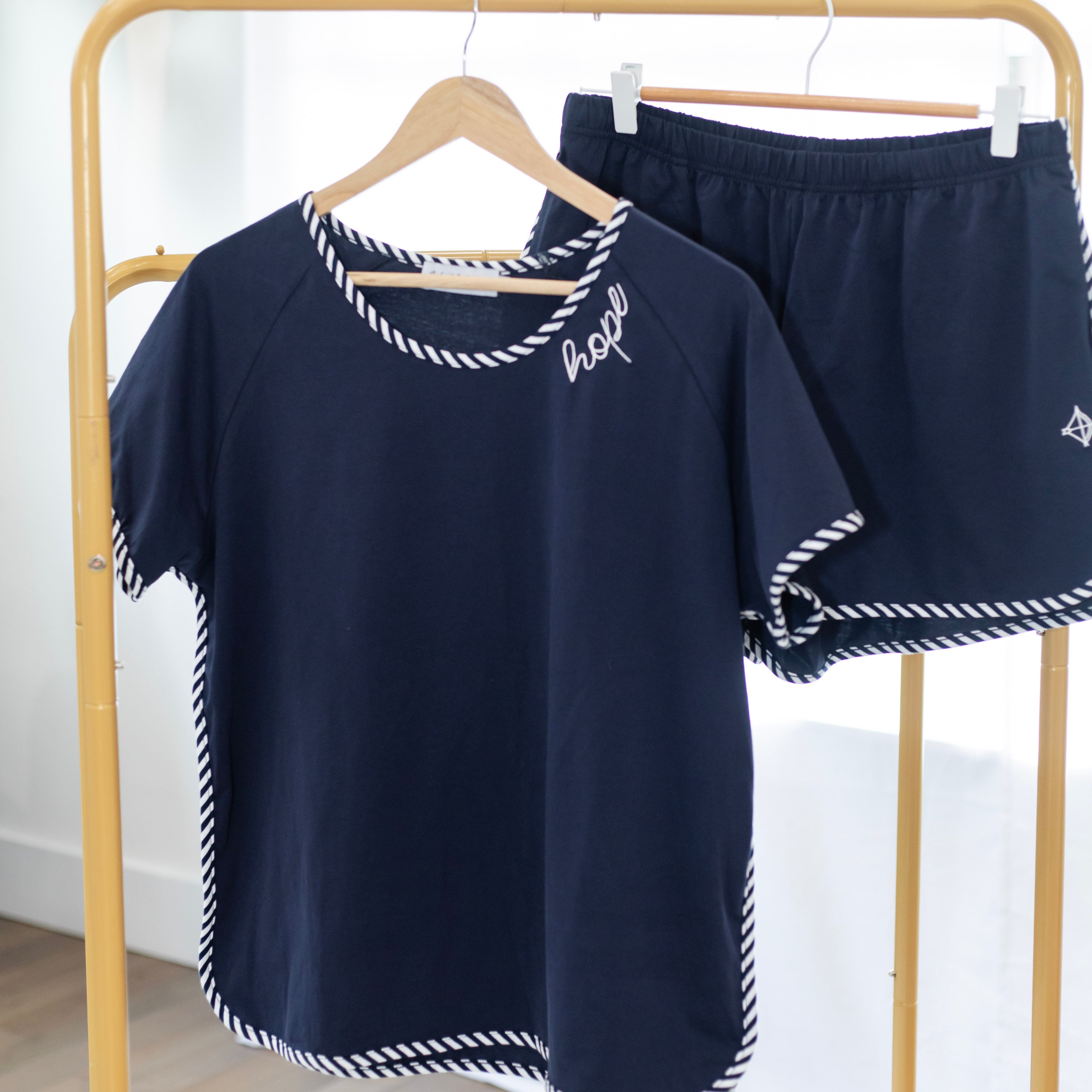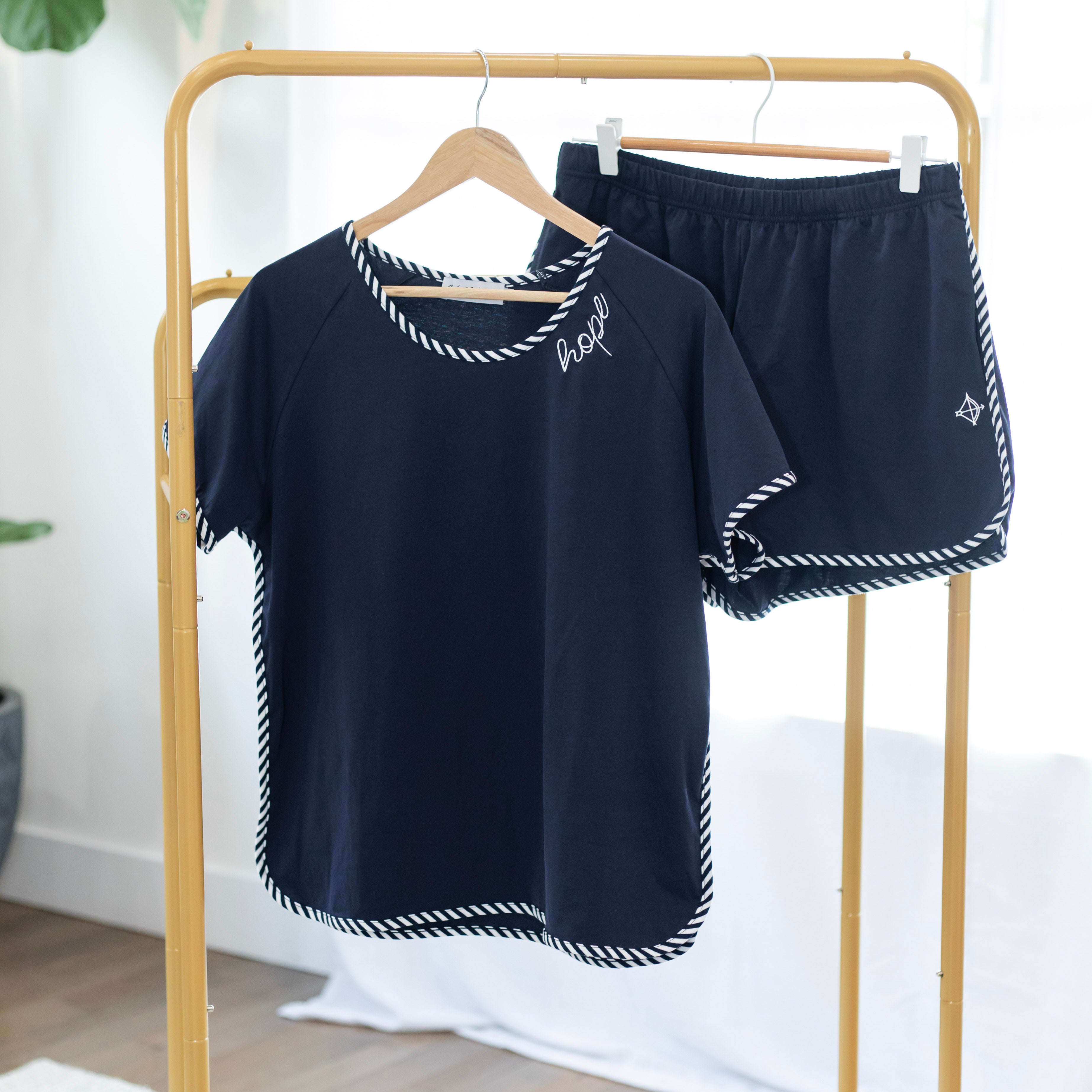 Find rest and encouragement in the Women’s Navy Pajama Shorts Set, designed with timeless striped piping and delicate “Hope” embroidery. Crafted from soft, breathable cotton, this set blends everyday comfort with classic style for restful nights and relaxed mornings. The embroidered word “Hope” serves as a gentle reminder to hold fast to the promises of God, even in life’s quieter moments.