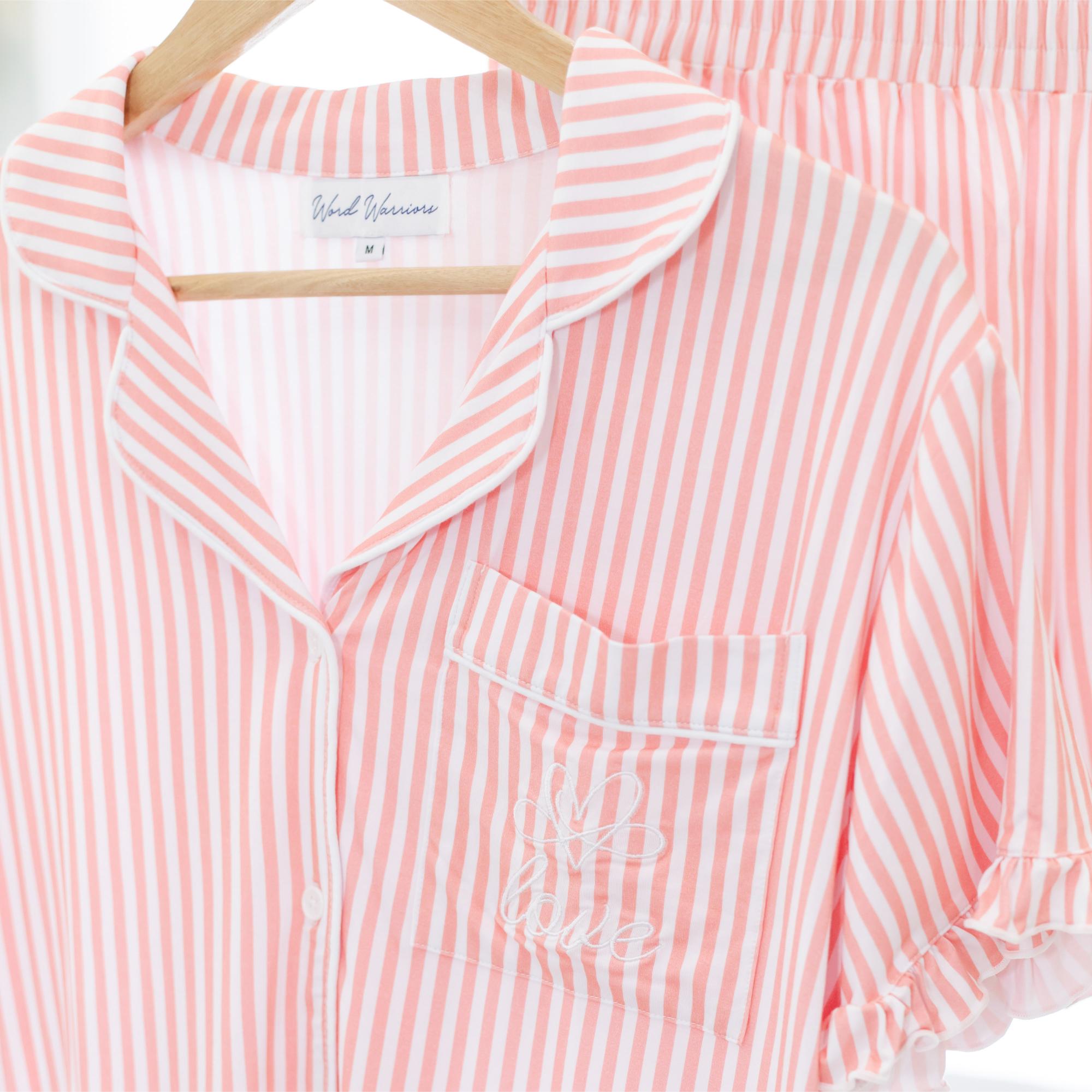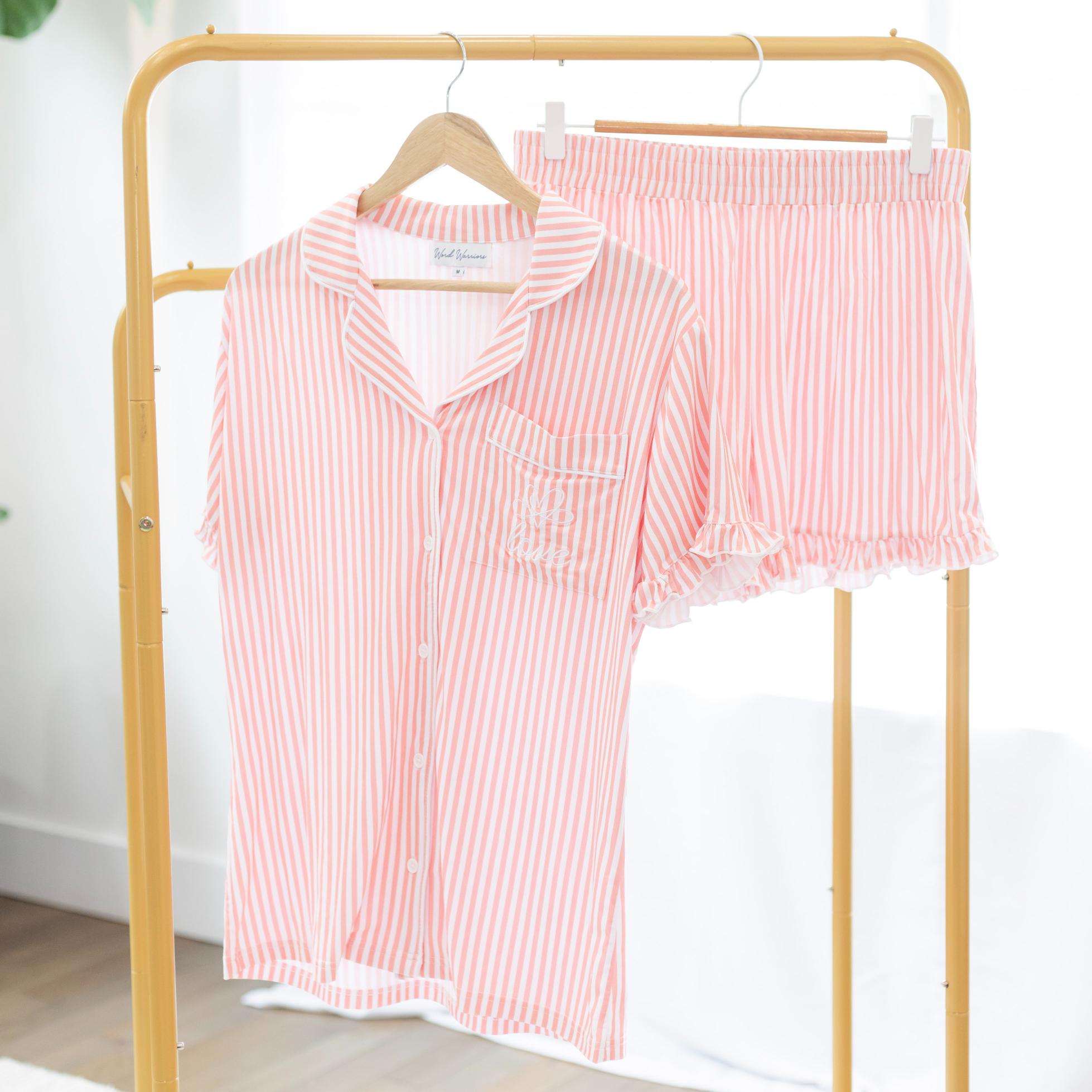 Wrap yourself in comfort and faith with the “Love” Pink Stripe Pajama Shorts Set, crafted from luxuriously soft bamboo fabric. Designed for women who value cozy elegance and gentle spiritual reminders, this set brings comfort to every night and slow morning. A delicate embroidered “love” serves as a meaningful reminder of God’s enduring love.