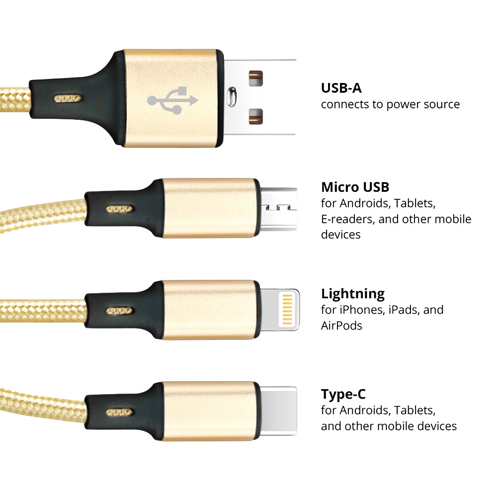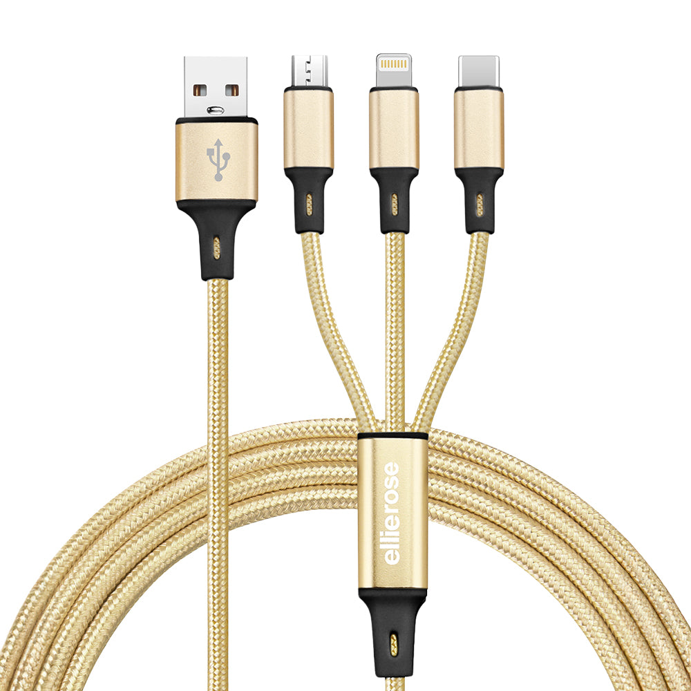 Introducing the 3-in-1 Charging Cable (USB-A), where everyday utility gets a glow-up. This durable, tangle-resistant cable features three connectors in one sleek gold design, so you can charge multiple types of devices with a single, stylish cable.