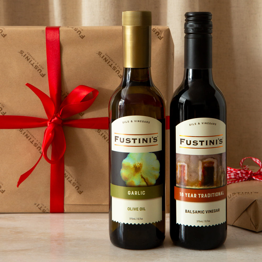 A beautifully paired iconic duo: Garlic Olive Oil and signature 18-Year Balsamic Vinegar. Ideal for dipping, drizzling, marinating, and dressing—this set embodies the Fustini’s magic that started it all.