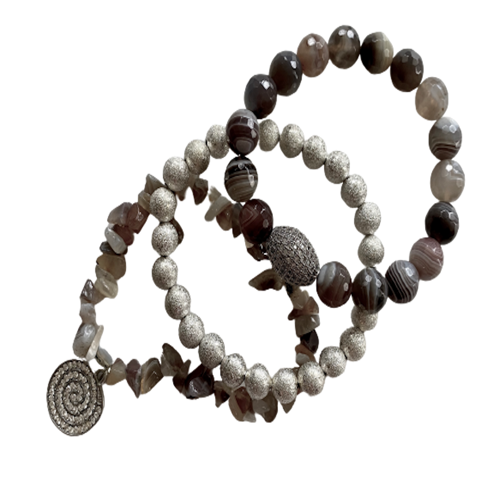 • Genuine Botswana agate and silver-plated copper beads, 8–12 mm each