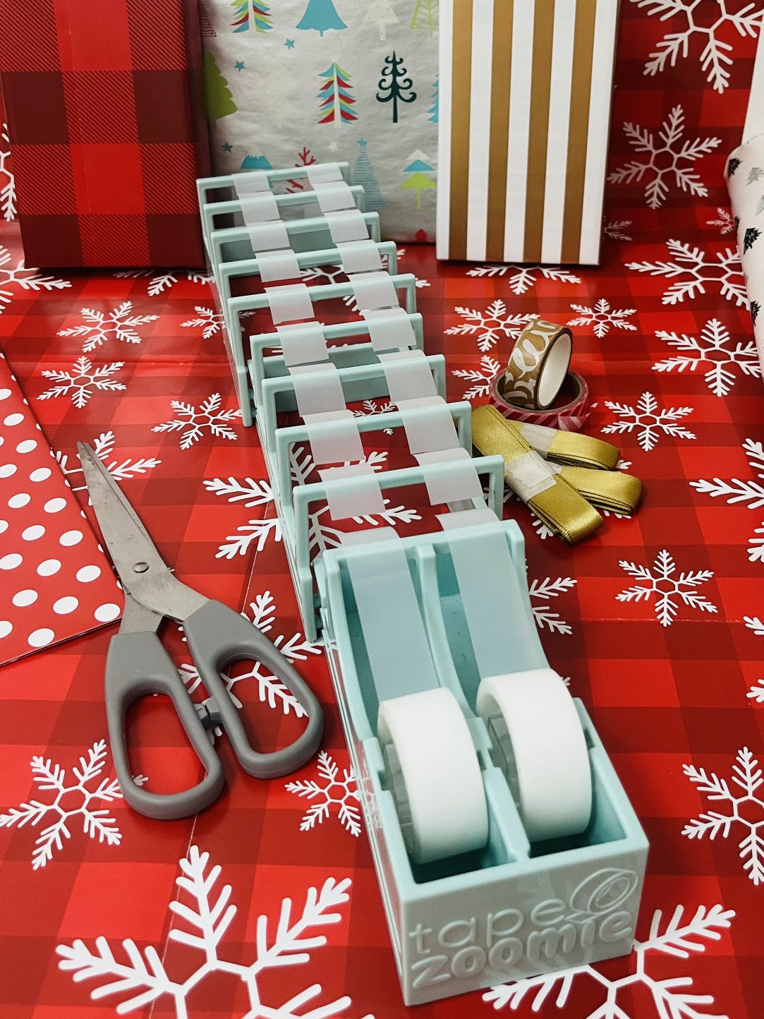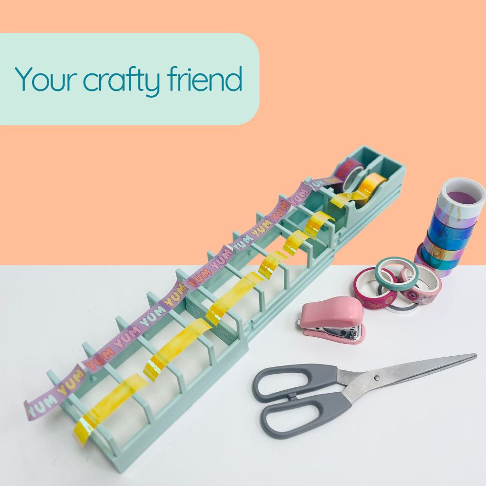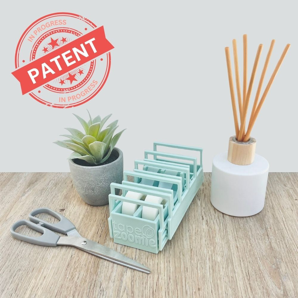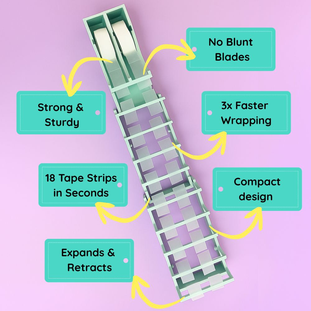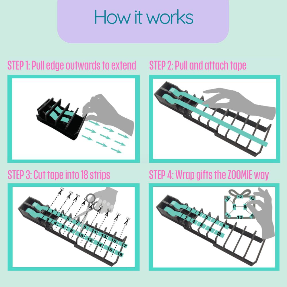 Tape Zoomie® is a patent-pending, blade-free, extendable tape dispenser that lets you prepare 18 customizable tape strips in seconds. It’s the fastest, most satisfying way to prepare tape strips, ideal for gift wrapping, crafting, and packing orders.