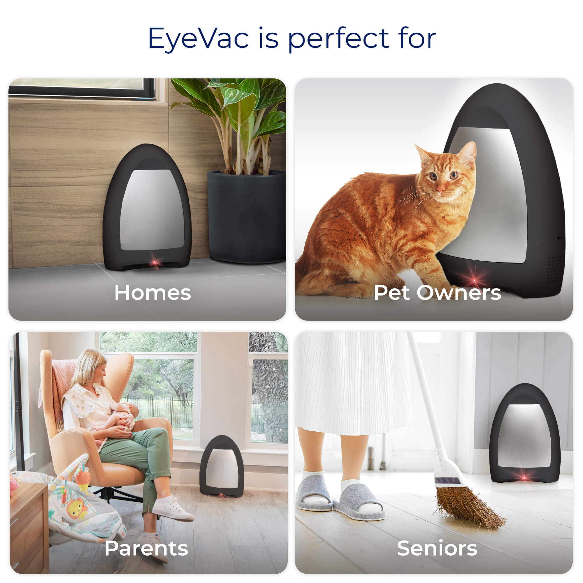 Just sweep up the mess and watch EyeVac do the rest! EyeVac’s infrared sensors automatically activate the vacuum when sweeping near the unit, removing all dirt and debris so you don’t have to struggle with a dustpan. Ideal for parents, pet owners, seniors, and more.