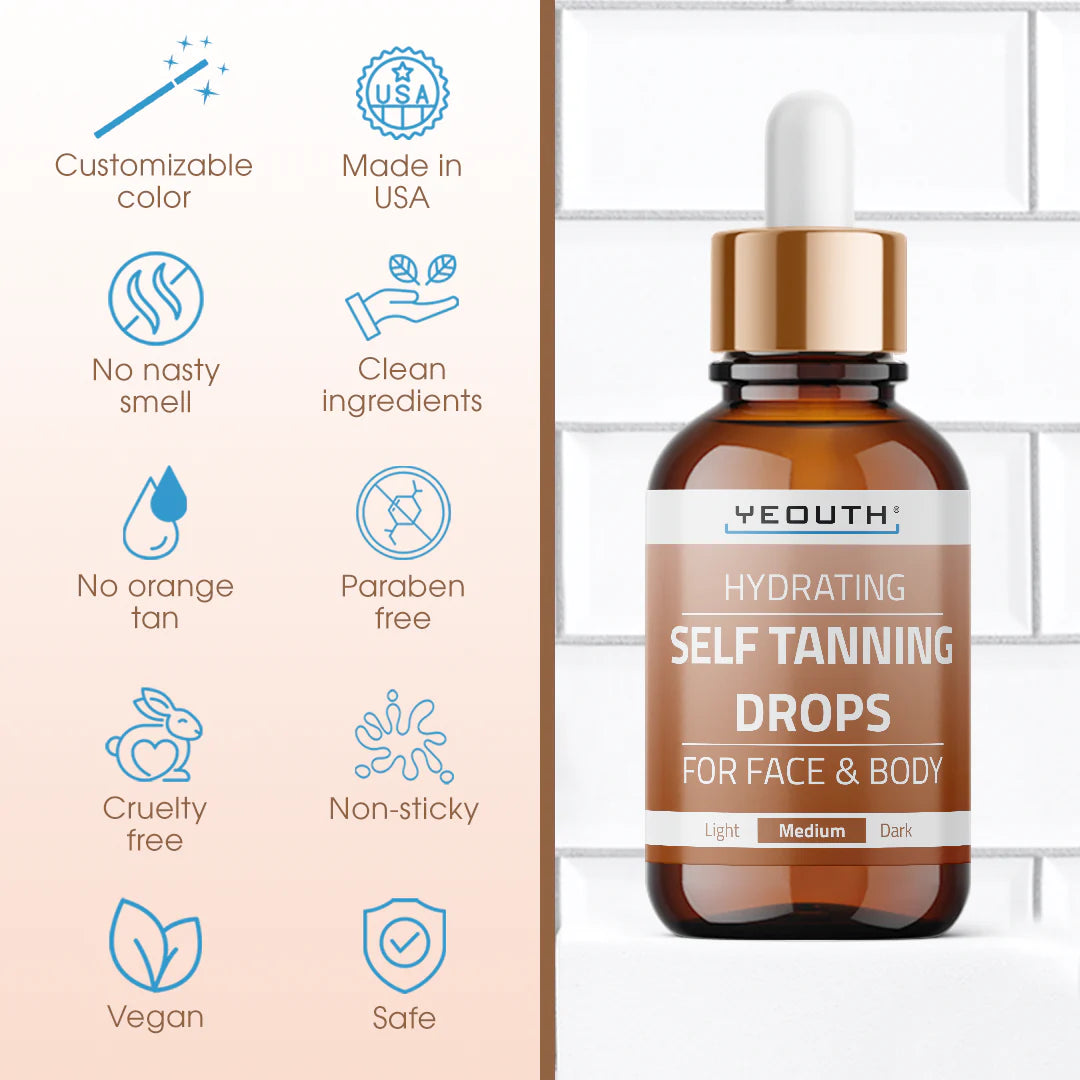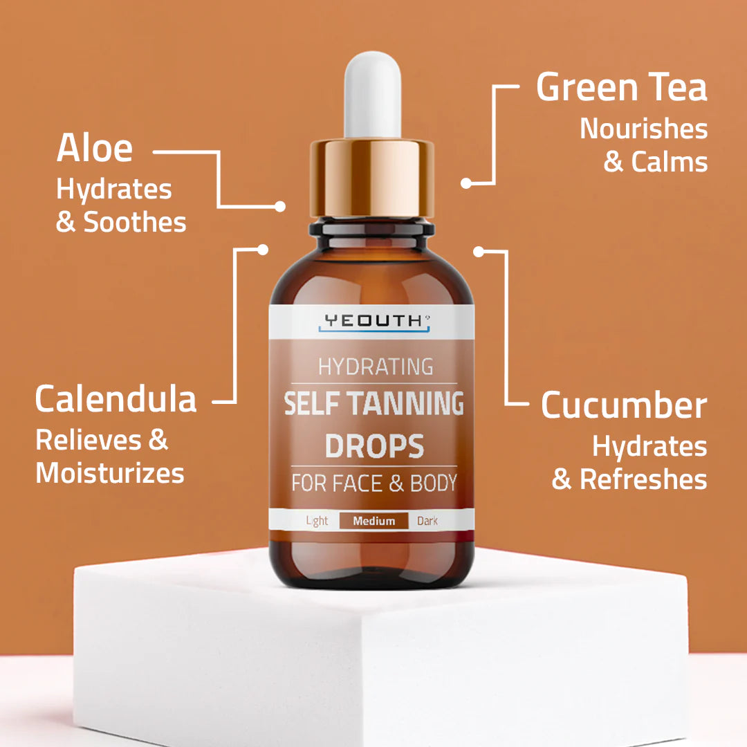 Achieve a radiant, sun-kissed glow without UV exposure. These self-tanning drops for the face and body are designed to provide an even tan while enhancing your skin's appearance. By incorporating key ingredients like calendula to promote a radiant complexion, green tea to help brighten the skin, and cucumber to hydrate, these drops are formulated to deliver a beautiful tan and help nourish and revitalize the skin.