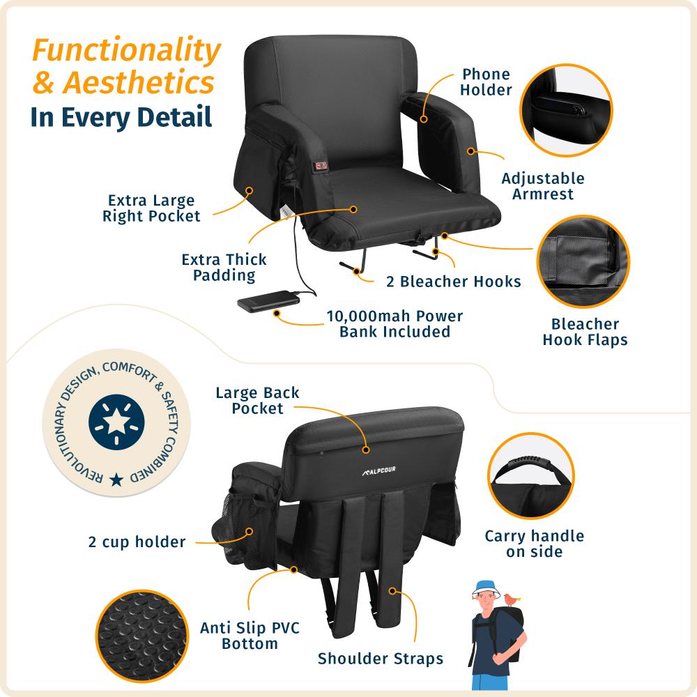 A premium reclining stadium chair that combines adjustable heat, soothing vibration, and supportive padding with fold‑down armrests and generous storage. Added safety points help keep the seat stable on busy bleachers and during long events.