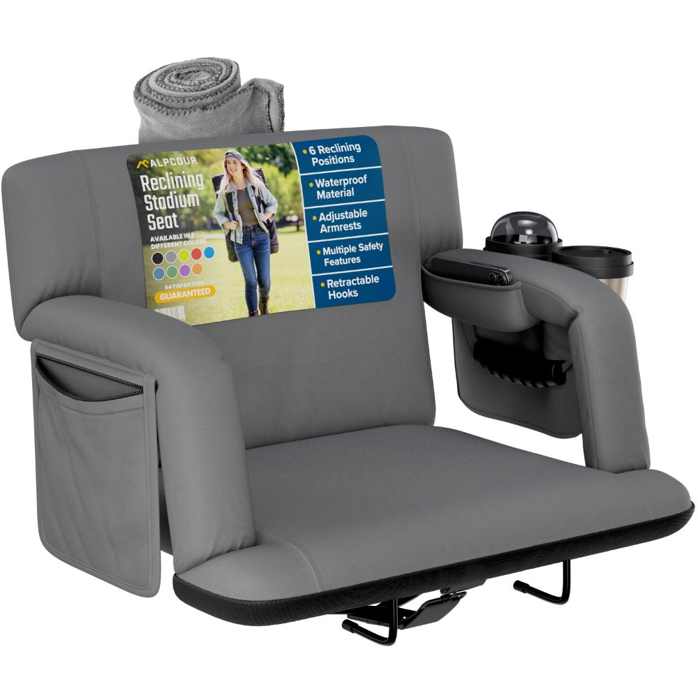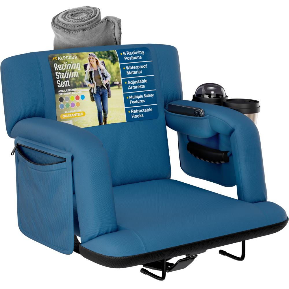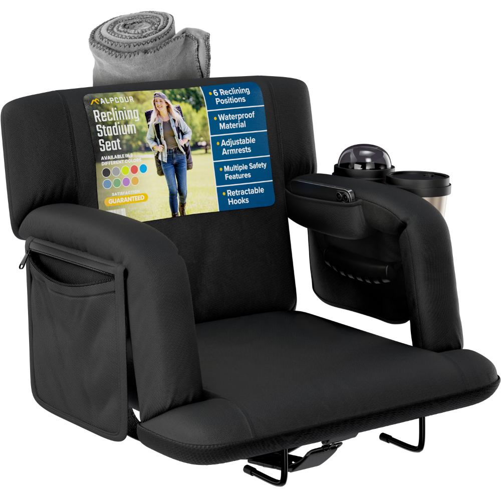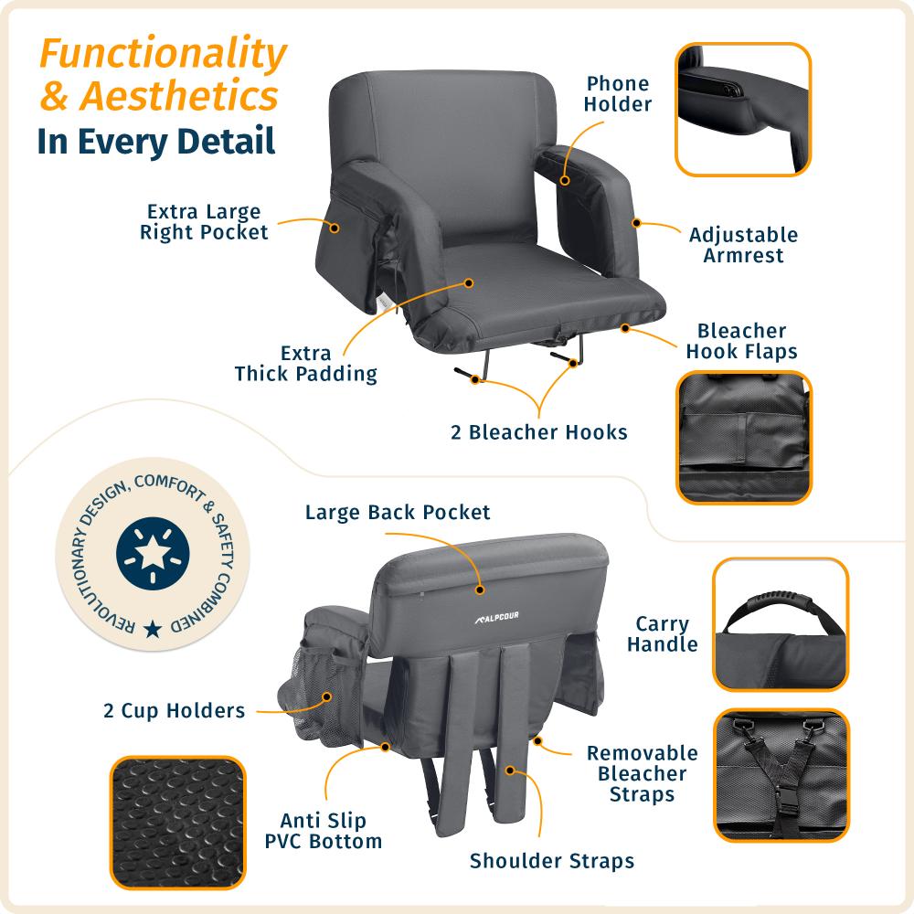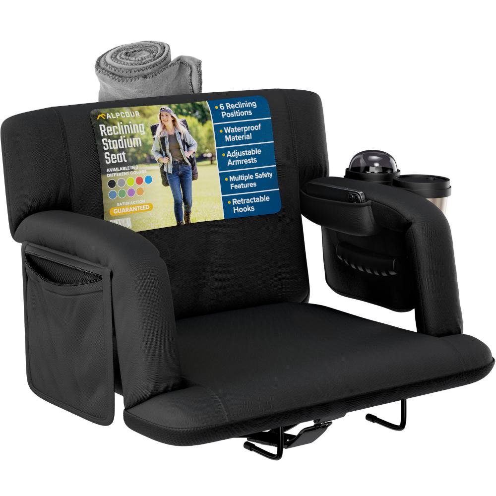An upgraded reclining stadium chair built for long-game comfort and secure bleacher use. Supportive cushioning and fold-down armrests let you enjoy game-day comfort, while multiple storage pockets keep your essentials organized. Added safety features help the seat stay put on busy game days.